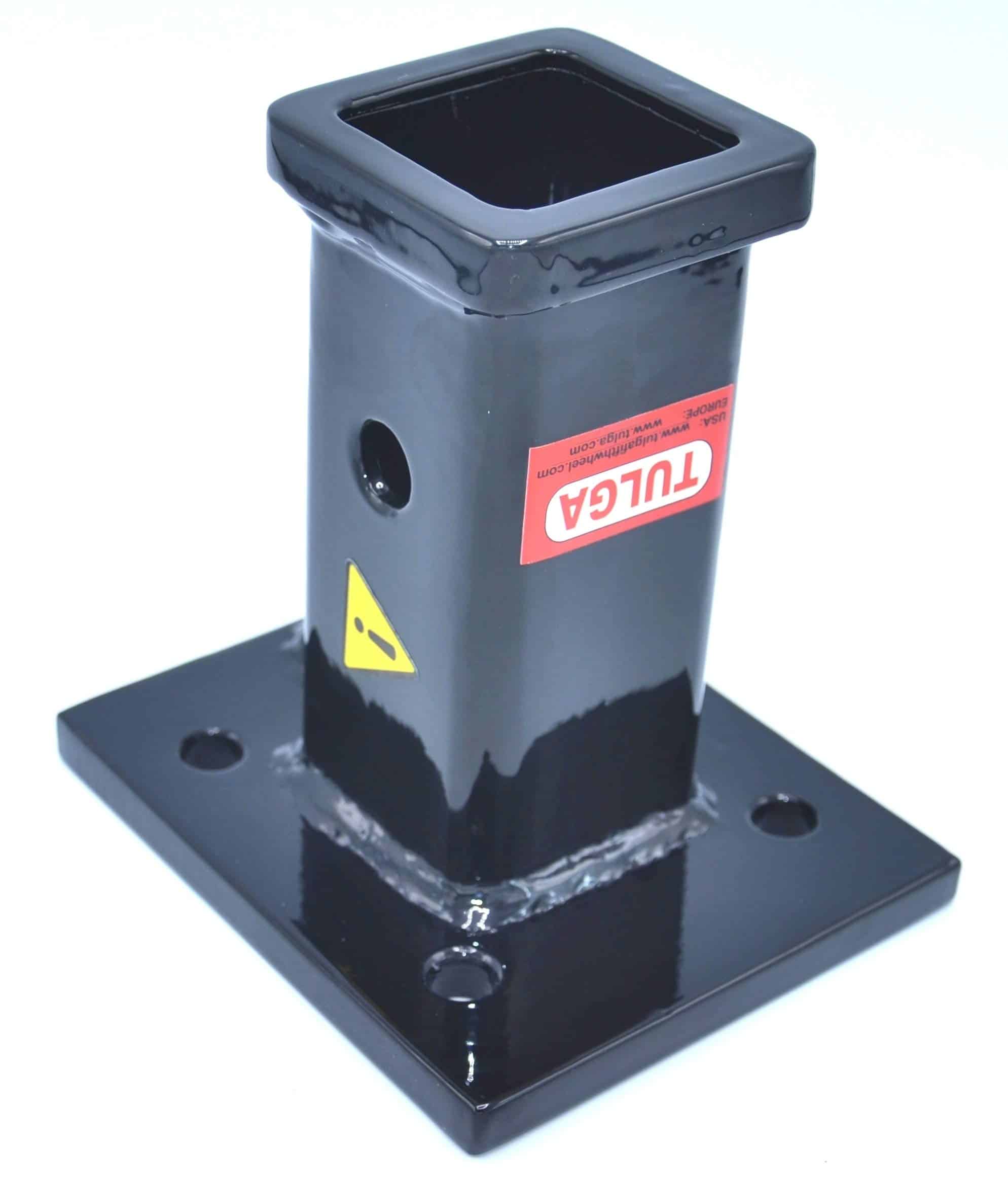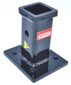 Tubo receptor de 2 pulgadas soldado a una placa de montaje de acero de 1/2 pulgada de grosor.