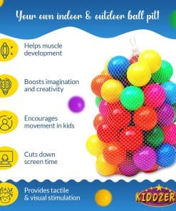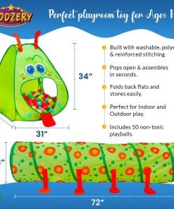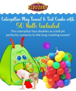 Kiddey’s Caterpillar Kids Play Tunnel and Tent es el lugar perfecto para que los niños pequeños exploren y se diviertan. Este set incluye un túnel de arrastre y una tienda de juegos, junto con 50 pelotas coloridas en 7 vibrantes colores. El túnel de arrastre fomenta el desarrollo de habilidades motoras mientras que la tienda de juegos promueve la coordinación y la fuerza. La tienda en forma de oruga es un mundo mágico lleno de maravillas, con una sonrisa amistosa, lengua y antena que dan la bienvenida a los niños a un reino de fantasía donde los sueños se hacen realidad. La configuración es fácil y sin esfuerzo, gracias al diseño emergente, y el almacenamiento es rápido y sencillo. Cada sesión de juego está garantizada para ser divertida y emocionante, respaldada por nuestra política de devolución de 30 días. ¡Haz que cada momento de juego sea una aventura inolvidable con Kiddey Caterpillar Kids Play Tunnel and Tent!