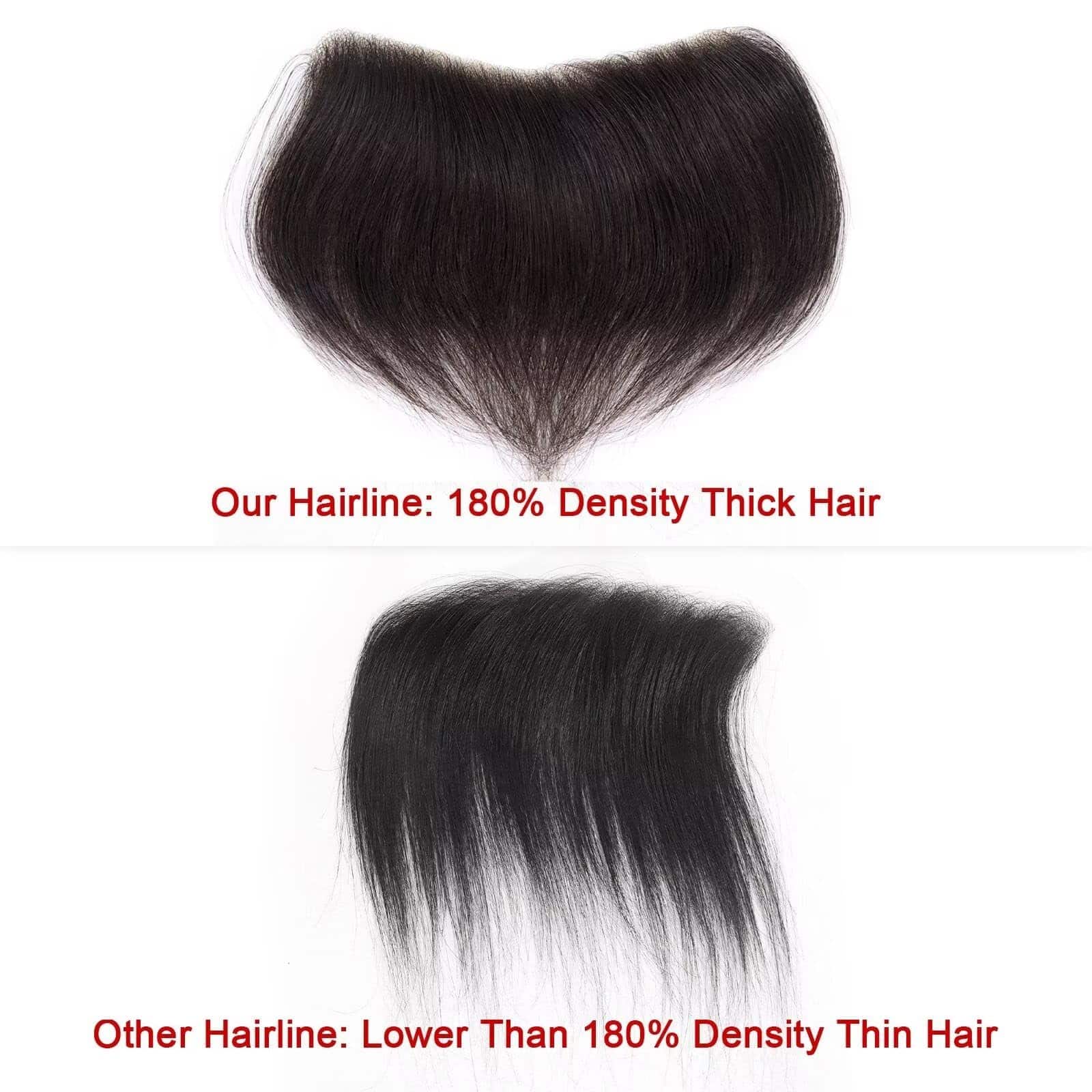 1. Material del cabello: hecho de cabello humano virgen europeo al 100% para la parte frontal del cabello de los hombres, suave y liso, sin enredos, prácticamente sin caída. Al igual que tu propio cabello, se puede lavar, remodelar, cortar, alisar con plancha.