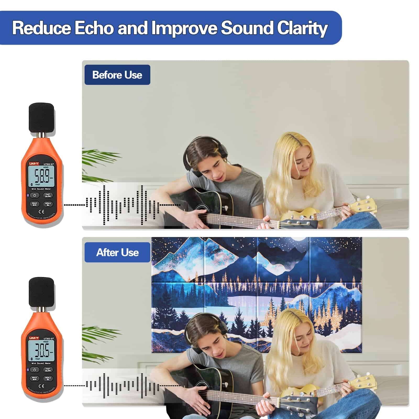 1. AUTOADHESIVO Y FÁCIL DE INSTALAR: Nuestros paneles de absorción de sonido utilizan un diseño autoadhesivo único, con un adhesivo fuerte en la parte trasera solo necesita pelar y pegar, puede fijar fácilmente a una variedad de superficies lisas. No necesita cinta adhesiva adicional para mantenerlo en su lugar. 2. ABSORCIÓN EFICIENTE: La densidad de los paneles acústicos de arte Tutmyrea es de 9.7 lb/ft3, coeficiente de reducción de ruido (NRC) 0.92; Esto significa que los paneles insonorizantes pueden ser excelentes para reducir el ruido, eliminando impurezas sonoras y mejorando la claridad del habla. Puede comprar nuestros paneles de aislamiento acústico con total seguridad, el efecto de uso garantiza su satisfacción!. 3. APARIENCIA ÚNICA: Los paneles insonorizantes Tutmyrea están disponibles en una variedad de patrones de decoración modernos que combinan la función acústica y el arte Deco al mismo tiempo que proporcionan una excelente absorción del sonido. Cree un ambiente interior cómodo, silencioso, moderno y elegante. Se puede utilizar ampliamente en estudios de música, salas de estar, KTV, oficinas, etc. 4. ALTA DENSIDAD Y ECOLÓGICO: Estos paneles acústicos están hechos de material de fibra de poliéster de alta densidad y son retardantes de llama. Además de ser inodoro, no tóxico, libre de formaldehído, es seguro que los adultos, niños y mascotas respiren y toquen!. 5. APLICACIONES AMPLIAS: El acondicionamiento acústico es multiusos, desempeña un papel importante en muchas ocasiones. Aplique en oficinas, estudios de grabación, dormitorios, salas de juegos, paredes de salas de cine en casa o en cualquier otro lugar que necesite, pegando paneles insonorizantes para reducir la transmisión del sonido exterior y hacer que el sonido que necesita sea más claro.