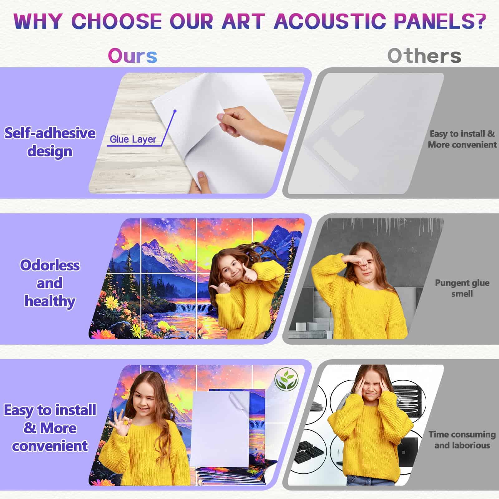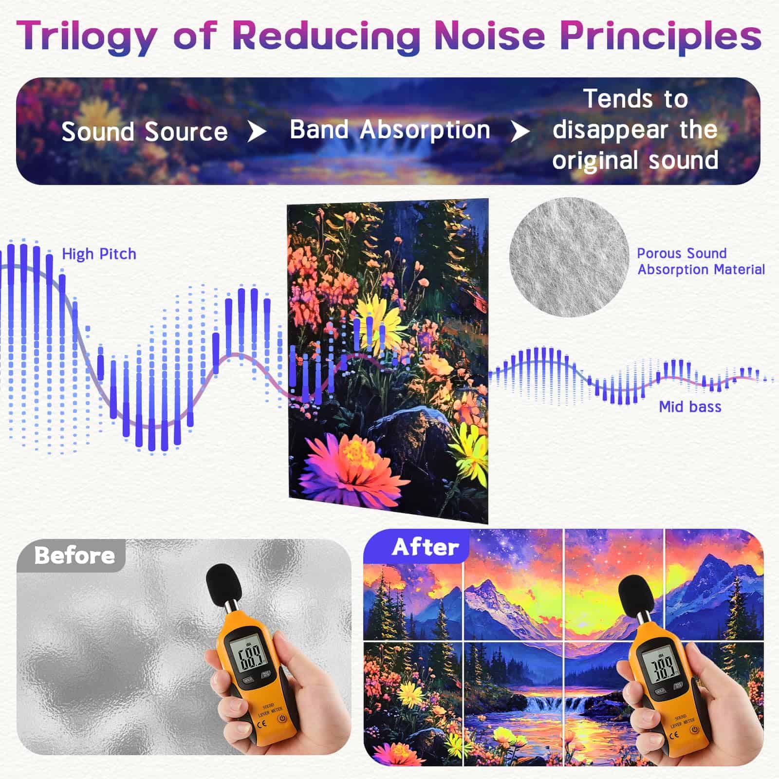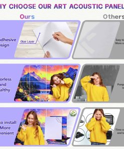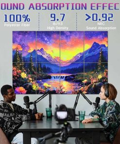 Tutmyrea 8 Pack Paneles Acústicos de Luz Negra, 48″X32″, Paneles Autoadhesivos Ignífugos, Paneles Absorbentes de Sonido Decorativos, Tratamiento Acústico para Estudio de Grabación, Oficina en Casa. Los paneles acústicos artísticos de luz negra de Tutmyrea son diferentes de los paneles acústicos tradicionales, ofrecen una experiencia visual dual. Brillan bajo la luz ultravioleta y en la oscuridad, emitiendo una misteriosa y fresca luz para un efecto visual impresionante. Estos paneles están hechos de 100% fibra de poliéster, con una densidad de 9.7 lb/ft3 y un coeficiente de reducción de ruido (NRC)>0.92, lo que los convierte en excelentes para la reducción de ruido, eliminando impurezas sonoras y mejorando la claridad del habla. Con un diseño autoadhesivo único, con fuerte adhesivo en la parte trasera, facilita la instalación en una variedad de superficies lisas sin necesidad de cinta adhesiva extra. Están fabricados con material de alta densidad de fibra de poliéster, inodoro, no tóxico y libre de formaldehído, lo que los hace seguros para adultos, niños y mascotas. Brindándote a ti y a tu familia una calidad de aire interior más saludable. Estos paneles aumentarán significativamente el efecto acústico de cualquier habitación, ideal para espacios como salas de juegos, estudios de grabación, cines en casa, dormitorios, etc. Una vez que el entorno cambia a fuentes de luz ultravioleta, los paneles muestran su vitalidad oculta y emiten una luminiscencia brillante.