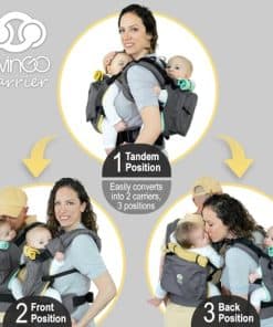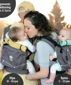 El TwinGo Carrier Original Modelo es un portabebés gemelar totalmente ajustable que se separa en 2 portabebés individuales para mayor versatilidad. Puede usarlo una sola persona con los dos bebés en posición de tándem, o dividirlo en dos portabebés individuales para que dos personas lleven un bebé cada uno (posiciones frontal o posterior). Funciona tanto para gemelos como para niños de diferentes tamaños. El cinturón firme y estructurado levanta y soporta el peso de los bebés en sus caderas (no en los hombros), mientras que las correas de hombro de espuma premium gruesa brindan un ajuste cómodo. La forma ergonómica asegura que las caderas de los bebés estén apoyadas en una forma de M de piernas abiertas y la columna vertebral esté soportada en un forma de C curvada natural. Nuestros videos instruccionales le enseñan cómo poner a dos bebés usted mismo y nuestro equipo de atención al cliente está disponible por correo electrónico para ayudarlo. El Modelo Original cuenta con bolsillos extra grandes en ambos portabebés para sostener sus elementos esenciales para pañales, perfecto para viajes de un día y viajes. Este sistema asequible es menos costoso y más funcional que comprar dos portabebés separados. Las dos capuchas extraíbles Sleep Hoods pueden soportar ligeramente la cabeza y el cuello de su bebé cuando está durmiendo y también se pueden usar como parasol (UPF 50) o cubierta de privacidad mientras amamanta.