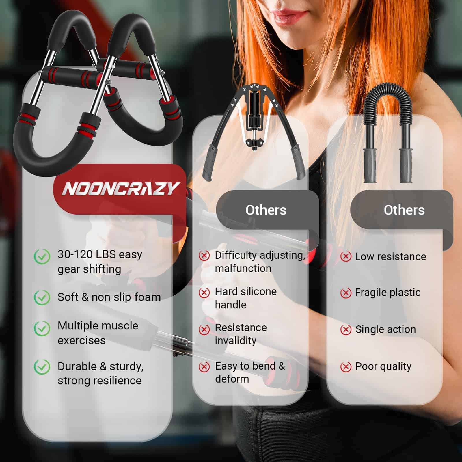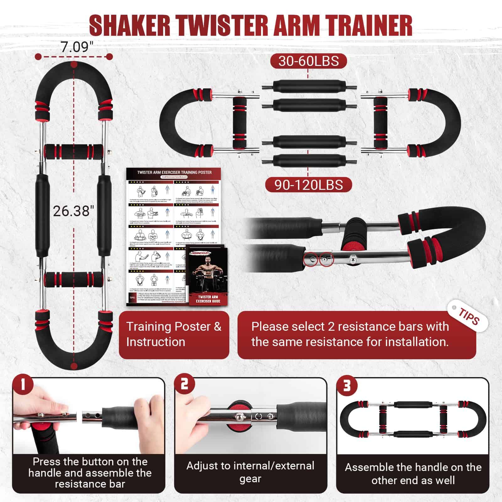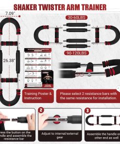 Twister Arm Trainer es considerado un poderoso asistente para el entrenamiento de músculos del cuerpo superior. Este ejercitador de brazo y pecho es ideal para trabajar los bíceps, tríceps, deltoides, pectorales mayores y varios músculos más. Cuenta con una función única de ajuste de dos etapas y viene equipado con 2 juegos (4 barras de ejercicio de resortes) con diferentes resistencias, que van desde 30 libras hasta 120 libras, lo que te permite satisfacer tus diversas necesidades de ejercicio. El póster incluido muestra claramente cada detalle, desde la postura inicial hasta el proceso de ejercer fuerza, lo que te ayuda a dominar con precisión los movimientos de ejercicio. La instrucción de instalación/ajuste detallada con pasos claros complementa el póster, haciendo que el ejercicio sea más suave y eficiente. El equipo de twister arm trainer es desmontable, lo que facilita su almacenamiento y transporte, ya sea en el gimnasio, la oficina o durante tus viajes, asegurando que no se interrumpa tu proceso de entrenamiento. Cada barra de ejercicio de resortes está envuelta con una cobertura de cuero elástico que reduce los riesgos de seguridad durante el entrenamiento y previene las lesiones por pellizcos, mientras que extiende la vida útil del resorte y evita la oxidación, proporcionándote una experiencia de ejercicio confiable y duradera. Con alta elasticidad y sin deformación, el arm trainer ofrece una resistencia fuerte incluso después de un uso prolongado. El set incluye 2 asas, 4 barras de ejercicio de resortes, y 1 póster y manual de instrucciones, para que puedas comenzar a entrenar de inmediato y alcanzar tus objetivos de fitness. ¡Nooncrazy Power Twister es la solución perfecta para fortalecer tu cuerpo superior de manera efectiva y segura!