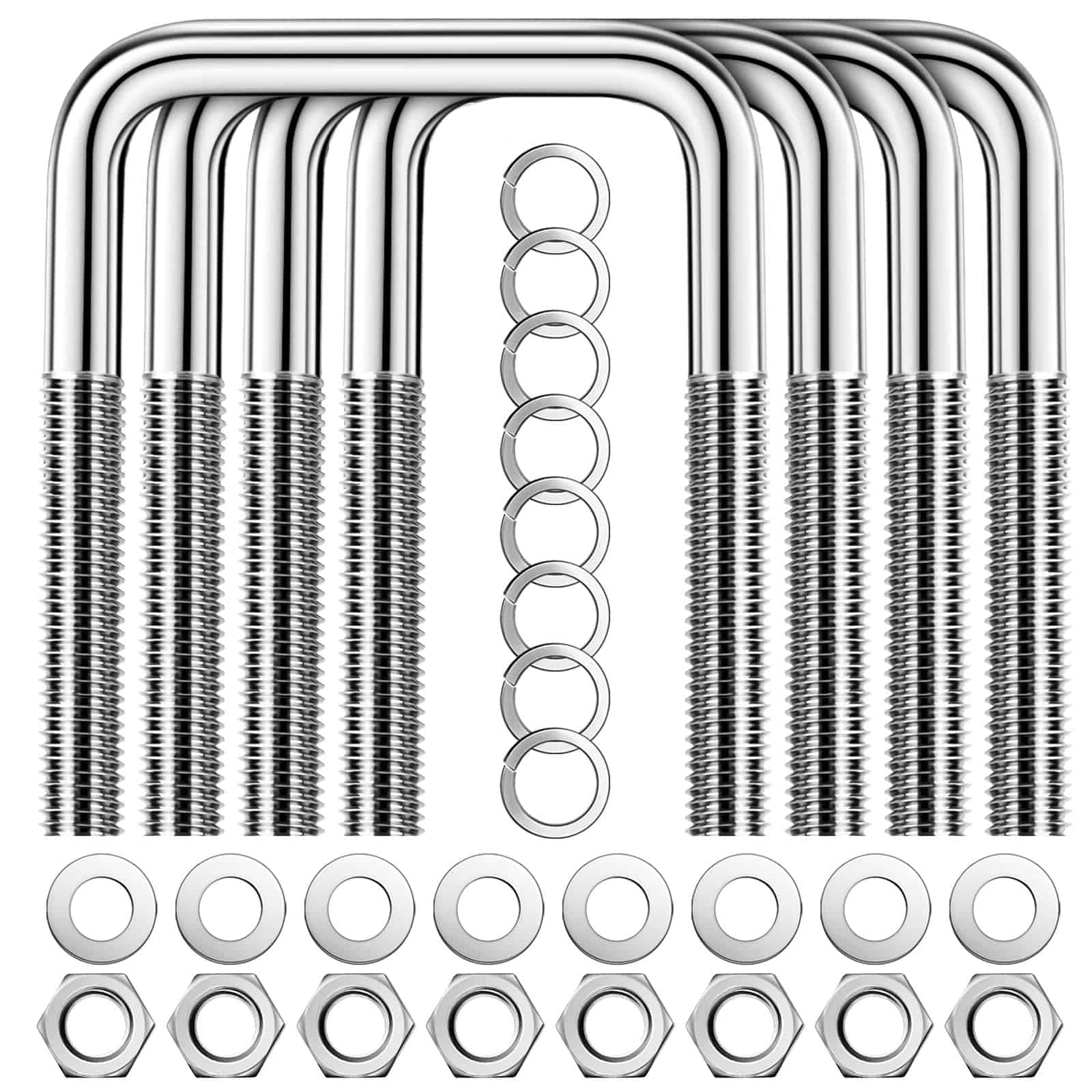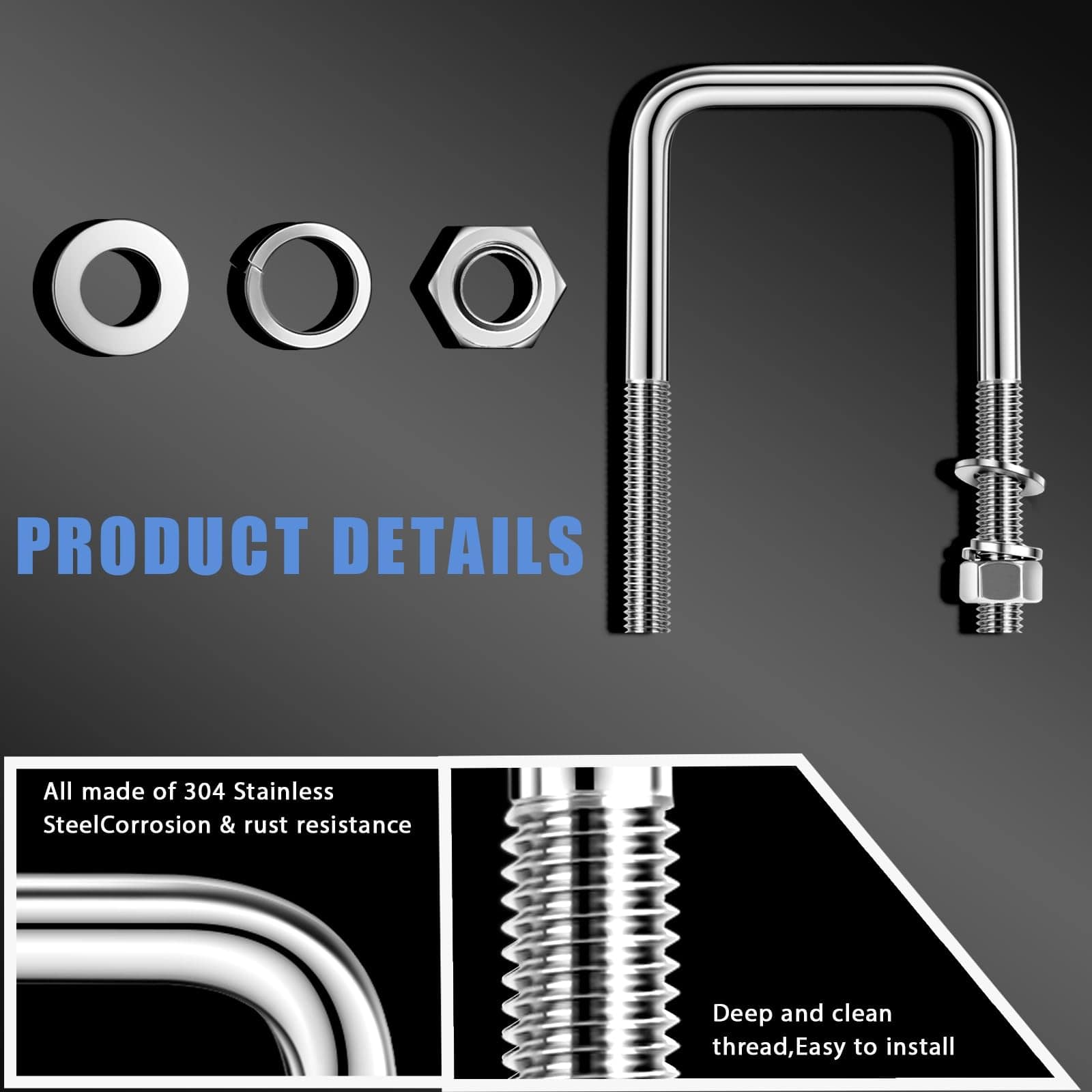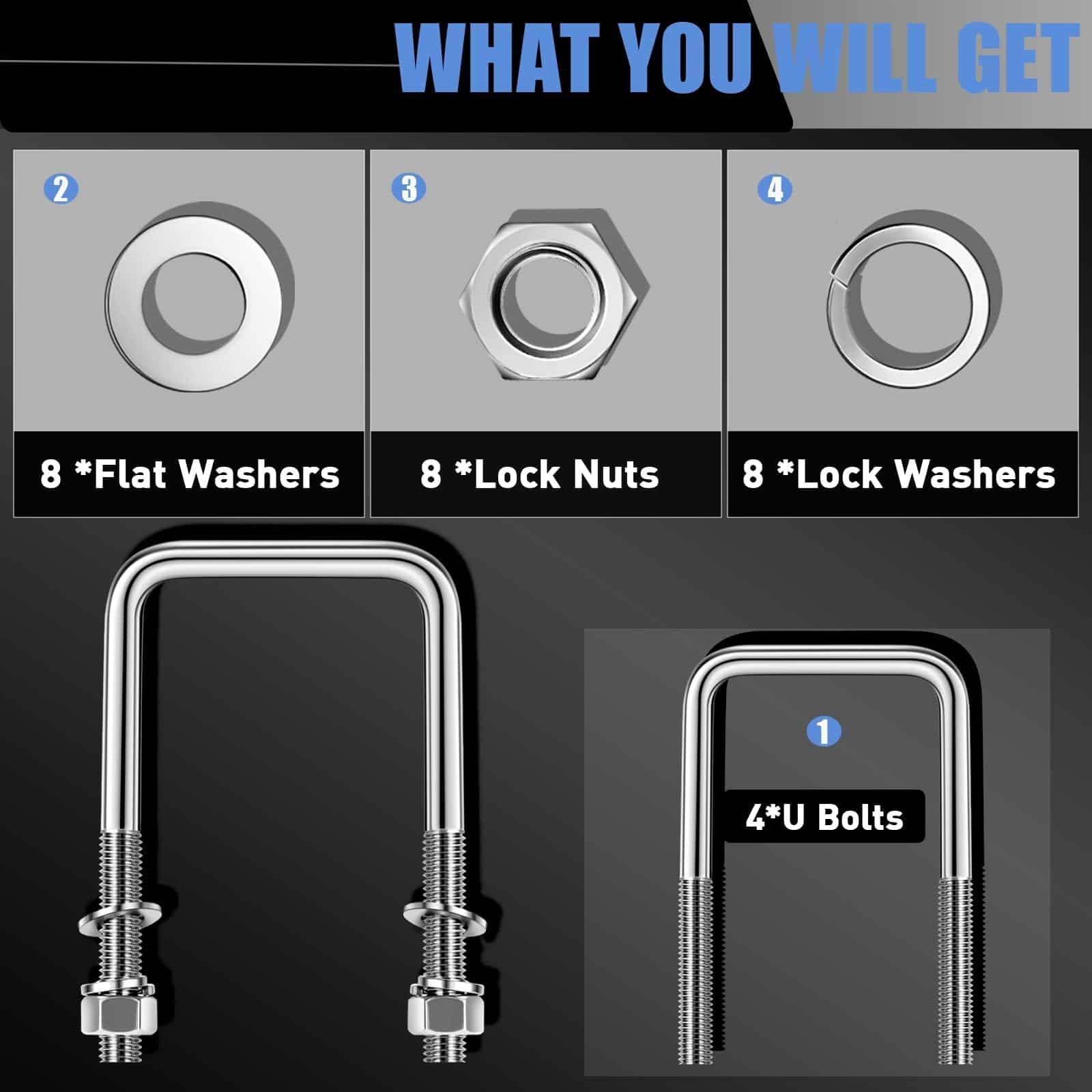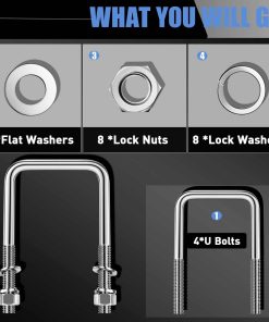 Recibirás 4 U-Bolts de acero inoxidable, 8 arandelas planas, 8 tuercas hexagonales, 8 arandelas de seguridad, cada perno puede soportar alrededor de 100 lbs, un kit conveniente y valioso que te ayuda a ahorrar tiempo.