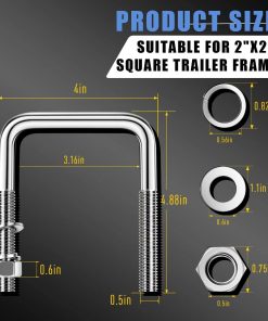 Tamaño del U-Bolt de acero inoxidable: 1/2″ D x 2-1/16″ W x 4-3/4″ L, longitud de rosca: 2-1/2″/6.35cm adecuado para vigas y ejes cuadrados de 2 pulgadas x 2 pulgadas. (Te recomendamos que verifiques cuidadosamente el tamaño antes de ordenar)