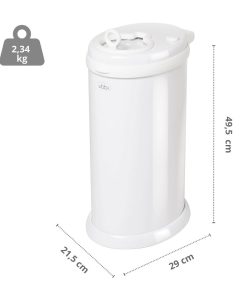 El galardonado cubo de pañales Ubbi ha obtenido reconocimiento mundial por su control superior de olores y conveniencia, representando un avance en el mercado de eliminación de pañales. El cubo de pañales de acero Ubbi está fabricado de acero con recubrimiento en polvo y ofrece un control máximo de olores. Sus sellos de goma están estratégicamente colocados para atrapar olores, y la innovadora tapa deslizante minimiza la interrupción del aire, asegurando que los olores desagradables permanezcan contenidos dentro del cubo. El bloqueo infantil opcional mantiene las manos pequeñas alejadas. Atendiendo a las necesidades de los padres modernos, nuestro cubo de pañales es compatible con cualquier bolsa de basura estándar, lo que ahorra dinero y tiempo a los padres. Diseñado estratégicamente para ser el sistema de eliminación más fácil de cargar, usar, vaciar y limpiar. Entra en el mundo de Ubbi donde los productos innovadores están diseñados y creados pensando en padres e hijos. Una amplia gama de productos de la marca Ubbi ahora está disponible para los padres modernos de hoy que buscan esenciales para bebés elegantes y funcionales. No limpie con abrasivos o líquidos fuertes, ¡ni siquiera con agua! Limpie con un paño seco para evitar la oxidación. No se necesitan bolsas especiales. Dimensiones: 19.5 «H x 8.4» W x 11.4 «D. Tamaño de la abertura: 5 pulgadas de diámetro. Capacidad para hasta 55 pañales de tamaño recién nacido.