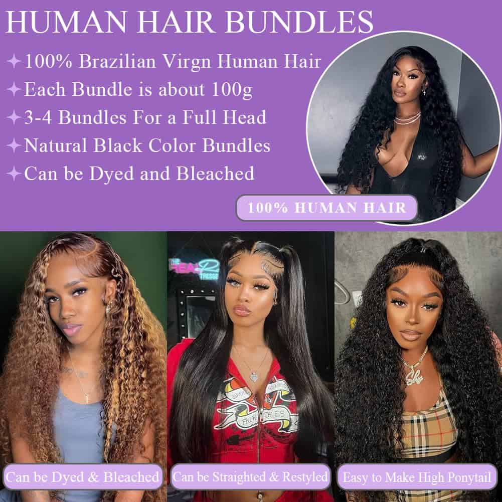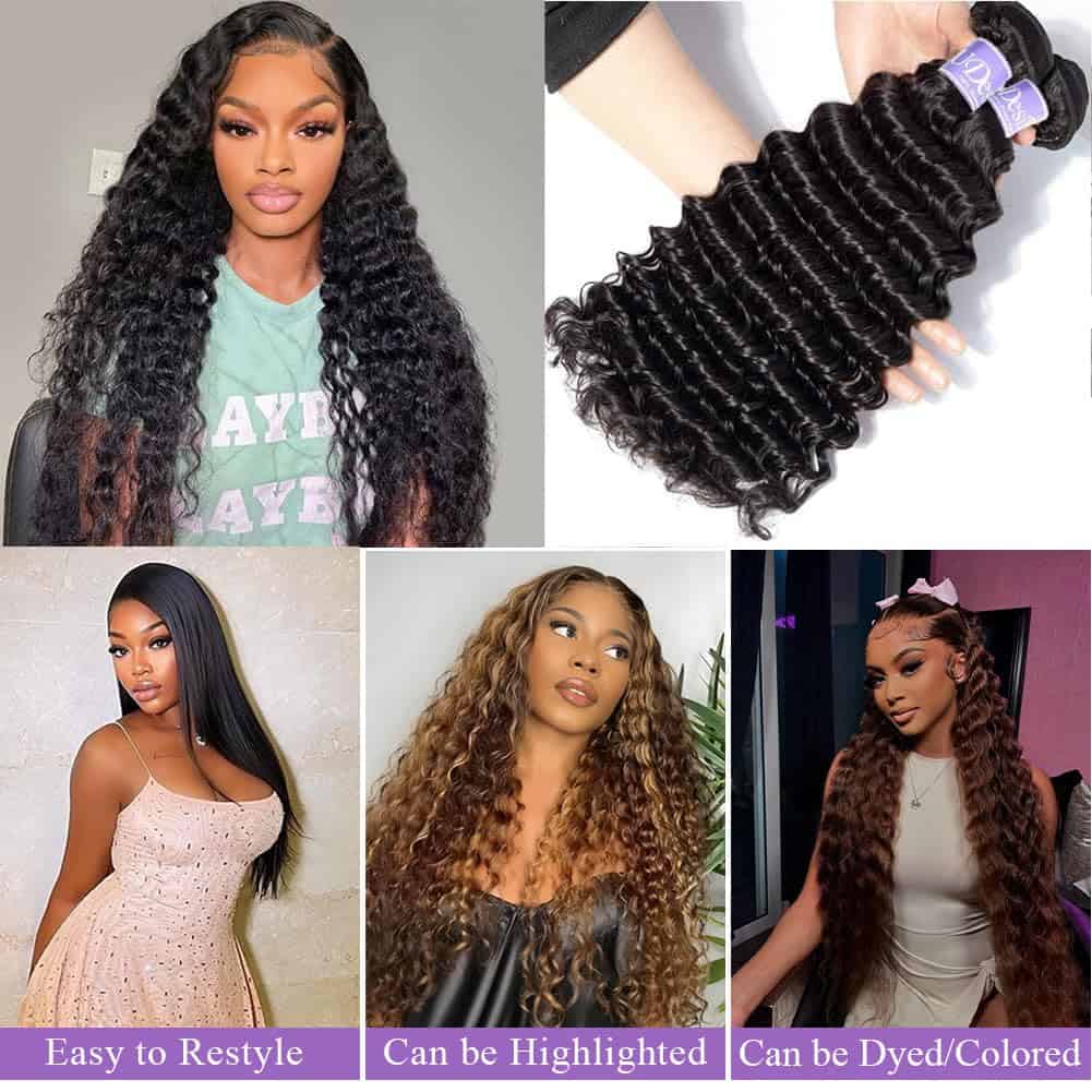 4. Ventaja de los Bundles de Cabello Profundo: Nuestros Bundles de Cabello Humano están Hechos de 100% Cabello Humano Brasileño, Sin Mezcla de Cabello Animal, Sin Tratamiento Químico, de Larga Duración, Puede Ser Teñido, Permanente, Destacado, Rizado o Estilizado Como Tu Propio Cabello. Se Puede Usar en Fiestas, Vestimenta Elegante, Estilos Diarios, Viajes, Halloween, Navidad o Cualquier Ocasión que Desees. Demuestra tu Confianza y Encanto.