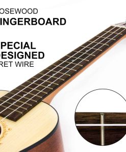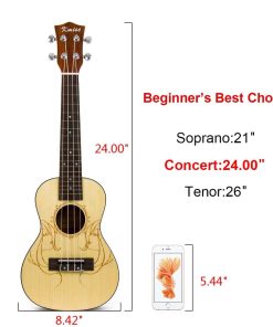 Especificaciones: Ukelele de Concierto con la parte superior de Abeto Sólido, Cuello de Nato, Diapasón de palisandro, 18 Trastes, Tuerca y Silla de Hueso, Cuerdas Aquila fabricadas en Italia, Clavijas Cromadas con cerradura, Acabado Natural Mate. Incluye: 1x Ukelele de Concierto Hawaii Guitar 24″, 1x Bolsa de transporte de 24″ para ukelele, 1x Afinador digital mini JOYO.