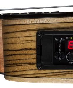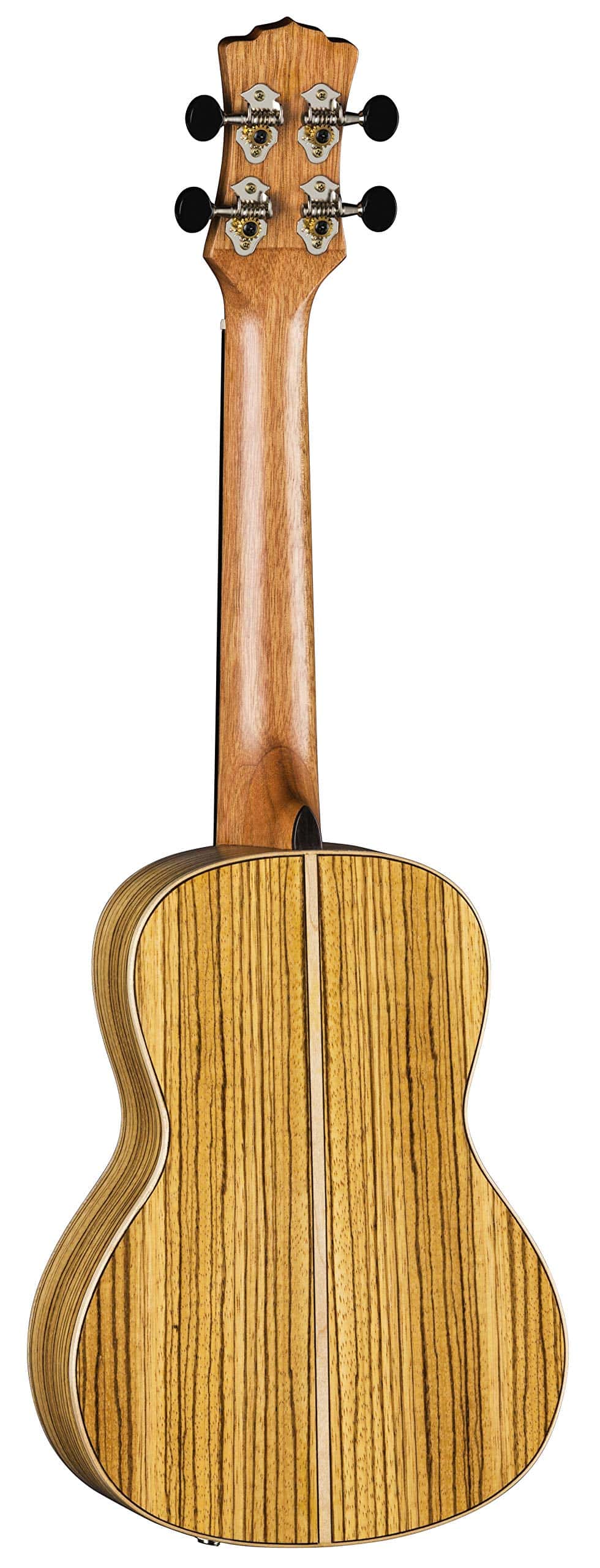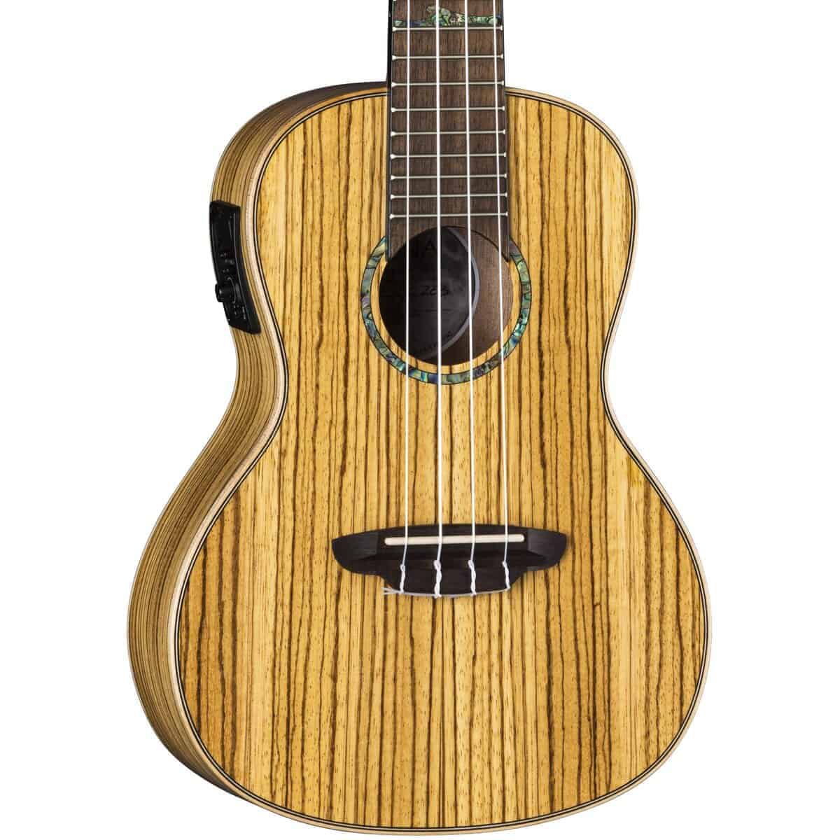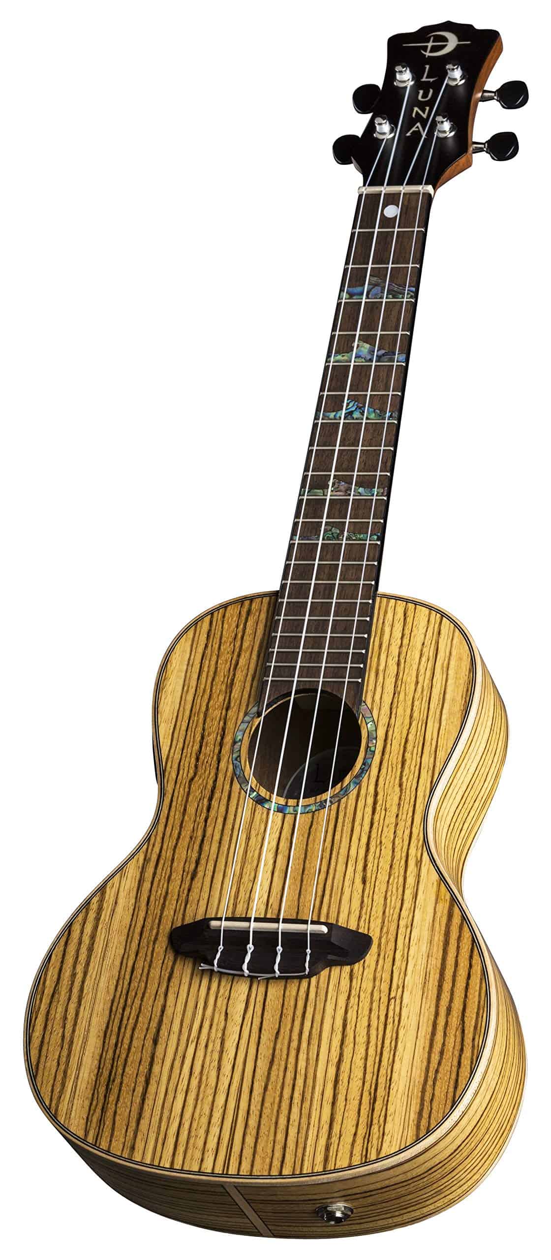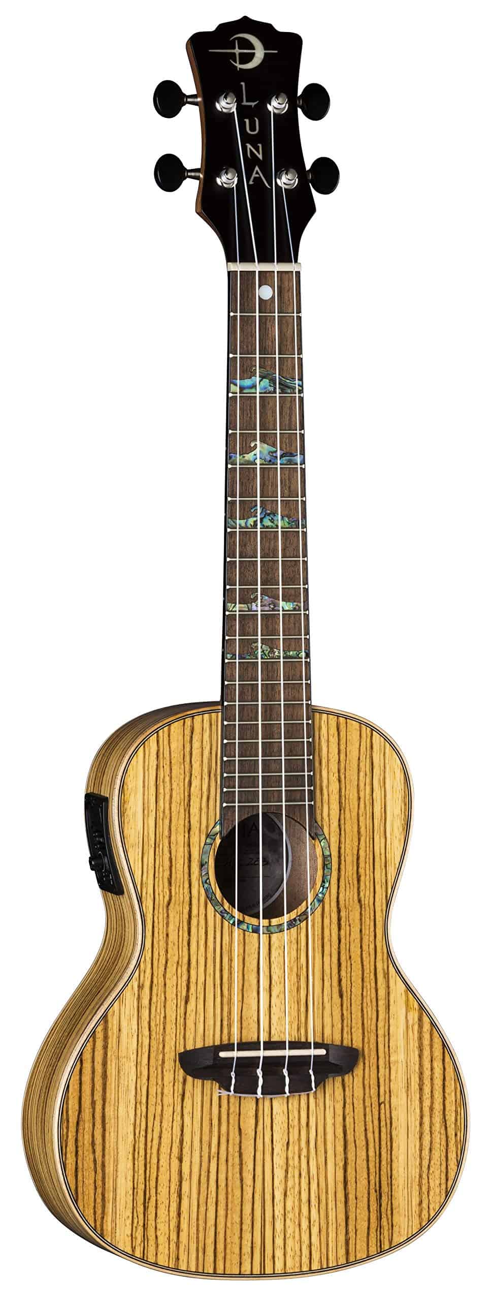 Este hermoso ukelele concierto cuenta con un cuerpo de madera de zebrano y produce un tono nítido pero vibrante con cada golpe rítmico. Los ukeleles High Tide están fabricados con una variedad de maderas tropicales exóticas, en los cuales la calcomanía de Luna «luna llena» dentro del agujero de sonido está enmarcada por un anillo de abulón. Esta serie es la línea de ukeleles premier de Luna, inspirada en la luna llena en el primer traste que hace que los marcadores de trastes de ola de abulón debajo de ella «se eleven» a medida que avanzan hacia la luna. El ukelele High Tide de zebrano está fabricado con un diapasón de 15 pulgadas, mástil de caoba, puente y diapasón de nogal, y afinadores de engranajes abiertos. Mantén ese ritmo en marcha y en sintonía con los resistentes afinadores de engranajes abiertos. Amplifica fácilmente tu sonido y ajústalo rápidamente con el preamplificador Luna UK-T2 con afinador incorporado. Este ukelele es perfecto para músicos que quieren que su instrumento suene tan bien como luce, asegurándose de causar una buena impresión en el escenario. ¡Estuche incluido. Únete a la Tribu Luna!.