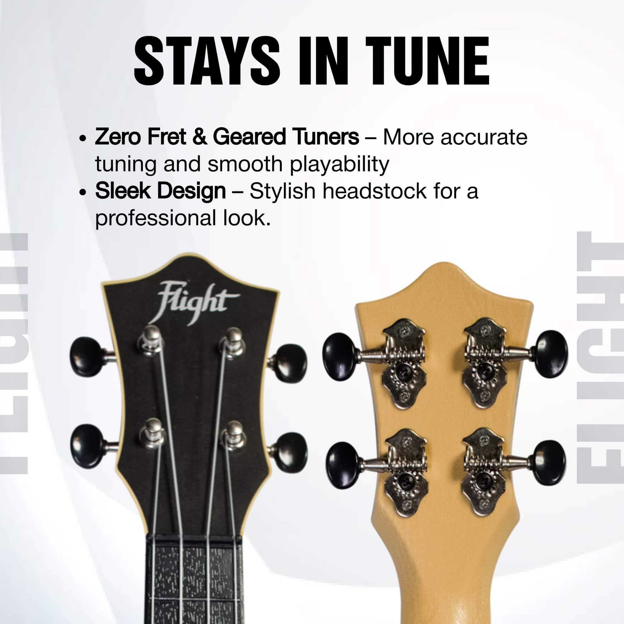 ¡Plástico fantástico! La sabiduría convencional dirá que los ukeleles de plástico son sustitutos baratos y de baja calidad del instrumento real. Bueno, ¡es hora de tirar la sabiduría convencional por la ventana! Construidos sin disculpas de plástico, la calidad de sonido de estos ukeleles te sorprenderá y su durabilidad los convertirá en el instrumento de elección de Keith Richards después de que llegue el Armagedón. Estos ukeleles son perfectos para festivales lluviosos, compartimientos diminutos en los aviones, adolescentes malhumorados y profesores de ukelele que trabajan con niños pequeños. Gracias a un dorso de ABS arqueado más ancho, este bebé tiene más volumen en el rango medio que un soprano promedio, mientras que también resuena mejor y suena más brillante. Es innecesario mencionar la durabilidad y la resistencia a los cambios de humedad, los principales enemigos de los ukeleles de madera. El tilo es una madera caracterizada por un sonido brillante y una textura elegante. También absorbe los colores del agua de una manera muy interesante creando patrones muy geniales, lo que significa que ningún ukelele es igual y tu ukelele será único en su especie. Además, Flight utiliza una técnica especial de coloración para crear aún más patrones. El mástil y el diapasón del TUS-35 están hechos de plástico ABS. Es una solución perfecta para ukeleles de clase de entrada, ya que no está sujeto a cambios climáticos. Nunca tendrás trastes afilados o mástil doblado en ninguno de los ukeleles de viaje de Flight. La superficie del mástil imita el patrón de madera, para evitar una sensación de plástico barato. El traste cero emparejado con una construcción de puente única mantiene la acción de las cuerdas baja y la entonación en punto. Dado que el plástico nunca se moverá, nunca tendrás que lidiar con trabajo adicional en la cejuela. El diseño del clavijero es parte integral de nuestra identidad. El enchapado del clavijero del TUS-35 está hecho de tilo y coincide con el color de la tapa. Todos los ukeleles de Flight cuentan con un clavijero cuidadosamente diseñado equipado con afinadores engranados que siempre se mantendrán en sintonía. El toque final que necesitaba el ukelele de viaje era una funda genial para acompañarlo en tus viajes. El color azul denim complementará tu estilo y también hará que la funda se destaque del estándar negro.