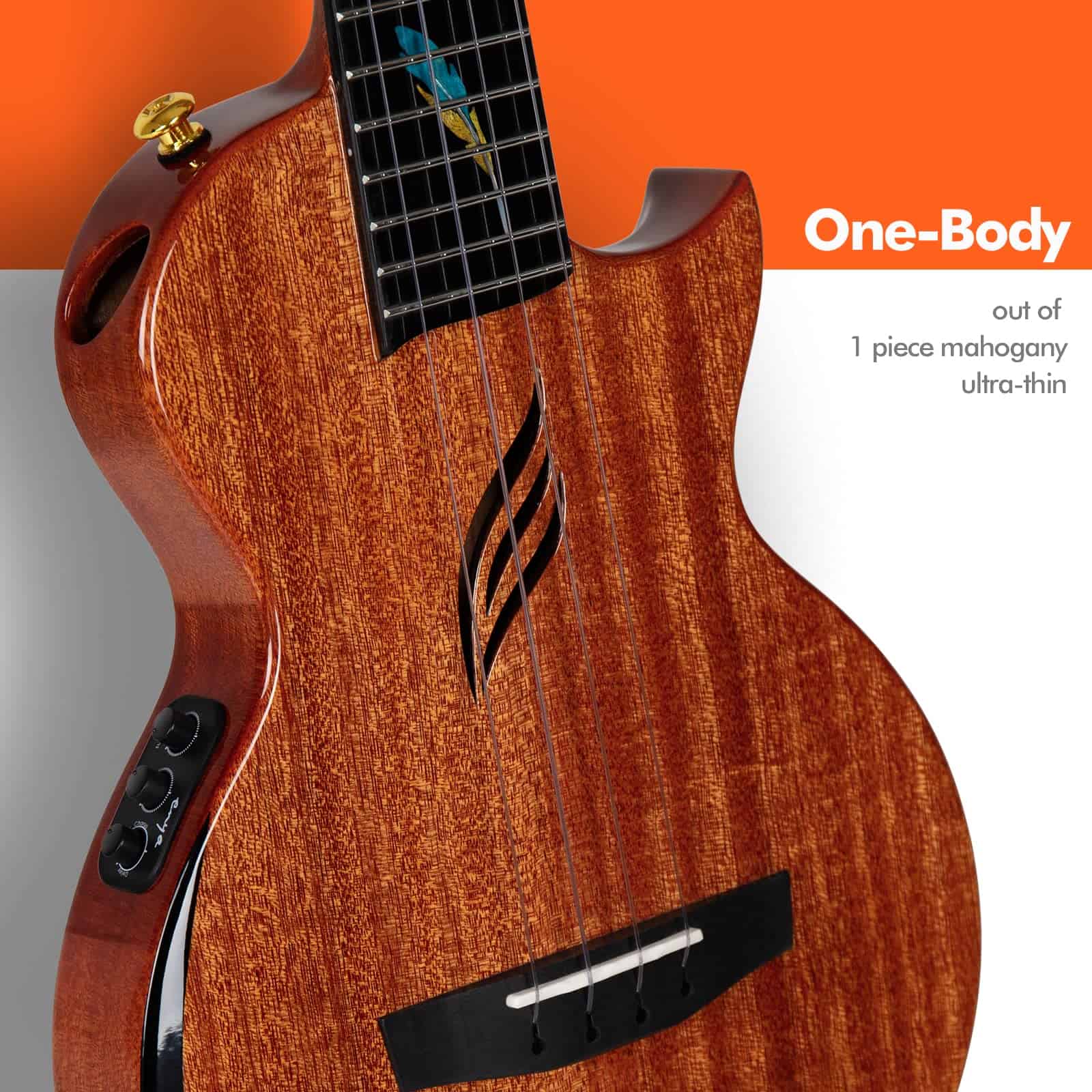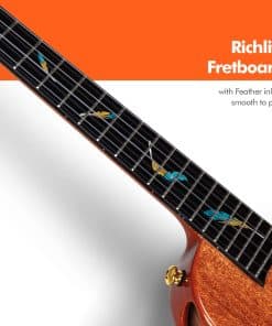 1. Características con toda la caoba maciza, especialmente la cabeza, el cuello y la parte central trasera son de una sola pieza de madera de caoba, lo que hace que el ukelele suene cálido, completo y con buena penetración. 2. Hay un único incrustado hecho a mano en el diapasón de richlite, que hace que este ukelele sea lujoso y valga la pena ser una de tus colecciones. 3. Cada ukelele viene con un sistema de pastilla AcousticPlus, podrás obtener funciones de reverb, chorus y delay sin conectar un amplificador. 4. El proceso de acabado de barniz súper delgado durante 18 días permite que el sonido del ukelele se libere mucho más completo y la veta de la madera se muestre por completo incluso con un acabado colorido. 5. Incluye cuerdas tenor J87 y clavijas de afinación 1:18 de fundición para mantener el ukelele afinado durante más tiempo.