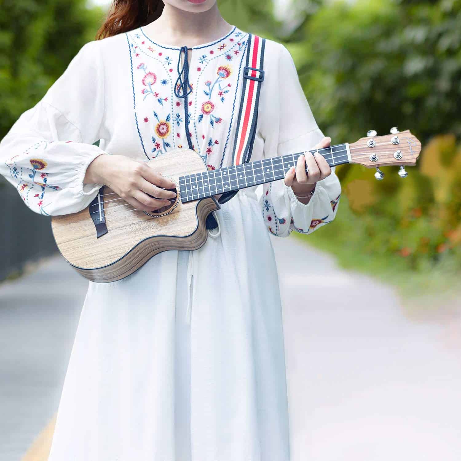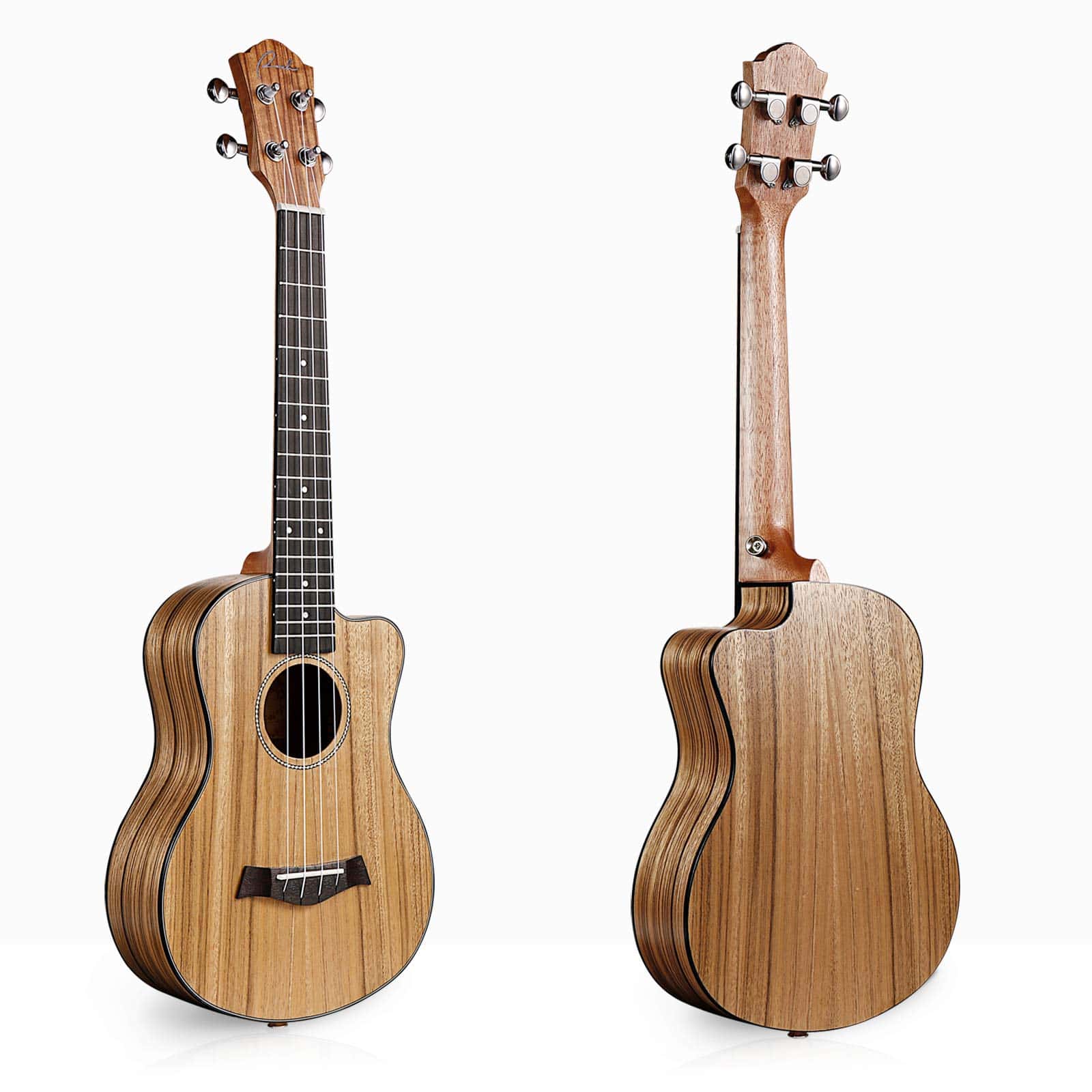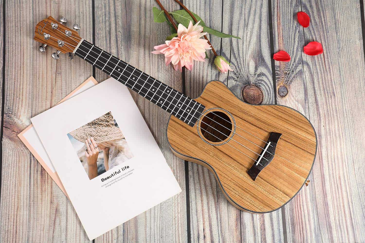 1. Sonido increíble – El cuerpo del ukelele acústico Tenor con cutaway está hecho de Nogal Negro, que ofrece un tono más cálido y profundo. Las cuerdas Aquila suaves y suaves definitivamente ayudan a que el sonido que sale de él resuene de manera bastante clara y dulce, lo que también mantiene la afinación a través de múltiples reproducciones muy bien. 2. Una obra de arte – El increíble ukelele Tenor de 26″ de Ranch combina la madera clásica de Nogal para el cuerpo liso y pulido y el mástil de Okoume. Las características livianas y bien construidas le permiten crear armonías cálidas y perfectas de ukelele hawaiano. 3. Fácil de tocar – Con 12 lecciones en video en línea gratuitas, fáciles de seguir. Este ukelele Tenor de Ranch para aprender a tocar de 26 pulgadas es mejor elegir que un ukelele de 23 pulgadas, con un mejor rango de sonido y calidad y trastes espaciados más ampliamente que son mejores para adultos, principiantes, jugadores intermedios o profesionales que comienzan a practicar. ¡Este pack de ukelele para principiantes es tu mejor opción! 4. Fácil de afinar – ¡Las clavijas de afinación de fundición de cromo mantienen los ukeleles afinados! Es tan simple como apretar un tornillo. El afinador digital es fácil de afinar y tocar. Se mantiene afinado más tiempo que los normales recién sacados de la caja y ofrece un tono brillante y distintivo ya sea que toques en solitario, acompañes con canto o jam con amigos. 5. Todo en un set – ¡Todo lo que necesitas para un ukelele está aquí: Instalado con cuerdas Aquila + bolsa de transporte bien acolchada + afinador digital + paño de pulido de microfibra + un juego extra de cuerdas Aquila + correa + paso a paso 12 lecciones en línea! ¡Hemos preparado todo lo que un principiante necesita!