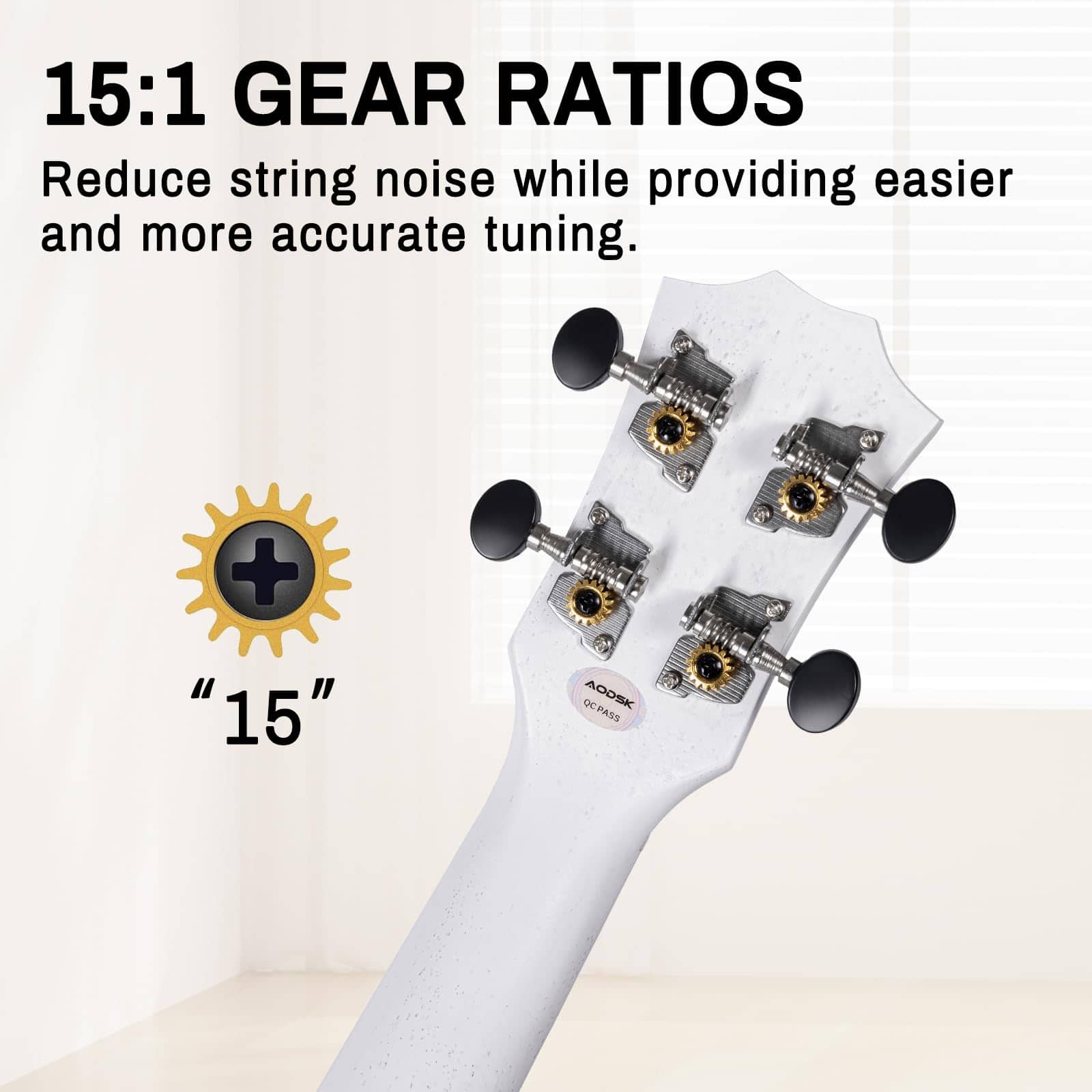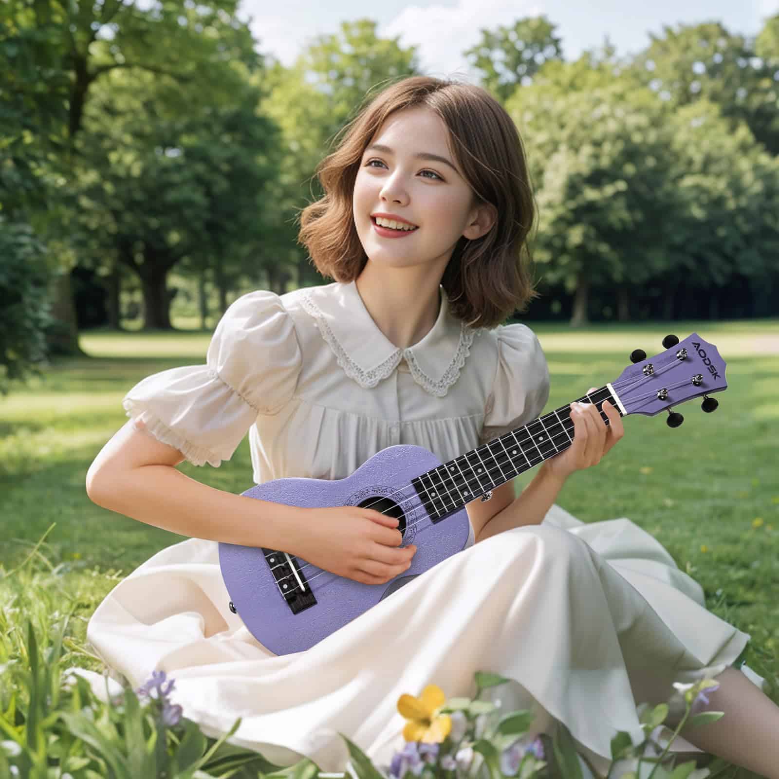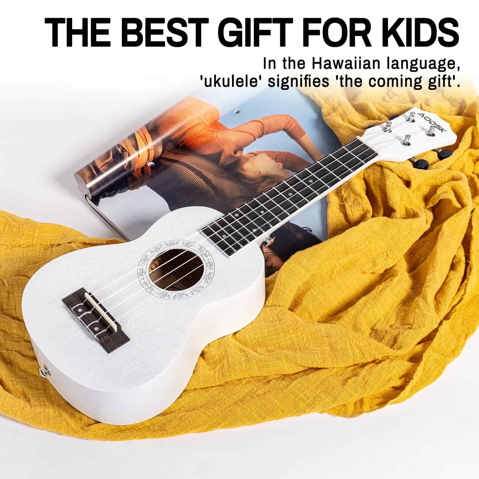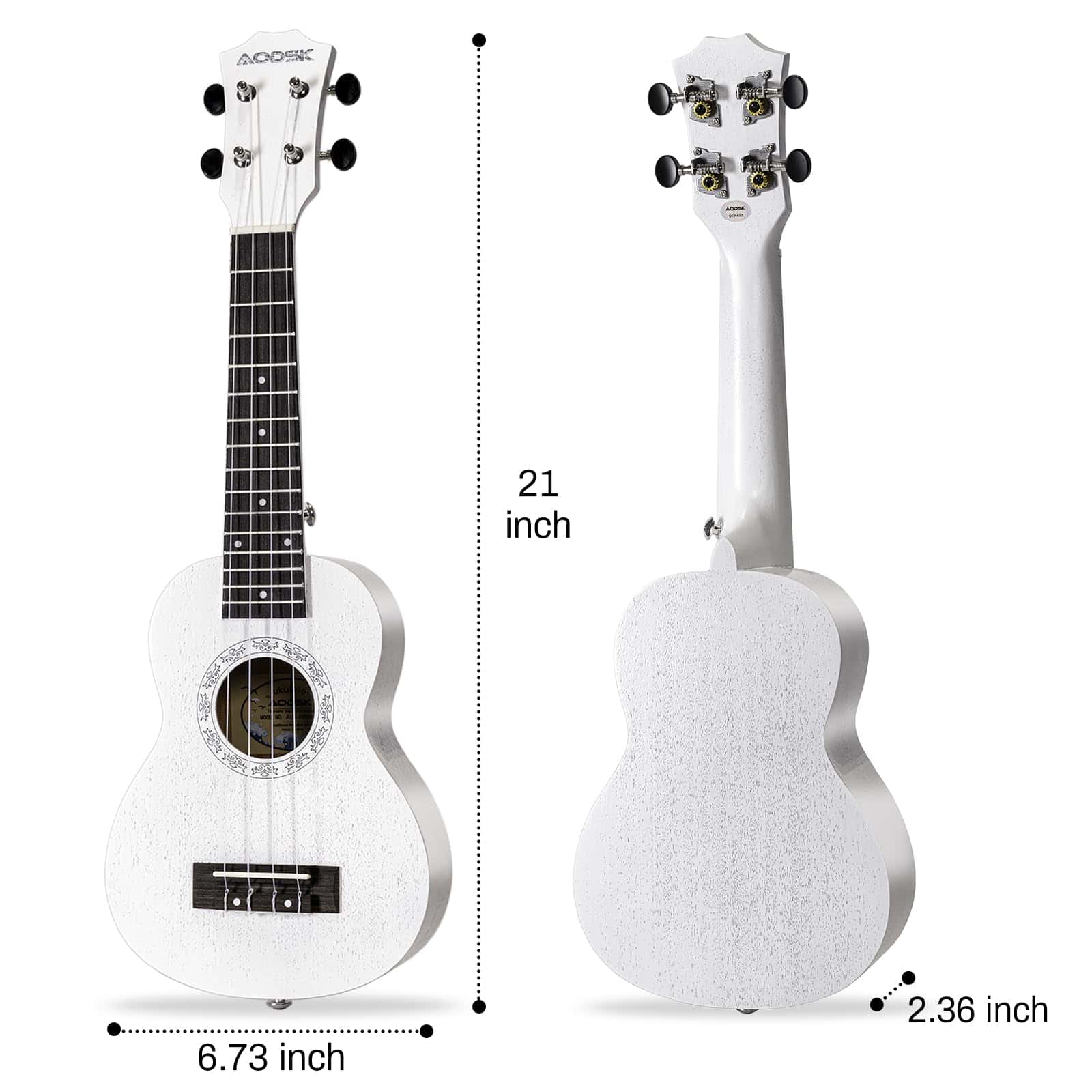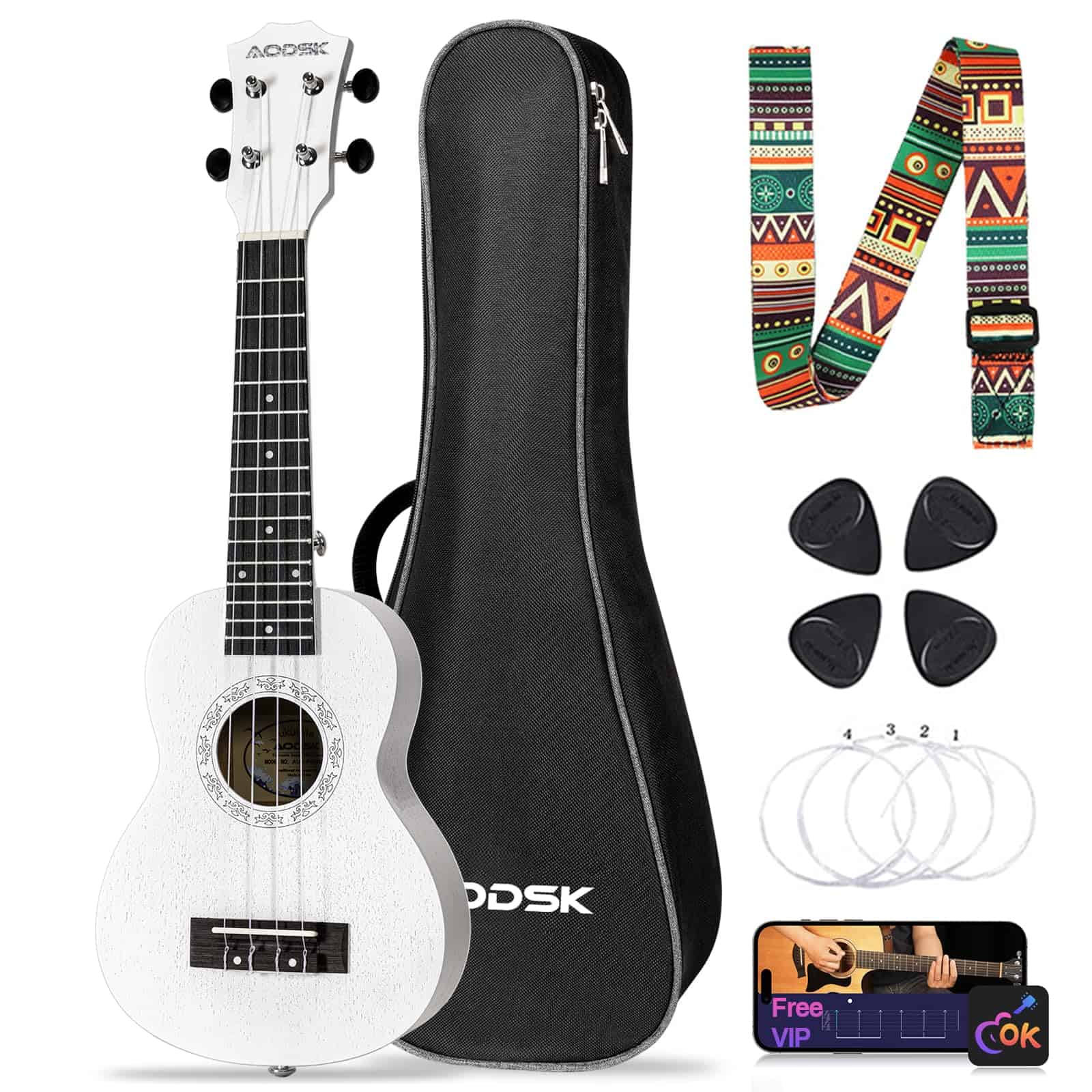 1. Completo Kit de Inicio de Ukulele AODSK El kit de inicio de ukulele Soprano AODSK incluye un ukulele de 21 pulgadas, funda, cuerdas extra, 4 púas y correa ajustable. Viene con todo lo que necesitas. Un regalo decente para cumpleaños, Navidad, Día de Acción de Gracias, Día del Niño, etc.