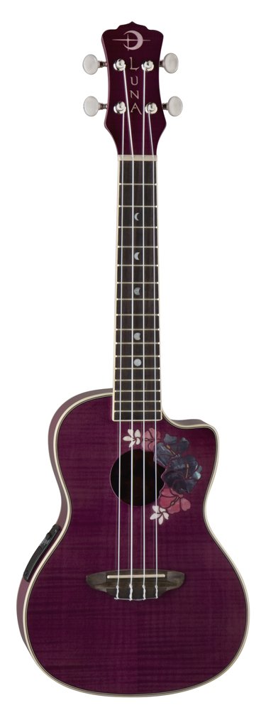 El Ukulele Concerto Luna Guitars Flora está adornado con incrustaciones de hibisco y plumeria alrededor del orificio de sonido. El hibisco es la flor nacional de Hawai. Dado que la flor solo dura un corto período todos los días, envía un mensaje para «aprovechar el día» y simboliza la belleza delicada. La plumeria es un símbolo de la primavera y, por lo tanto, está asociada con el nacimiento y la vida. Este hermoso ukulele Luna presenta un brillante arce llama trans-púrpura en la parte superior y un cuerpo de arce, produciendo un sonido completo y profundo junto con el tamaño del cuerpo de concierto del instrumento. El cutaway ofrece comodidad al acceder a los trastes de registro superior, y el mástil de arce y puente y diapasón de palo de rosa agregan sustain y claridad duraderos a tu tono. Los afinadores de estilo abierto mantienen el instrumento en sintonía precisa y el preamplificador incorporado proporciona una amplificación fácil que se puede ajustar rápidamente.