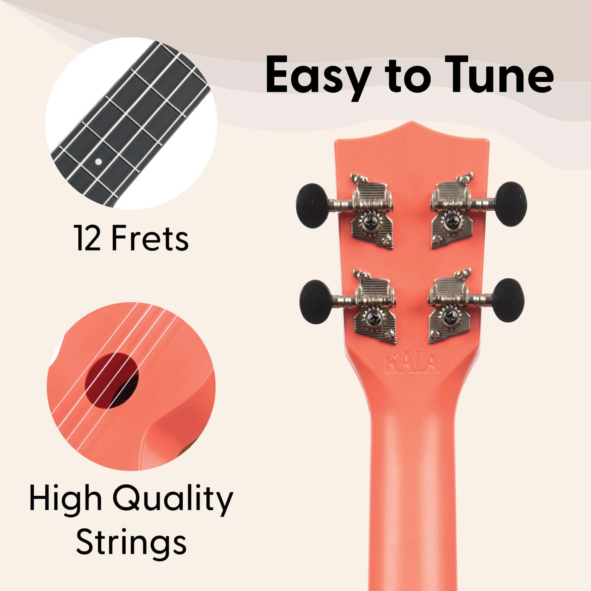 1. Diseño resistente al agua y duradero: El Ukulele Soprano Waterman Rosa Crepúsculo de Kala está hecho de plástico compuesto ABS, lo que lo hace altamente duradero y completamente resistente al agua, ideal para excursiones a la playa y juegos al aire libre. 2. Ideal para programas escolares: Este ukulele ligero es fácil de limpiar y está construido para resistir el uso diario, convirtiéndolo en una excelente elección para aulas y programas musicales. 3. Cuerdas Aquila Super Nylgut: Equipado con cuerdas Aquila Super Nylgut, este ukulele ofrece un sonido brillante y claro con una mayor estabilidad de afinación, proporcionando una experiencia de reproducción suave. 4. Clavijeros de ajuste de engranajes abiertos niquelados: Cuenta con clavijeros de alta calidad niquelados de engranajes abiertos que garantizan una afinación precisa y duradera. 5. Compacto y listo para viajar: Con 20.75 pulgadas de longitud, este ukulele de tamaño soprano viene con una bolsa de transporte con logotipo personalizado y una mini guía de inicio rápido, convirtiéndolo en el compañero de viaje ideal.