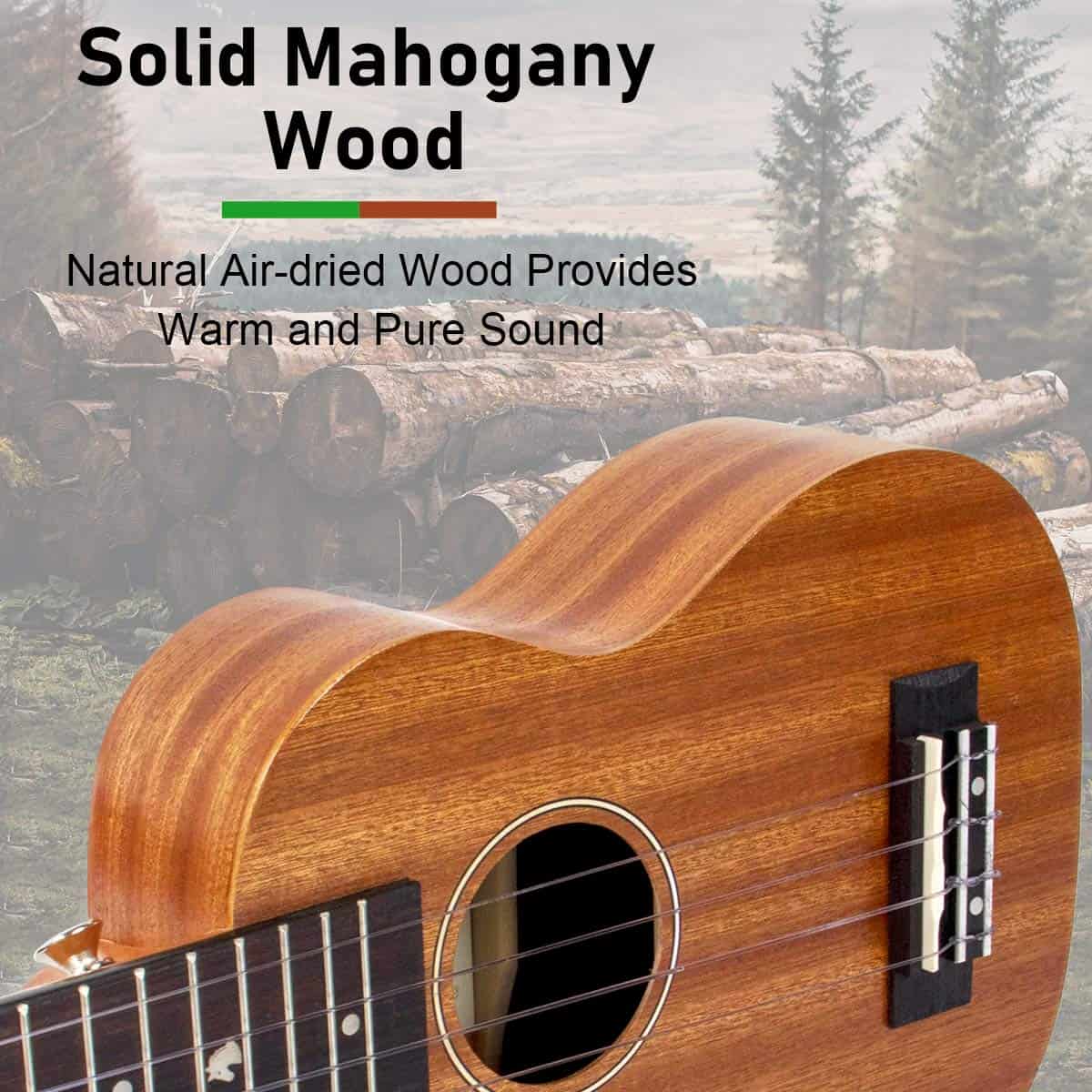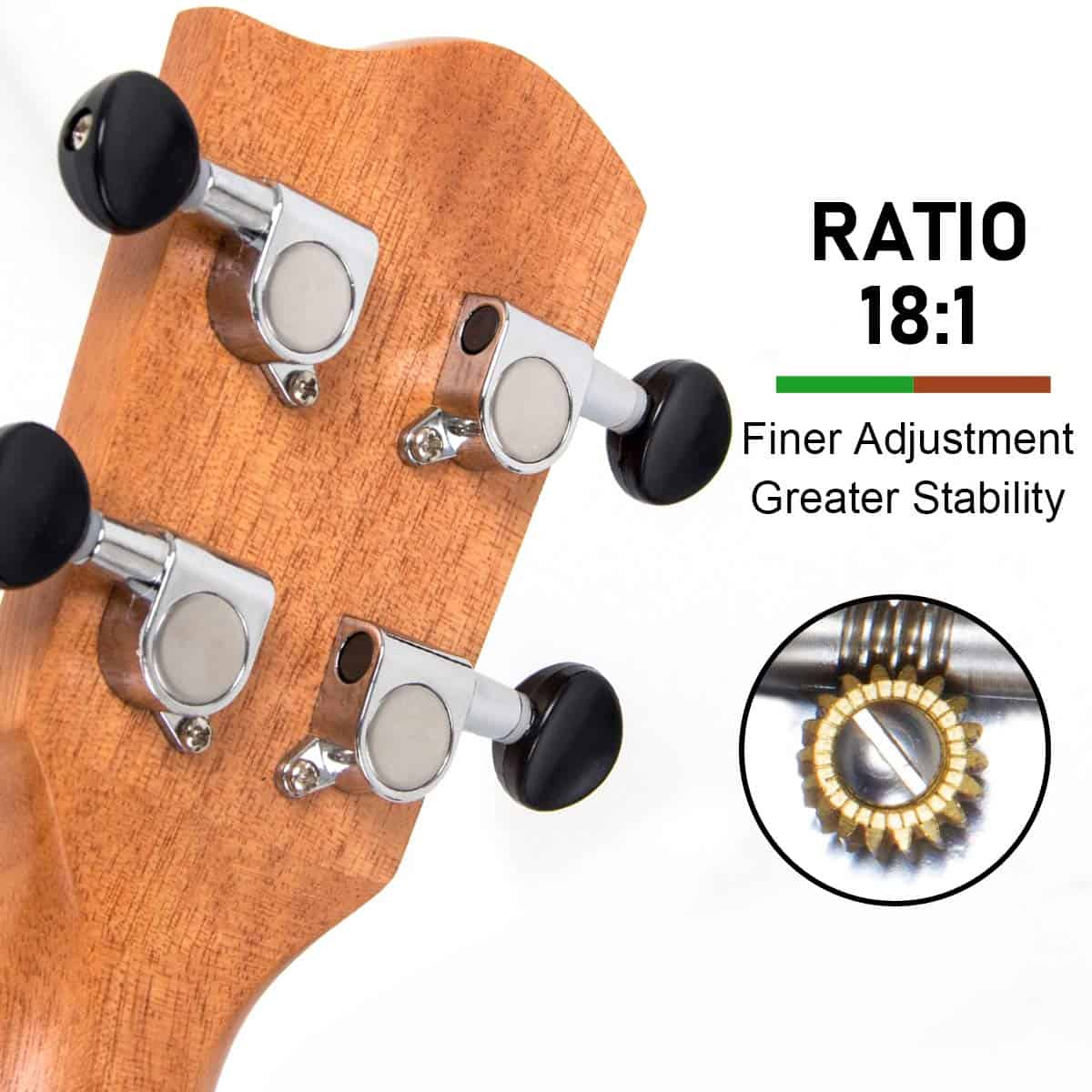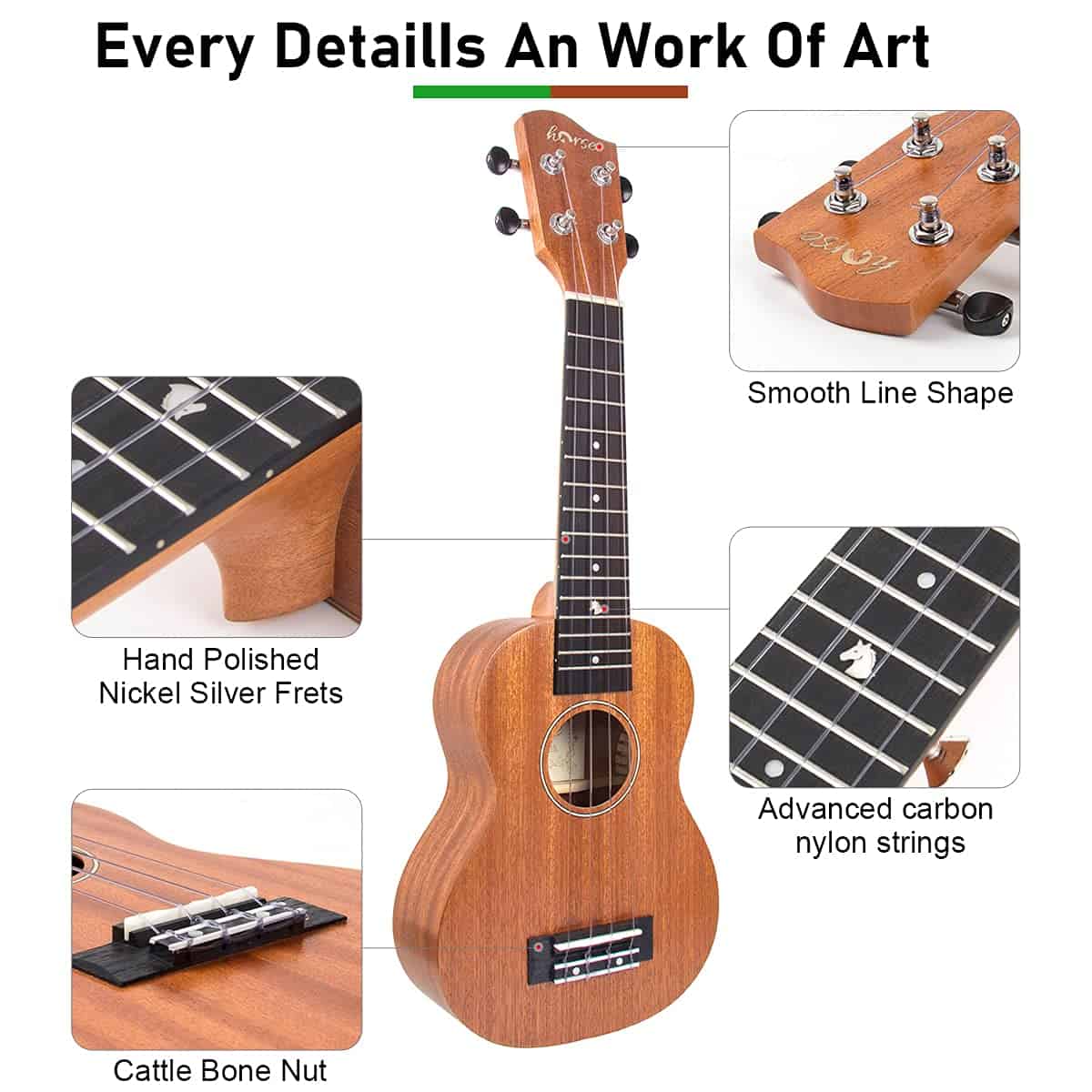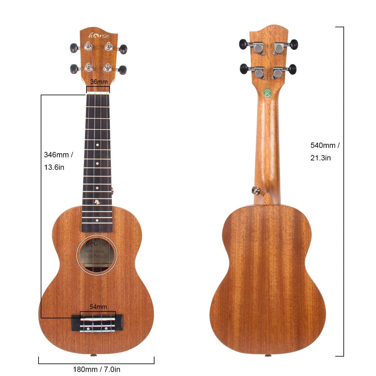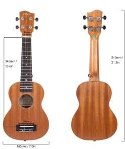 Forma del mástil: Forma de onda Clavijas de afinación: Selladas 18:1 de Engranaje de Cobre Puro Material de las Cuerdas: Nylon de marca Diapasón y Puente: Madera Técnica Tapa Trasera y Laterales del Cuerpo: Caoba AAA El paquete incluye: 1x Ukulele Soprano de 21″, 1x Bolsa de transporte forrada; 1x Capo de Ukulele de calidad; 1x Correa ancha: toca cómodamente de pie; 1x Paño de pulido de microfibra; 1x Juego extra de cuerdas por si necesitas reemplazarlas