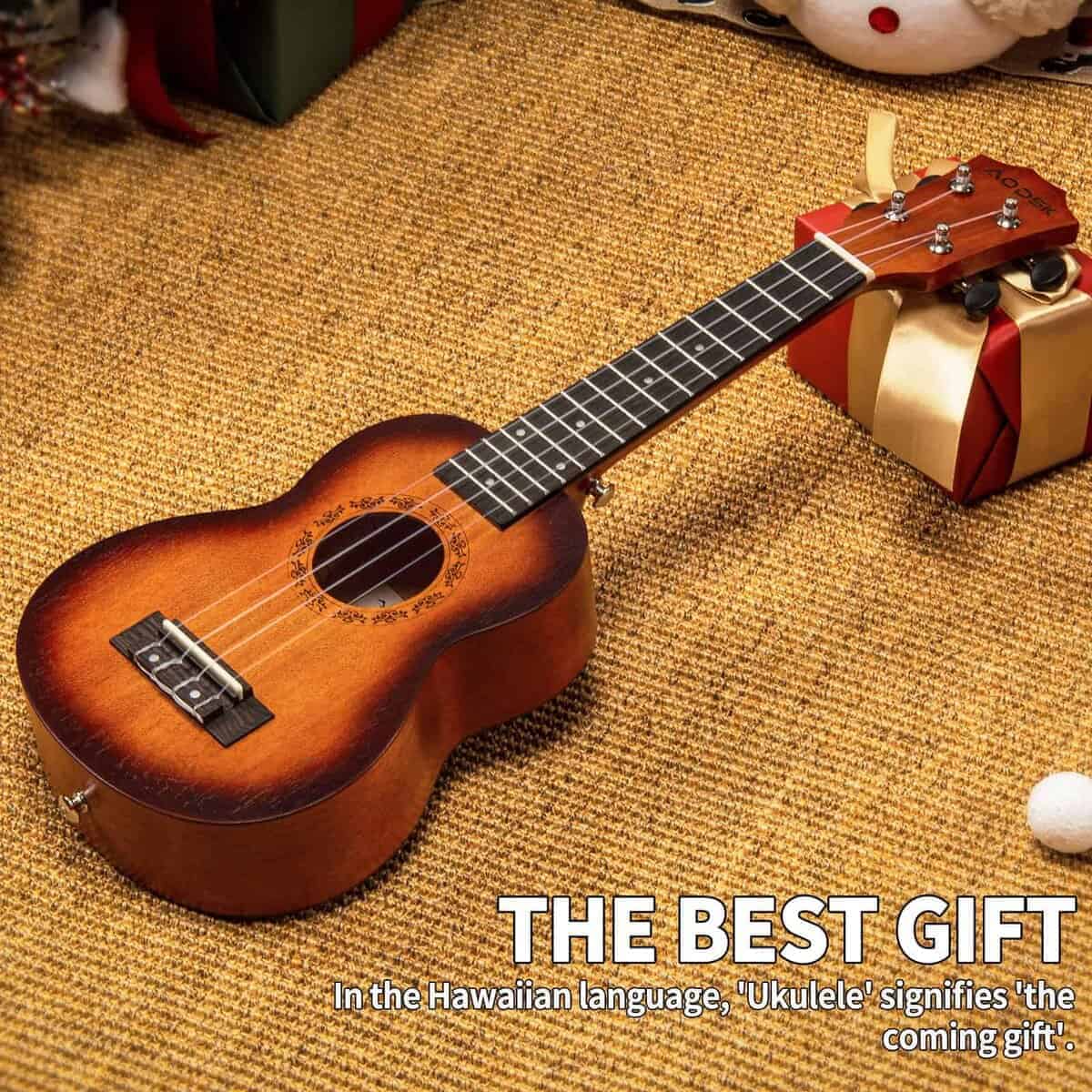 El Ukulele Soprano AODSK en color Sunburst es ideal para principiantes y músicos de todas las edades. Con una tecnología de producción exquisita, este ukulele ofrece un cuerpo de madera de sapeli liso que produce un sonido claro y agradable. El diapasón y puente de palisandro pulidos proporcionan una comodidad de juego excepcional. Además, la tapa y mástil de sapeli ofrecen un sonido más rico, brillante y cálido, mientras que la tuerca y selleta de resina de alta calidad junto con las 4 cuerdas de carbono de nailon aseguran una resonancia clara y hermosa con más sustain. Este ukulele viene con todos los accesorios que necesitas, incluyendo una funda, correa, cuerda de nylon y 4 púas. Es el regalo perfecto para cualquier ocasión, ya sea Navidad, cumpleaños o Año Nuevo. Añade un toque especial a tus festividades con este ukulele de alta calidad y disfruta de su suave y agradable sonido en cualquier lugar.