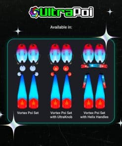UltraPoi’s Vortex Poi w/ UltraKnobs son los poi LED más brillantes y avanzados con botones programables que hayas girado. El set de poi Vortex Poi esta pensado para el spinner de todos los días. Construction de calidad enfocada en una configuración completamente ensamblada pero ajustable con mangos de LEDs de silicona ergonómicos para un agarre estable, y 2 LEDs Glow Balls fáciles de hacer clic que están protegidos por un estuche suave y duradero. 2 Poi en 1: El set de Poi incluye tanto UltraSocks como un UltraLeash para que puedas configurar tu poi de 2 maneras diferentes; ¡es como tener 2 sets de poi en 1! Mango de Luz: Creamos el único mango LED con carga USB en el mundo y ¡es increíble! El UltraKnob es súper brillante y duradero que te permitirá explorar nuevos movimientos y espectáculos de luces. Elije tus propios colores: Lo que realmente separa al Vortex Poi del resto es la capacidad de personalizar completamente tus patrones de luz con solo un botón. Elige entre 15 colores impresionantes. 12 Patrones de destellos fascinantes: Combina tantos colores como desees al mismo tiempo y combinalos con una de nuestras 12 opciones de patrones de destellos. 6 Modos de Color: Toneladas de impresionantes modos de color preestablecidos disponibles para explorar y todos pueden ajustarse para añadir estilo a tu giro. Especificaciones de Vortex Poi w/ UltraKnobs: 5″ altura x 3″ de diámetro | 180g por cabeza de poi | Requiere 2 baterias AAA reemplazables o recargables por cabeza de poi (no incluidas) | UltraKnob mide 23g, 38 mm de ancho, 28 mm de altura. Contenido del paquete: 2 x Pelotas LED de UltraPoi, 2 x Estuches Vortex, 2 x UltraSocks, 2 x Mangos de LEDs UltraKnob, 1 x UltraLeash y 1 x Bolsa de Equipo (Totalmente ensamblado, no requiere configuración adicional)