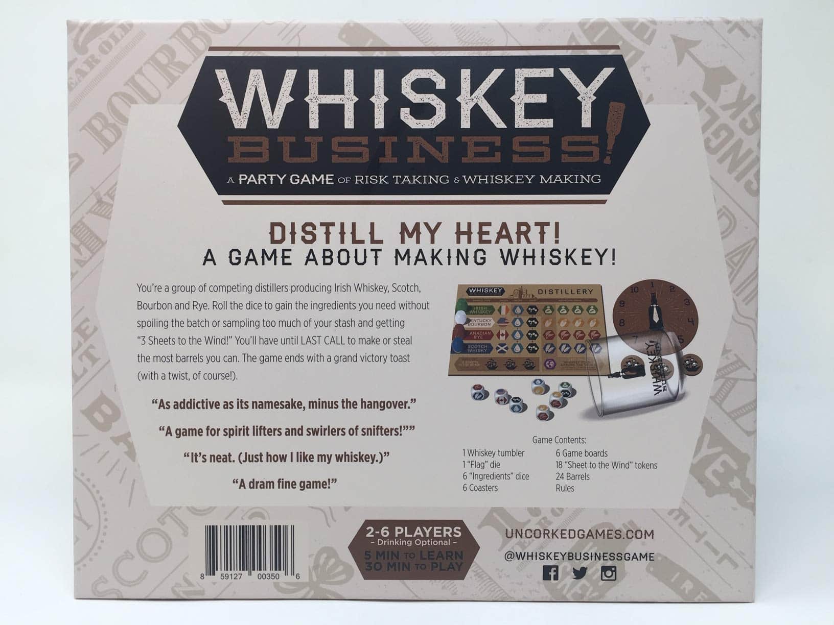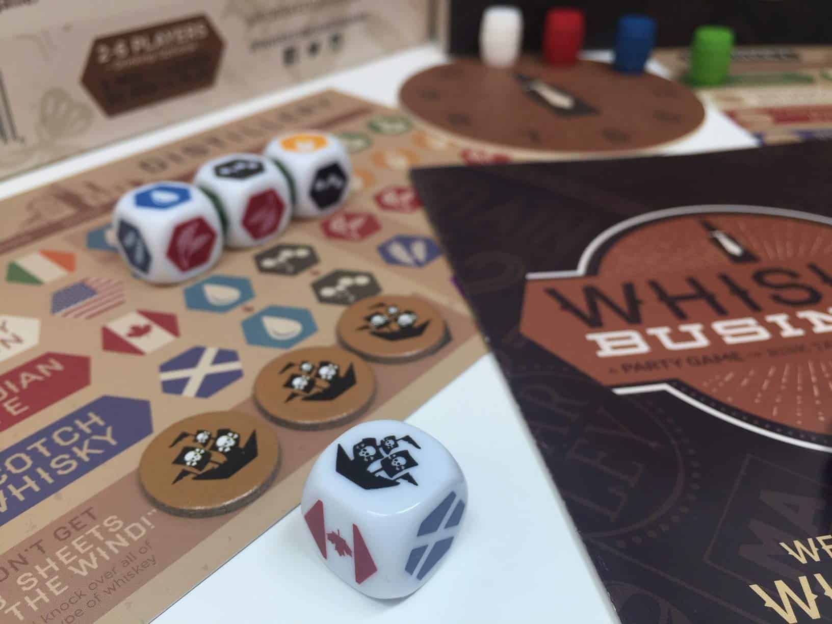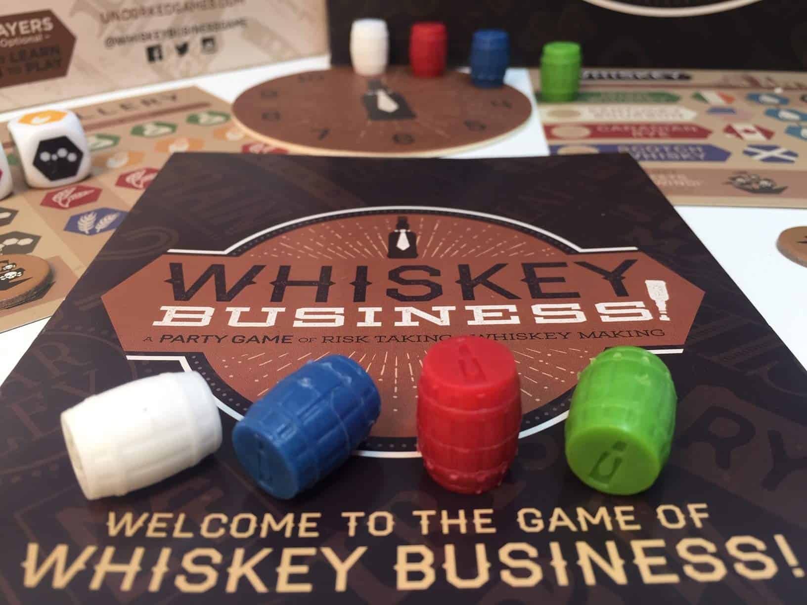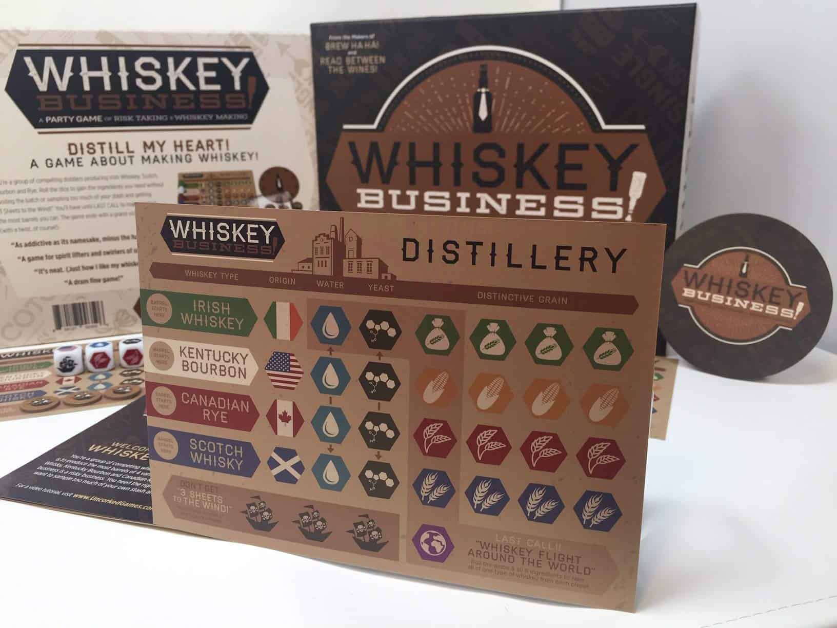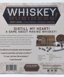 ¡Whiskey Business! es un adictivo juego de dados estratégico que se juega rápido! Eres un grupo de destiladores competidores que producen Whiskey Irlandés, Scotch, Bourbon y Centeno. ¡Tira los dados para obtener los ingredientes que necesitas sin arruinar la mezcla o probar demasiado de tu stock y llegar a 3 Sheets to the Wind! Tendrás hasta ÚLTIMA LLAMADA para hacer o robar la mayor cantidad de barriles posible. El juego termina con un brindis victorioso y grandioso (¡con un giro, por supuesto!)