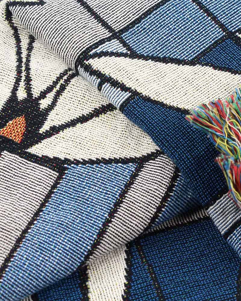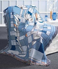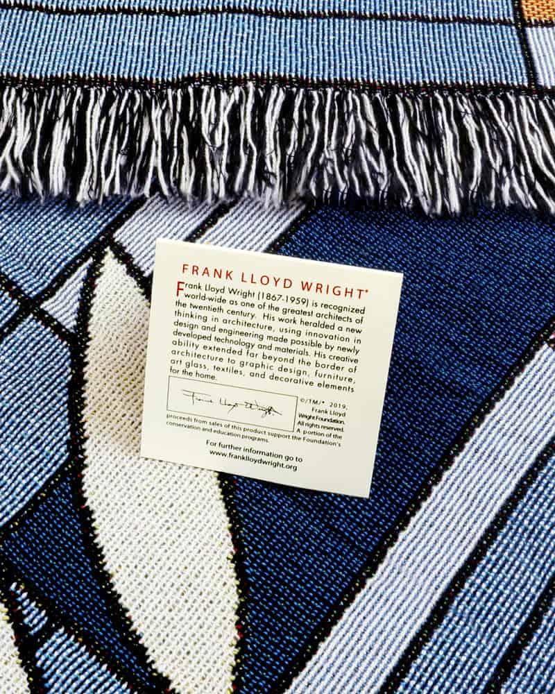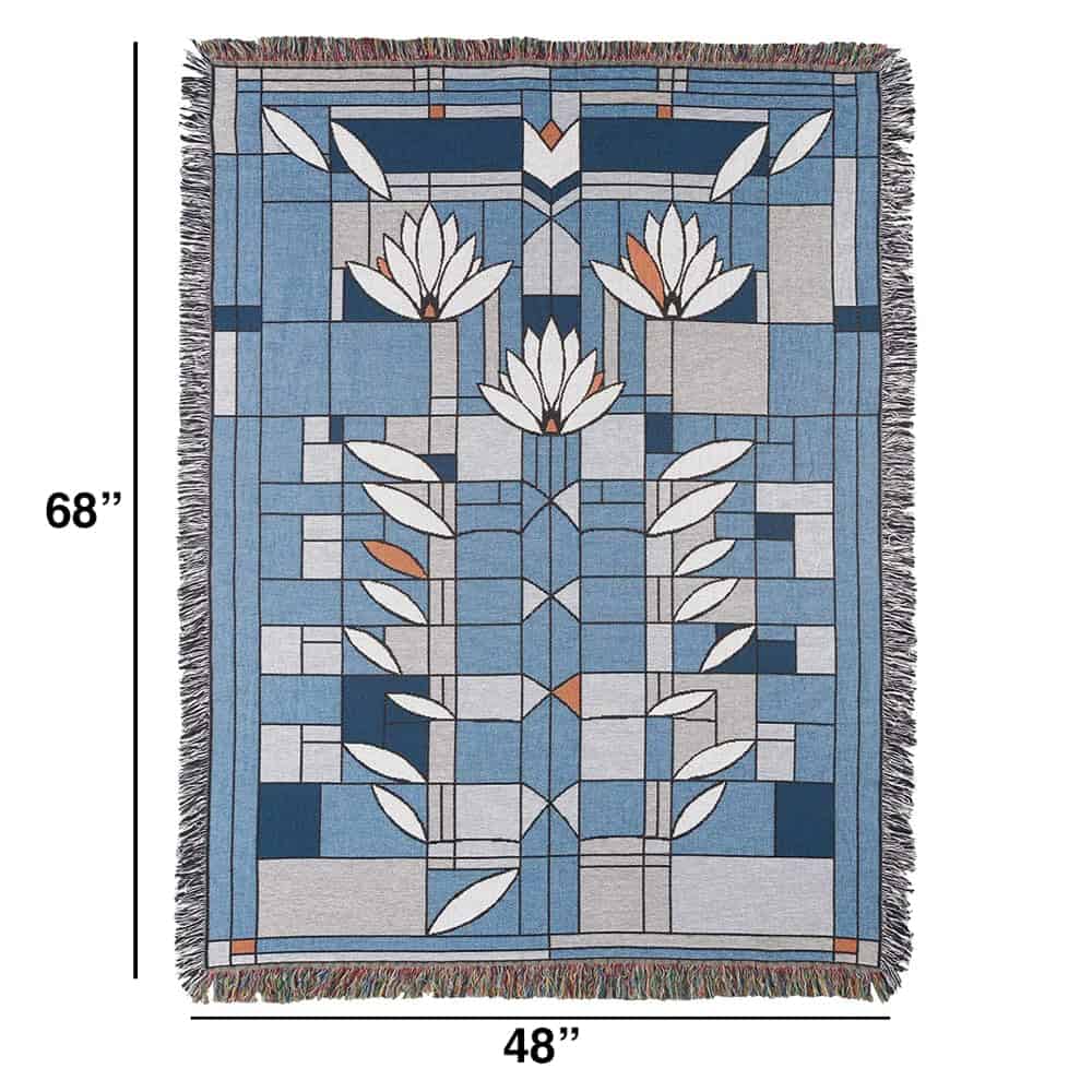 La Cobija de Tiro Waterlilies de Frank Lloyd Wright en Azul fue inspirada por un dibujo para una ventana que nunca se realizó. El elegante patrón muestra flores y hojas de lirio flotando en una piscina tranquila. Desarrollada en asociación con la Fundación Frank Lloyd Wright, la cobija mide 48″ x 68″. 100% algodón. Lavable y secable a máquina.
