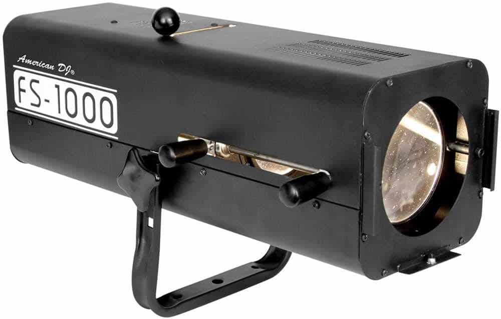American DJ FS 1000 Follow Spot que utiliza una lámpara halógena de 575 vatios como fuente de luz (salida similar a una lámpara de 1000 vatios, atenuación de 0-100% a bordo, iris y enfoque.