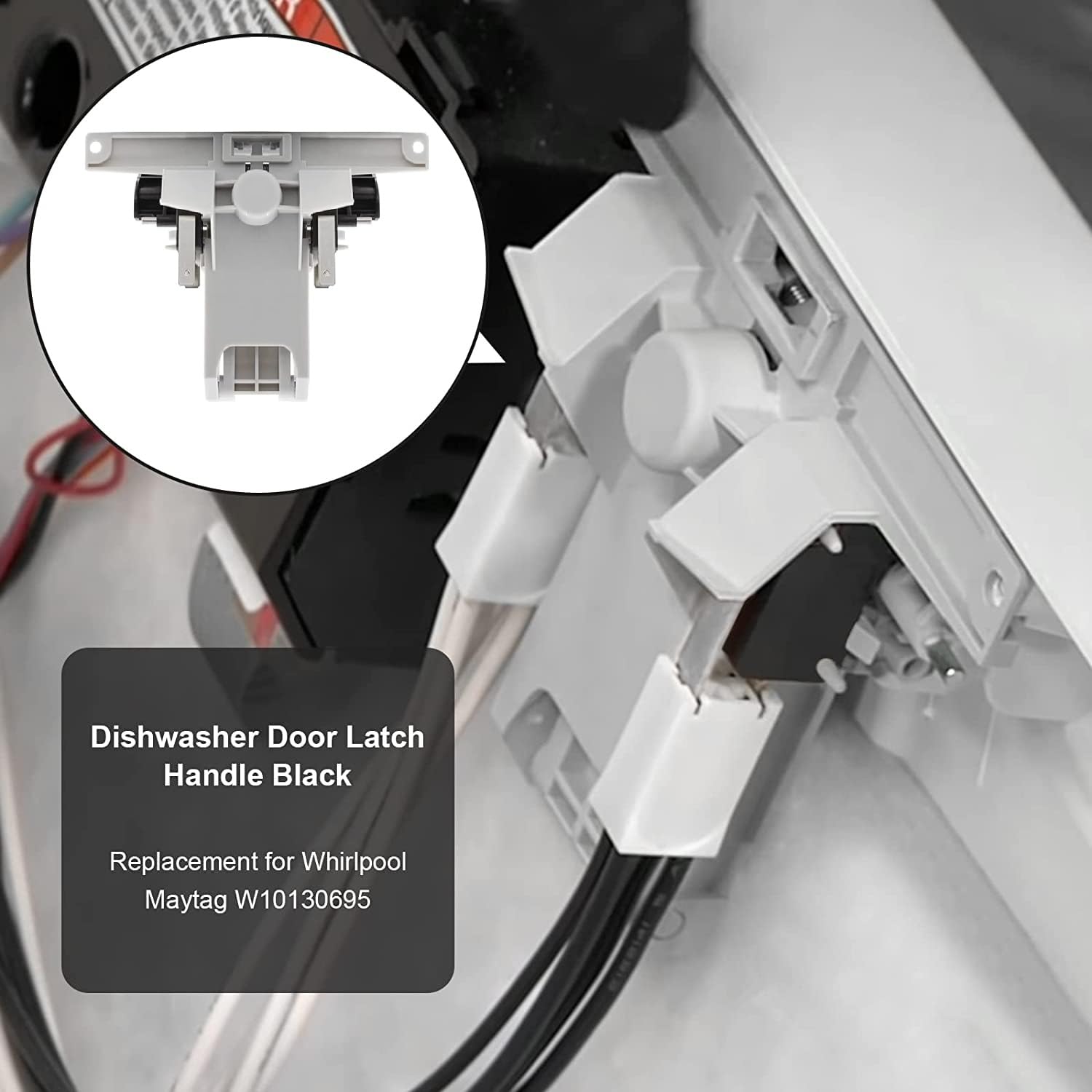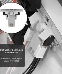 1. ¿Para qué sirve este producto? Esta es una pieza de repuesto para un lavavajillas Maytag. Esta manija de pestillo de puerta W10130695 está ubicada en la puerta de su lavavajillas. Esta pieza está hecha de plástico con pestillos de metal y se suministra con la manija negra. Si la puerta no se abre o cierra/ los interruptores de la puerta no se activan/ falla del pestillo de la puerta/ fuga, necesitará reemplazar este pestillo y manija de la puerta.