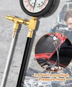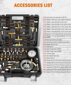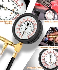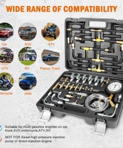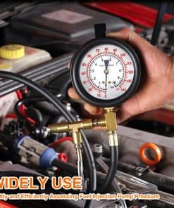 Kit de Prueba de Presión de Bomba de Inyección de Combustible Uprimu 0-140PSI es perfecto para comprobar la presión de los inyectores de combustible en vehículos. Con un marcador dual para lecturas precisas, con una escala de 140 PSI /10 Bar, este kit garantiza la exactitud en la medición de la presión. Viene en un estuche moldeado especialmente diseñado para facilitar el almacenamiento y la organización. Su acoplador rápido de conexión hace que la conexión con adaptadores sea rápida y eficiente. Incluye una variedad de adaptadores, mangueras y accesorios que cubren una amplia gama de sistemas de inyección de combustible y la mayoría de coches y camiones en todo el mundo. ¡Haz que la prueba de presión de inyección de combustible sea fácil y precisa con este kit de prueba de alta calidad!