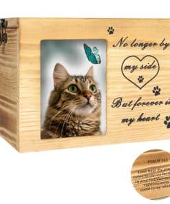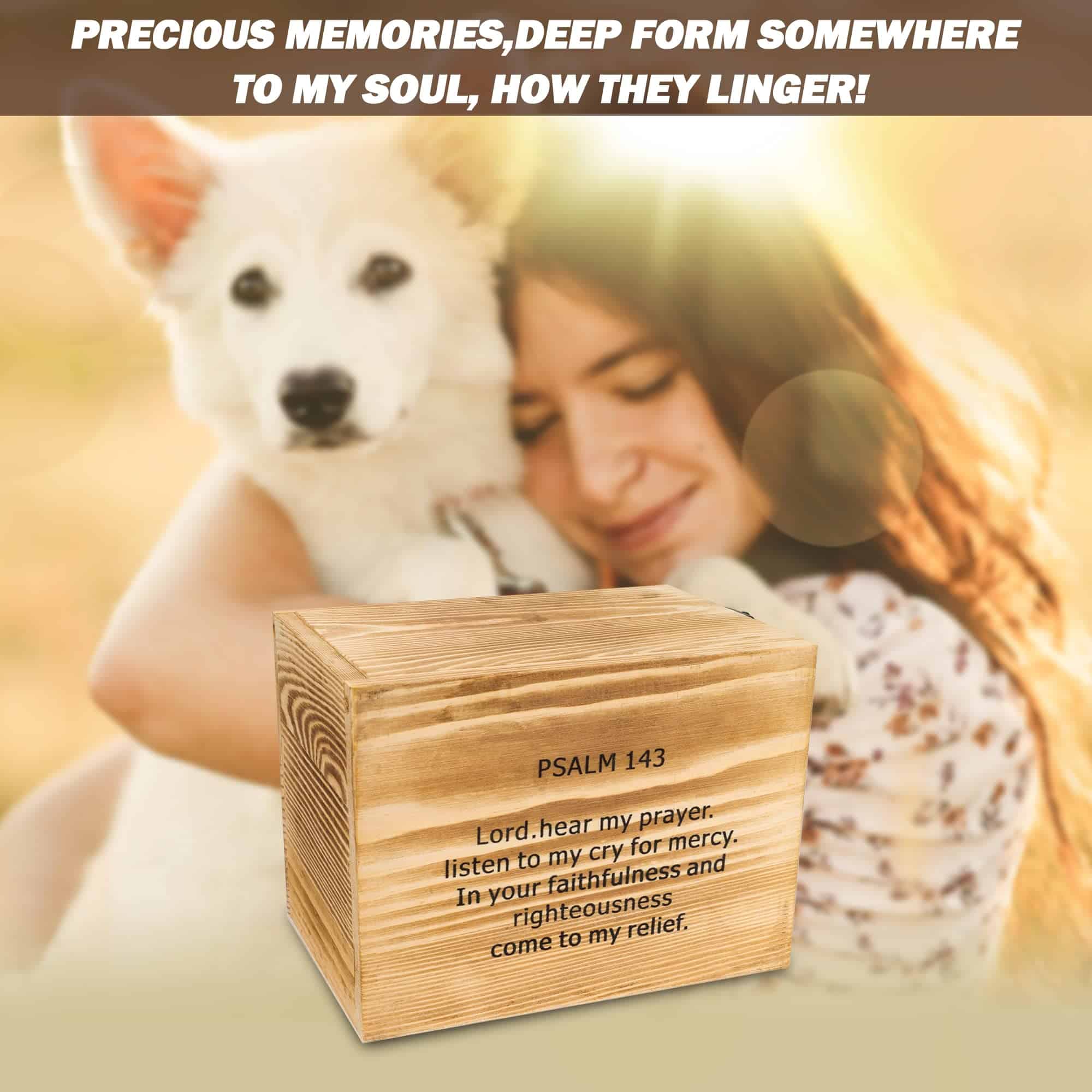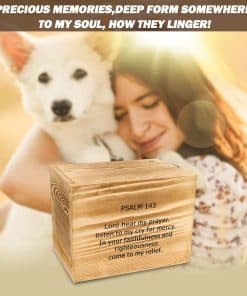 AMOR y MISERICORDIA: Recuerdos Preciosos, Profundamente de Algún Lugar a mi Alma, Cómo se Retienen. El Cantar de Antaño, Brillante-Cariño Derramándose, que las Oraciones aún nos Siguen. Como miembro de nuestra familia, el amigo honesto, Su fallecimiento te hace sorber la tristeza, lo cual es muy comprensible. Elegancia y Dignidad: Si bien es comprensible que nada puede reemplazar a la mascota perdida, uno de los mayores consuelos puede ser crear un recuerdo final digno y elegante en su memoria. Nuestro producto, un lugar de descanso final para su mascota, ofrece una forma suave de conmemorar a su miembro de la familia, quedarse en su pensamiento profundo sobre él / ella amado. Agradecidamente, Dios nos trae a Vencer la Tristeza y Obtener Paz en el Corazón. La muerte puede ser un corto sueño pasado, él / ella se despierta eternamente. Tamaño y capacidad: Adecuado para Caninos de Tamaño Pequeño / Mediano, Gatos u otros Animales Pequeños. Tamaño total: 6.3″ L x 4.3″ W x 4.7″ H, Volumen 127 pulgadas cúbicas. Tamaño interior: 5.6″ L x 3.74″ W x 4.13″ H, Volumen 86 pulgadas cúbicas, adecuado para cenizas de perros de hasta 35 lbs. Más Detalles: 1. Salmo bíblico en la parte posterior (opcional). 2. no teñido, hecho de madera de pino real con Proceso de Carbonización en Superficie para definir colores únicos. 3. interior de franela suave cubierto. 4. Cerradura en forma de U y tapa superior. 5. un marco de foto incorporado con una hoja de plástico transparente para proteger la foto y consejos metálicos para colocar la foto fácilmente y sostenerla firmemente. Consejos cálidos: 1. Debido a las diferentes pantallas de computadora y la particularidad de la madera natural, el color del objeto puede ser ligeramente diferente a la imagen de la lista. 2. Pino natural con algunas indentaciones naturales, pertenecen al crecimiento normal causado, no afectarán el uso del producto. 3. Los restos deben estar en una bolsa o contenedor duradero antes de descansar en la caja, ya que no es hermético.