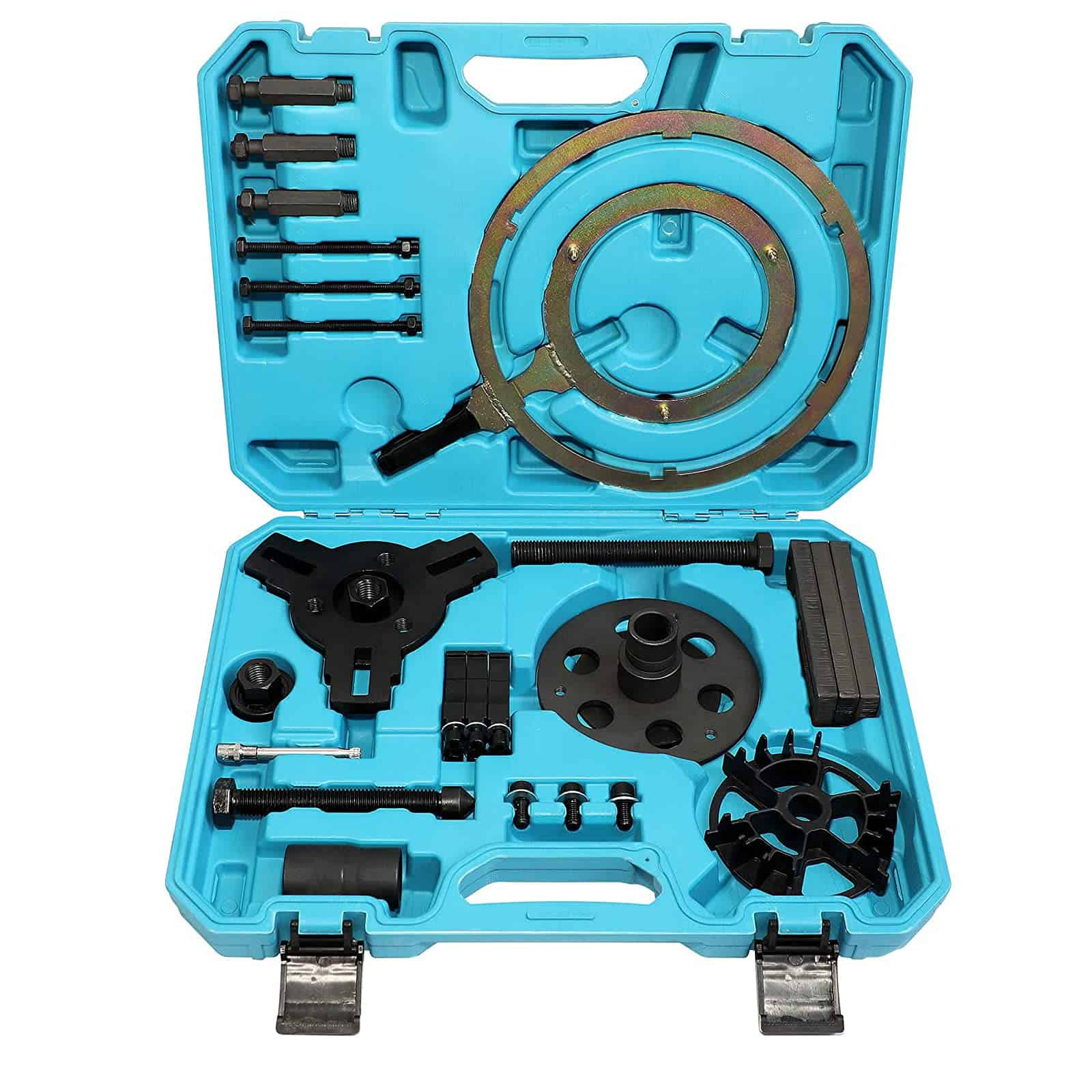 Diseñado especialmente para desmontar, instalar y reinstalar el doble embrague seco DPS6. Aplicable: compatible con Ford DPS6. Vehículos incluidos: compatible con Fiesta 2011-2019; Focus 2012-2018; Transit Connect 2019; B-MAX desde 2012, etc. Número de FM: 307675. Instrucciones para instalar un desbloqueo y cierre: Paso 1: Inserte el doble embrague bloqueado, colóquelo en el casquillo de montaje, instale los pies de extensión en tres lados para fijar los agujeros correspondientes y fije los pies de extensión. Desenrosque el tornillo y observe si está en su lugar. Cuando esté en su lugar, retire la herramienta e instale el aro de retención. Paso 2: Retire el motor en ambos lados, use la herramienta hexagonal para insertar los dientes del motor y gírelo en sentido contrario a las agujas del reloj hasta el final (se escucha un sonido de estallido al girar y el doble embrague se eleva ligeramente). Gire el otro lado nuevamente en sentido contrario a las agujas del reloj. Finalmente, instale el motor. En este punto, el doble embrague ha sido desbloqueado y puede ser cargado.