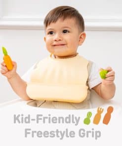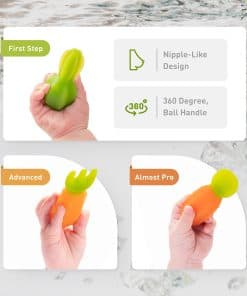 Vajilla de aprendizaje para bebés Lollipop, juego de utensilios de aprendizaje escalonados (pre cuchara fácil, tenedor para bebé, cuchara para bebé) en color vegetariano. ¡Una simple lección de agarre dará como resultado mejores habilidades para sostener la cuchara/tenedor! La vajilla para bebés Lollipop está diseñada para ayudar a los niños a aprender y hacer el atrevido paso de usar cucharas y tenedores de adultos; Vajilla de aprendizaje paso a paso para niños; ¡Ayuda a tu bebé a aprender desde cero hasta convertirse en un héroe! Las protuberancias tipo puntos en el mango ayudan a los bebés de 8 meses con la percepción multisensorial (visuo-táctil); Los nodos estimulan diferentes áreas palmares y aceleran la integración sensorial; Esto ayuda al bebé a concentrarse mejor y recordar lo que aprendió. La pre-cuchara para destete autónomo infantil es muy fácil de agarrar para tu hijo. Su mango hexagonal biónico admite todos los estilos de agarre. Lollipop diseñó la vajilla para manos pequeñas que se adaptan perfectamente a las fases de desarrollo de la mano del niño. Herramientas de aprendizaje para comer por sí mismo del bebé hechas de material de silicona seguro y suave de grado alimenticio; Bordes suaves y lisos para promover la seguridad del niño durante la alimentación; Se desempeña bien a alta temperatura para ayudar a desinfectar los utensilios del bebé; Sin productos químicos desagradables, libre de BPA, plomo, ftalatos y otros materiales dañinos. Cuando tus hijos se gradúen usando la cuchara regular, puedes almacenarlos para tu próximo niño pequeño o regalarlos a amigos con recién nacidos que estén aprendiendo a alimentarse solos; La superficie lisa facilita la limpieza. Hiérvelos durante 2 minutos para limpiar, lávalos a mano o en el estante superior de tu lavavajillas; No es fácil de romper.