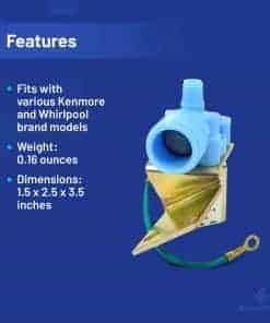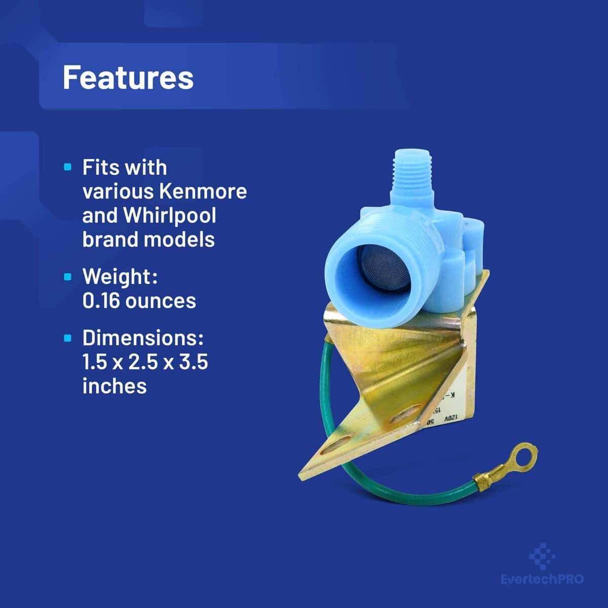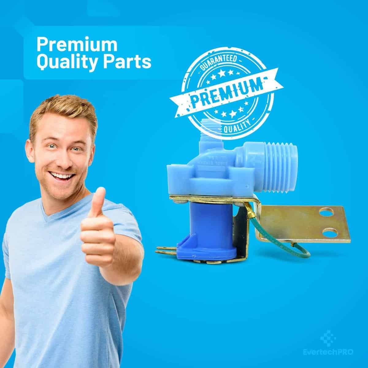 La Válvula de Agua de Repuesto para Refrigerador EvertechPRO, número de parte 4318047, reemplaza a múltiples números de parte. Este producto es equivalente funcional a las especificaciones OEM y viene en un empaque original. No es un producto OEM de Whirlpool, pero es compatible con varios modelos de refrigeradores Whirlpool. El uso de los nombres comerciales y logotipos de los fabricantes son marcas registradas de sus respectivos propietarios. Cualquier uso de la marca del fabricante, números de parte o designación de modelos para este producto se hace únicamente con fines de demostración y compatibilidad de identificación, y se muestran únicamente con fines descriptivos. Su uso no está asociado, no implica ninguna afiliación o respaldo de ningún fabricante.