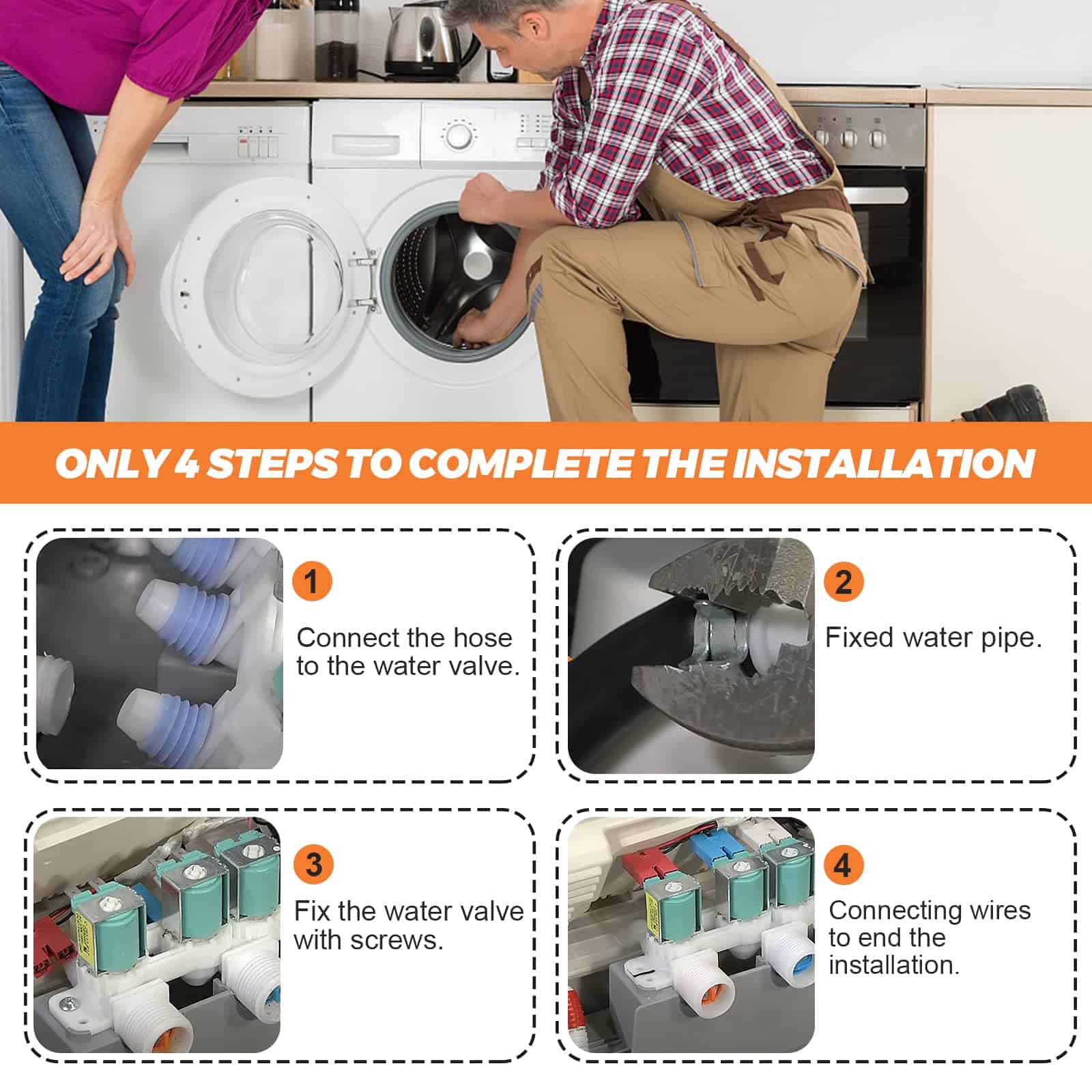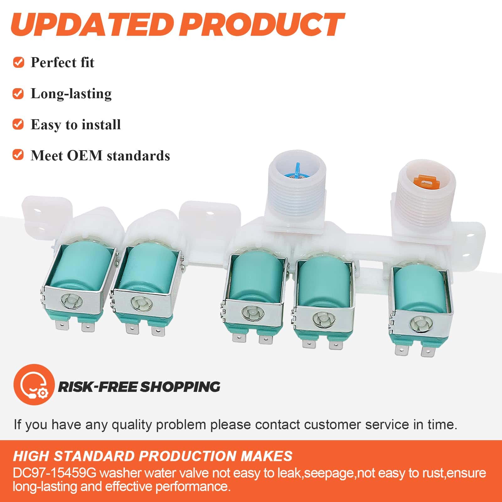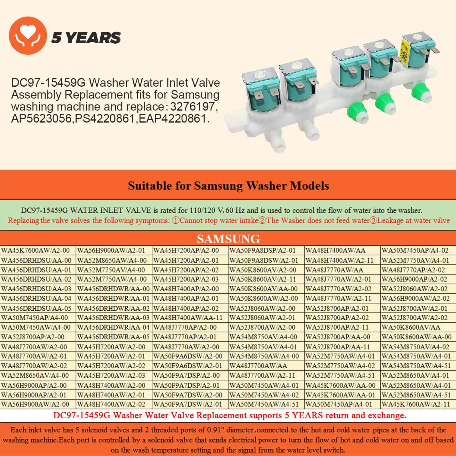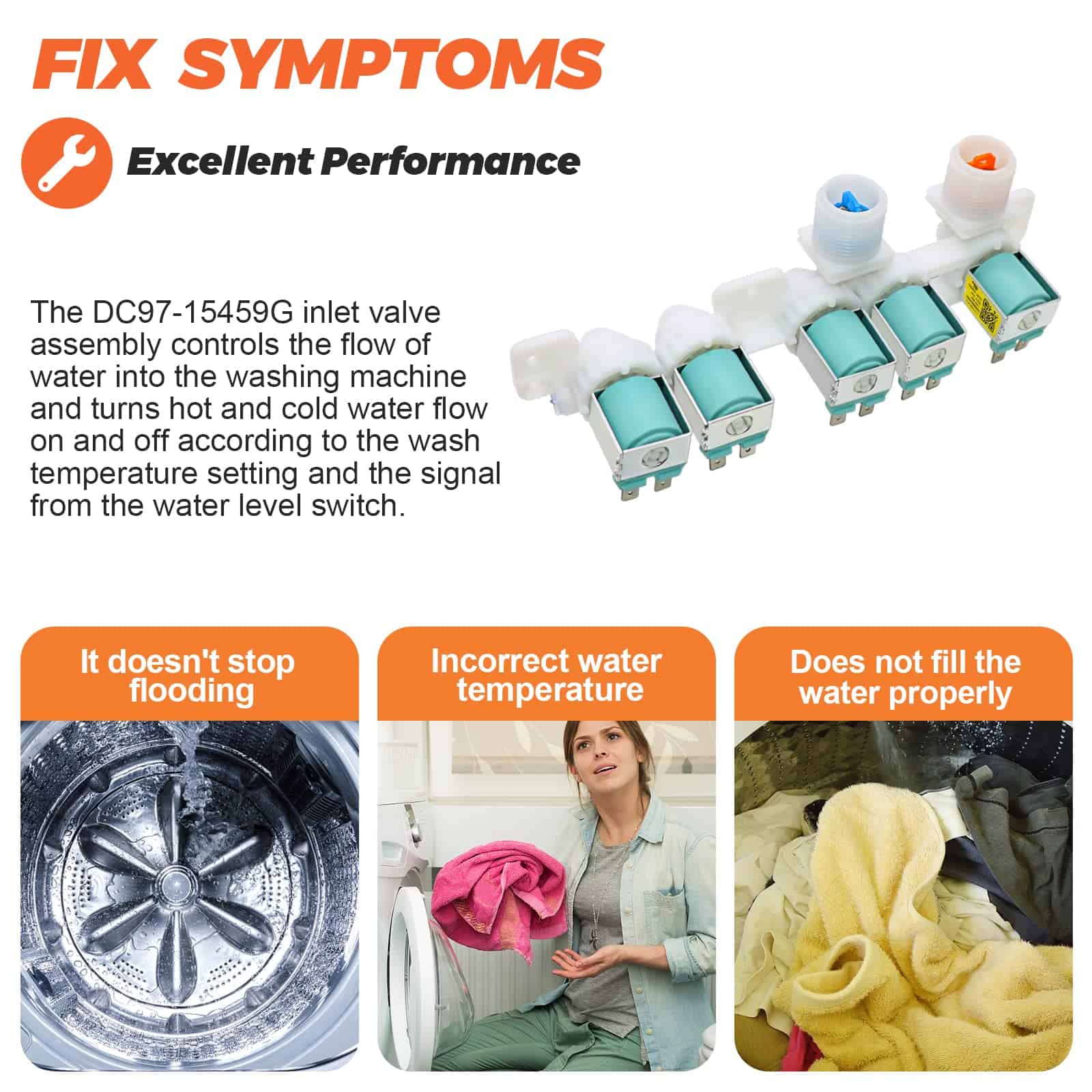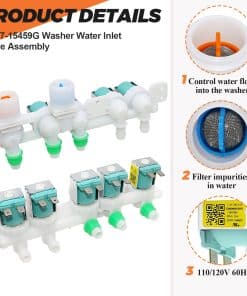 PRODUCT DESCRIPTION: La válvula de entrada de agua DC97-15459G controla el flujo de agua hacia la lavadora. PACKAGE INCLUDE: 1Pc DC97-15459G Válvula de Entrada de Agua. FIXES THE FOLLOWING SYMPTOMS: Válvula de entrada de agua dañada, fuga de agua caliente en la mezcladora de la válvula. WORKS WITH MOST BRANDS: Samsung. WORKS WITH THE FOLLOWING MODELS NUMBER: Samsung: WA45K7600AW/A2-00 Lavadora, Samsung: WA456DRHDSU/AA-00 Lavadora, Samsung: WA456DRHDSU/AA-01 Lavadora, Samsung: WA456DRHDSU/AA-02 Lavadora, Samsung: WA456DRHDSU/AA-03 Lavadora, Samsung: WA456DRHDSU/AA-04 Lavadora, Samsung: WA456DRHDSU/AA-05 Lavadora, Samsung: WA50M7450AP/A4-00 Lavadora, Samsung: WA50M7450AW/A4-00 Lavadora, Samsung: WA52J8700AP/A2-00 Lavadora, Samsung: WA48J7700AW/A2-00 Lavadora, Samsung: WA48J7700AW/A2-01 Lavadora, Samsung: WA48J7700AW/AA 4.8 Cuft Activewash Top Load Washer, Samsung: WA48J7700AW/A2-11 4.8 Cuft Top Load Washer, Samsung: WA50M7450AW/A4-01 5.0 Cu. Ft. High-Efficiency Top-Loading Washer and more. PLEASE NOTE: Note que las piezas de electrodomésticos pueden verse similares en muchas formas. Si no está seguro de si una pieza que está ordenando se ajusta a su modelo, por favor envíenos un correo electrónico antes de ordenar. Incluya su número de modelo y número de serie. Podemos verificar que la pieza se ajustará a su modelo.