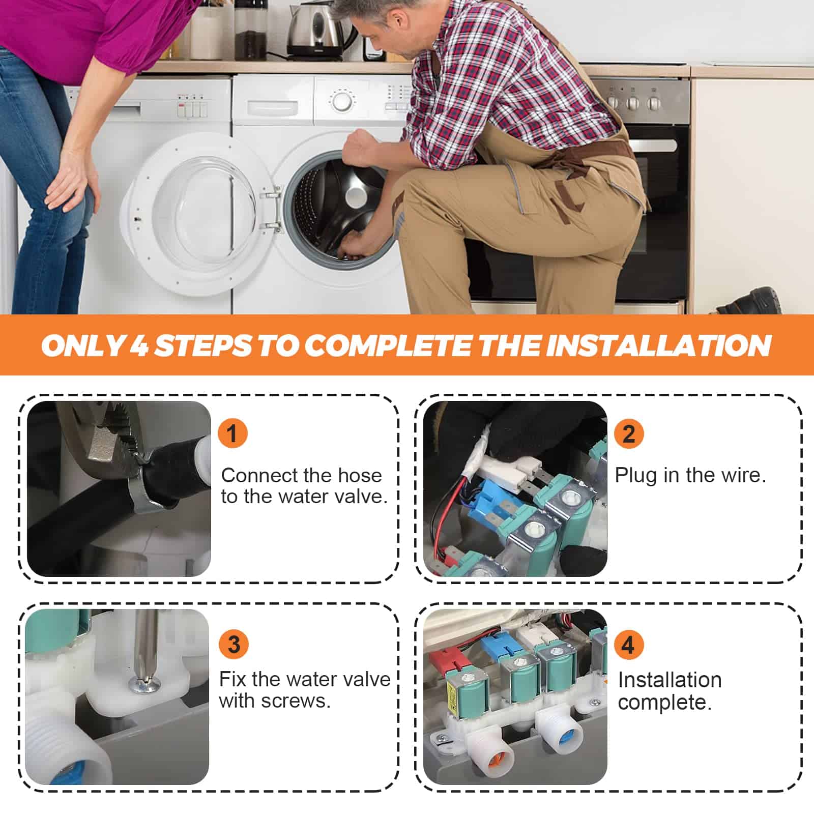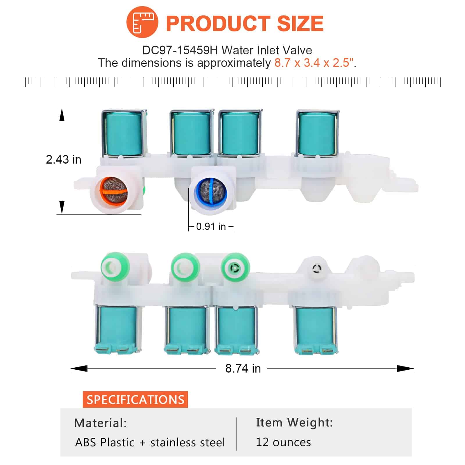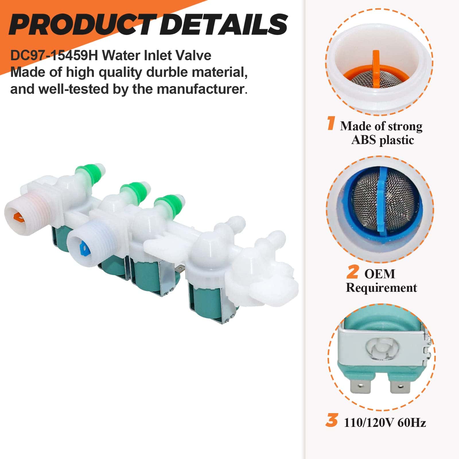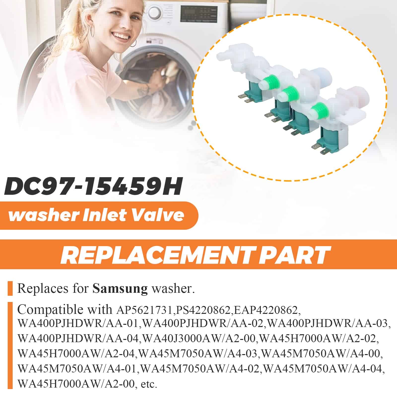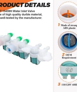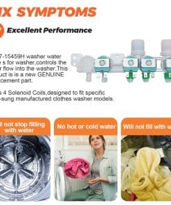 PRODUCTO: Válvula de entrada de agua para lavadora. Este es un repuesto nuevo y GENUINO de Samsung que está hecho de material duradero de alta calidad y probado por el fabricante. Asegura un rendimiento duradero y efectivo. INCLUYE: 1 Pc Válvula de entrada de agua DC97-15459H. SOLUCIONA LOS SIGUIENTES SÍNTOMAS: No se detiene al llenarse de agua, no hay agua fría o caliente, la lavadora gotea, no se llena de agua, hace ruidos. FUNCIONA CON LA MAYORÍA DE LAS MARCAS: Samsung. COMPATIBLE CON LOS SIGUIENTES MODELOS: Samsung: WA400PJHDWR/AA-01, WA400PJHDWR/AA-02, WA400PJHDWR/AA-03, WA400PJHDWR/AA-04, WA40J3000AW/A2-00, WA45H7000AW/A2-02, WA45H7000AW/A2-04, WA45M7050AW/A4-03, WA45M7050AW/A4-00, WA45M7050AW/A4-01, WA45M7050AW/A4-02, WA45M7050AW/A4-04 y más. NOTA: Las piezas de electrodomésticos pueden parecer similares en muchos aspectos. Si no está seguro de si las piezas que está ordenando son compatibles.