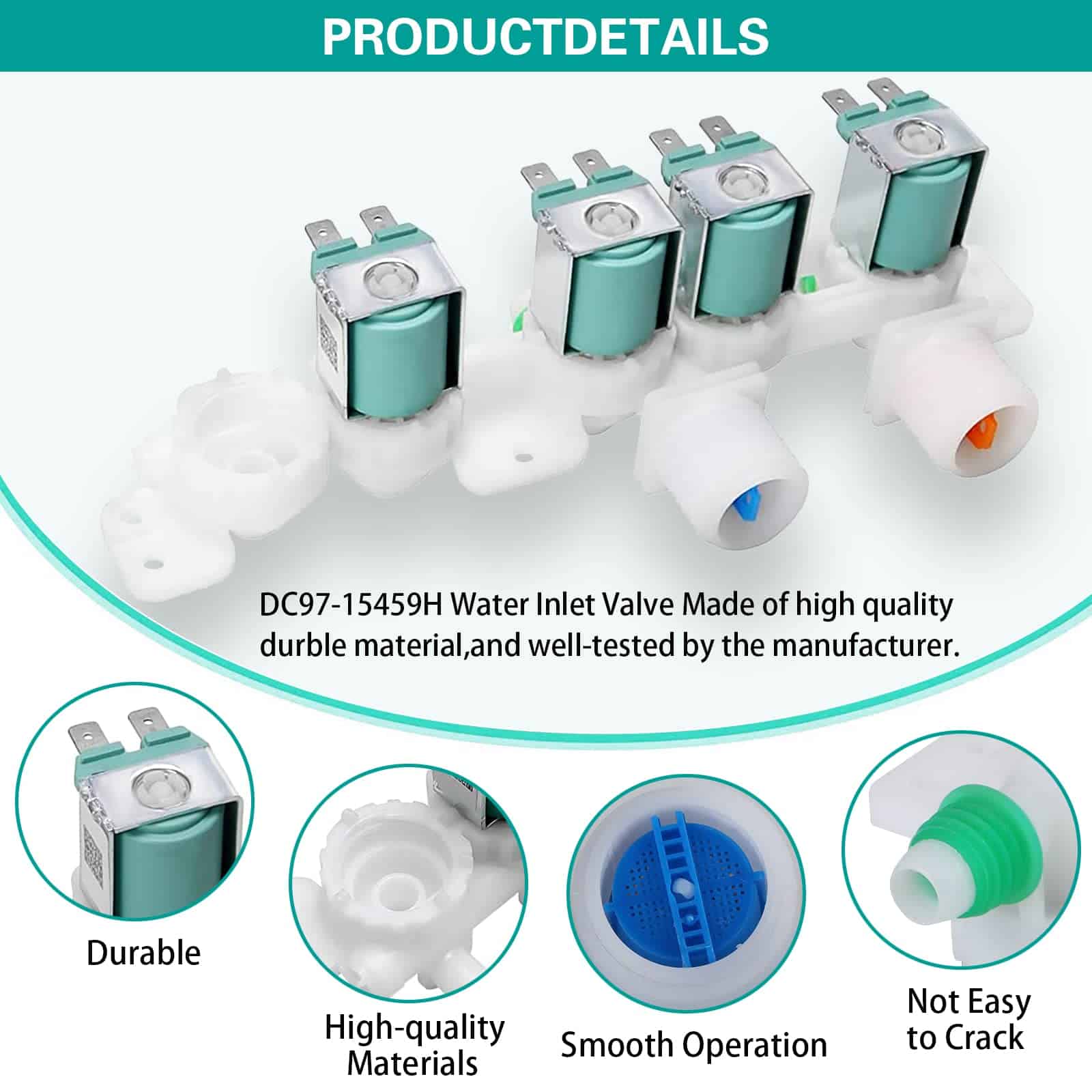 1. Función: La válvula de entrada de agua DC97-15459H es ideal para lavadoras, controla el flujo de agua hacia la lavadora. El voltaje es AC 110/120V y la potencia es de 60Hz, las dimensiones son aproximadamente 8.7 x 3.4 x 2.5 pulgadas. Tiene 4 bobinas solenoides, diseñadas para adaptarse a modelos específicos de lavadoras fabricadas por Samsung.