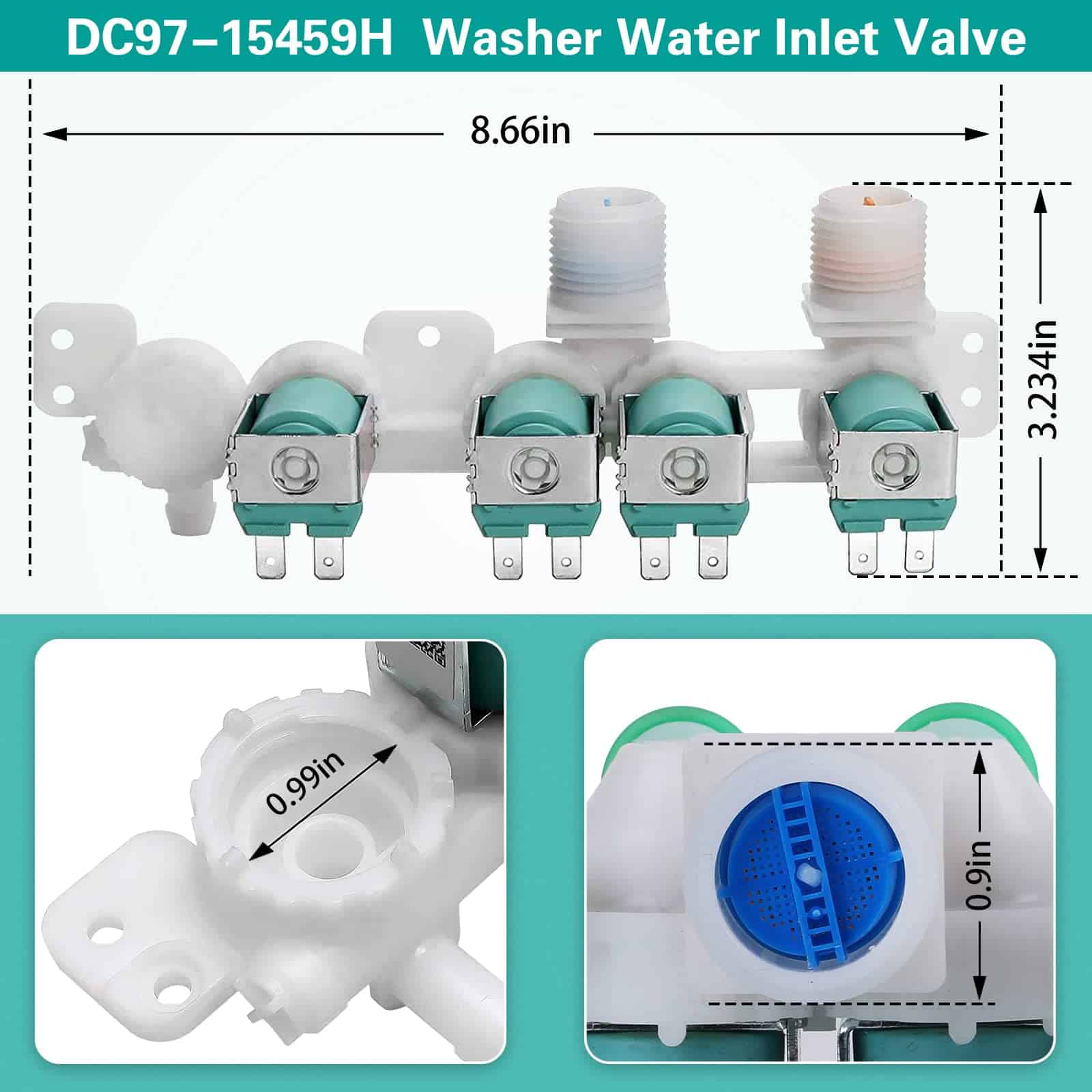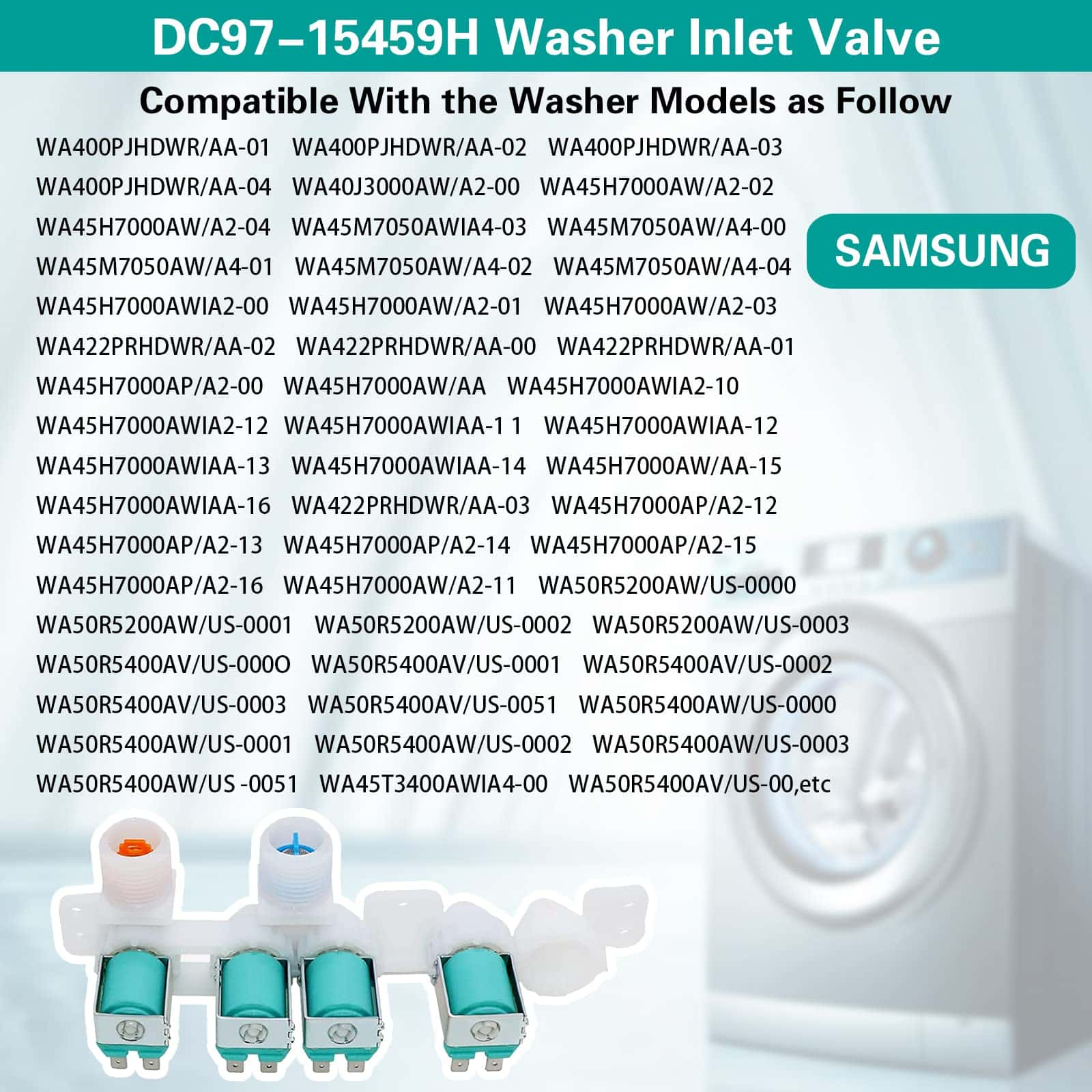 5. Modelos detallados compatibles: la Válvula de entrada de agua DC97-15459H para lavadora se ajusta a: WA400PJHDWR, WA422PRHDWR, WA45H7000AP, WA45H7000AW, WA45M7050AW, WA50R5200AW, WA50R5400AV, WA50R5400AW y más