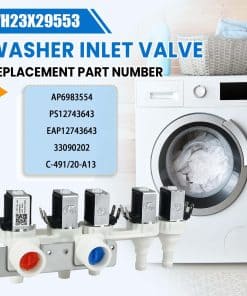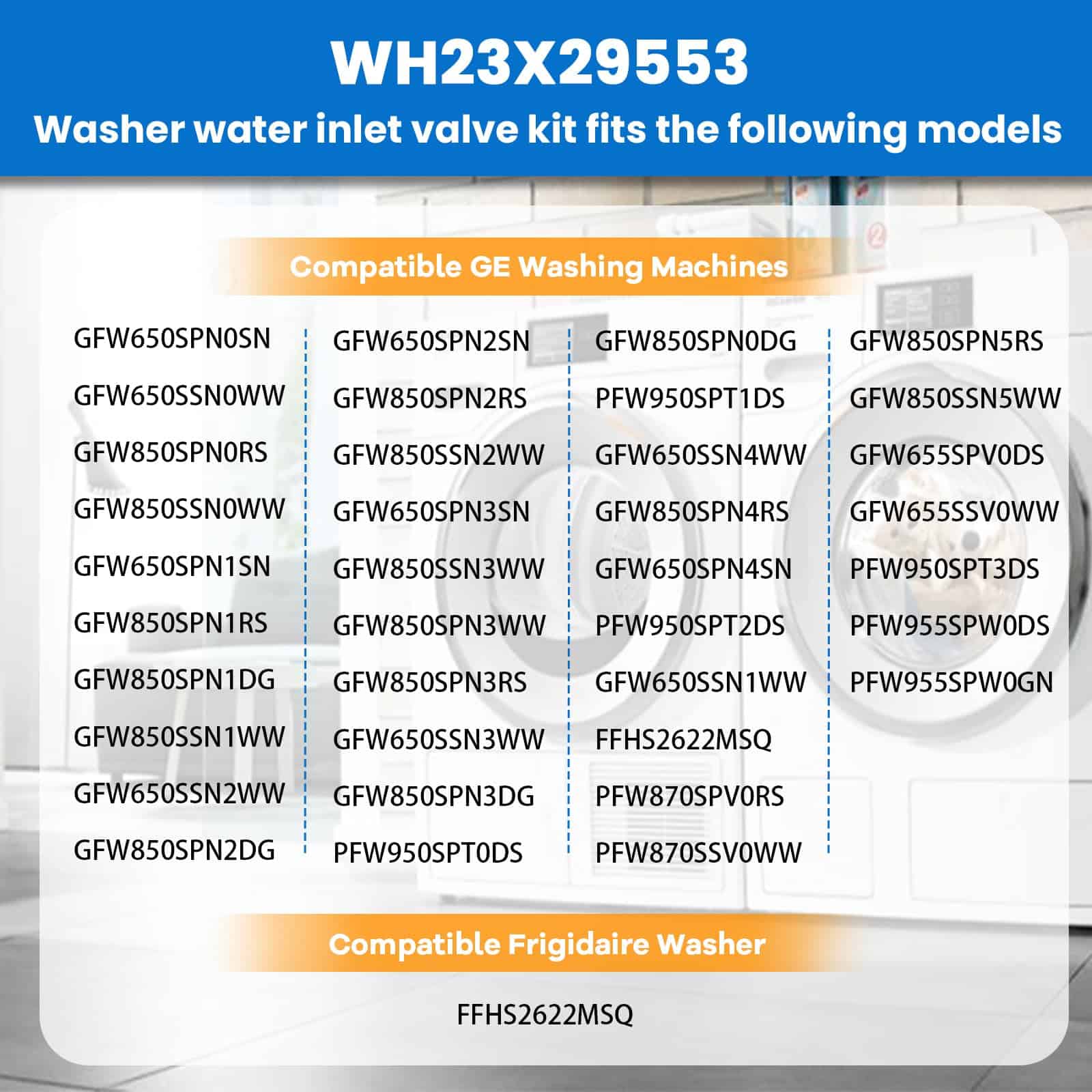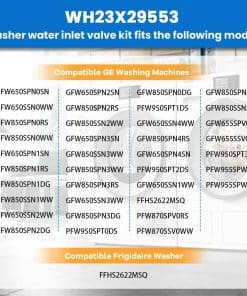 La válvula de entrada de agua WH23X29553 se puede reemplazar con los siguientes modelos: AP6983554, PS12743643, EAP12743643, 33090202, C-491/20-A13. Compatible con los siguientes modelos de lavadoras GE: GFW650SPN0SN, GFW650SSN0WW, GFW850SPN0RS, GFW850SSN0WW, GFW650SPN1SN, GFW850SPN1RS, GFW850SPN1DG, GFW850SSN1WW, GFW650SSN2WW, GFW850SPN2DG, GFW650SPN2SN, GFW850SPN2RS, GFW850SSN2WW, GFW650SPN3SN, GFW850SSN3WW, GFW850SPN3RS, GFW650SSN3WW, GFW850SPN3DG, PFW950SPT0DS, GFW850SPN0DG, PFW950SPT1DS, GFW650SSN4WW, GFW850SPN4RS, GFW650SPN4SN, PFW950SPT2DS, GFW650SSN1WW, FFHS2622MSQ, PFW870SPV0RS, PFW870SSV0WW, GFW850SPN5RS, GFW850SSN5WW, GFW655SPV0DS, GFW655SSV0WW, PFW950SPT3DS, PFW955SPW0DS, PFW955SPW0GN. Esta válvula soluciona síntomas como ruido al llenarse la lavadora, flujo de agua anormal, fuga de agua, temperatura incorrecta y código de error, etc. Hecha de plástico ABS y metal de acero inoxidable de alta calidad, esta válvula de entrada de agua para lavadoras WH23X29553 es duradera. Los estrictos estándares de producción hacen que las juntas de la válvula de agua estén mejor procesadas, lo que hace que la válvula de agua sea menos propensa a fugas de agua, filtraciones de agua y óxido, prolongando la vida útil.