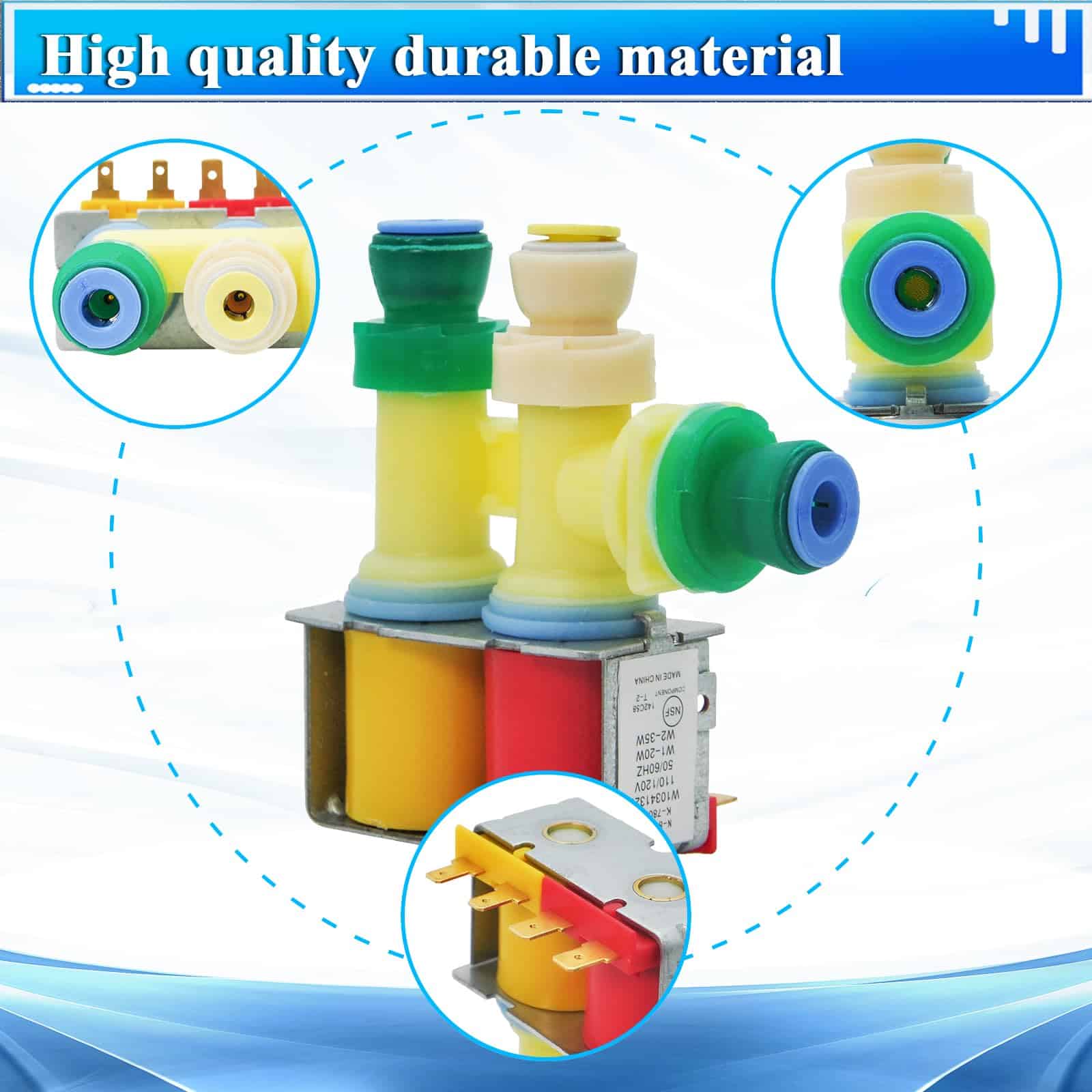 Especificaciones Voltaje: 110/120V Frecuencia: 50/60Hz Potencia: W1 20W, W2 35W Función: Esta es la nueva válvula de agua para refrigerador W10341320, que puede ayudarle a solucionar problemas como la imposibilidad de hacer hielo, no suministrar agua al refrigerador, flujo de agua deficiente, fugas de agua, etc. Textura: La válvula de agua para refrigerador WPW10341320 está hecha de materiales de alta durabilidad y alta calidad y tiene una vida útil más larga, lo que significa que le ahorrará tiempo y dinero.