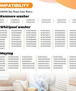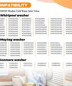 MODELOS COMPATIBLES: La válvula de entrada de agua fría W10240949 y la válvula de entrada de agua caliente W10240948 son compatibles con las lavadoras Kenmore: 11026002010, 11026002011, 11026002012, 11026012010, 11026012011, 11026012012, 11026112310, etc. La válvula de entrada de agua fría W10240949 y la válvula de entrada de agua caliente W10240948 son compatibles con las lavadoras Whirlpool: 7MWTW5500XW0, 7MWTW5500XW1, 7MWTW5500XW2, 7MWTW5550YW0, 7MWTW5550YW1, 7MWTW5550YW2, 7MWTW5560YW0, 7MWTW5700YW0, 7MMVWX500YW0, 7MMVWX500YW1, 7MMVWX500YW2, 7MMVWX510YW0, 7MMVWX510YW1, 7MMVWX550YW0, 7MMVWX655EW0, etc. La válvula de entrada de agua W11168740 y W11168743 es compatible con la lavadora Maytag MVWX550XW1, MVWX550XW2, MVWX500BW0, MVWX500XL0 MVWX500XL1, MVWX500XL2, MVWX500XW0, MVWX500XW1, MVWX500XW2, MVWX550XW0, MVWX5SPAW0, MVWX600BW0, etc.