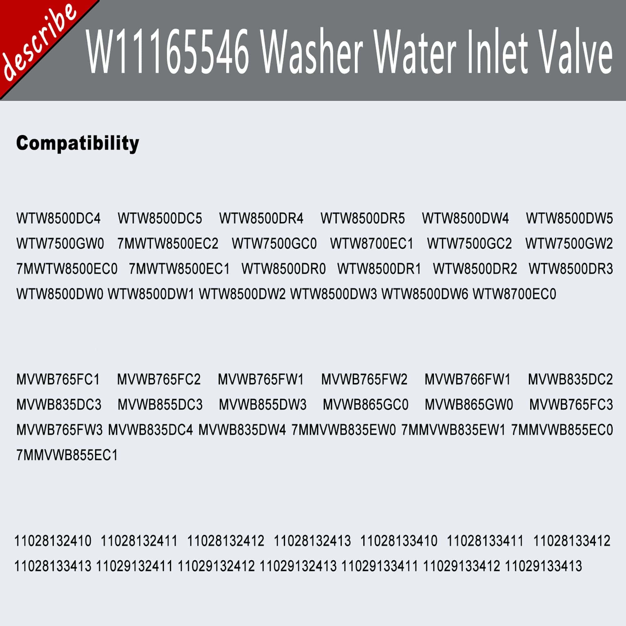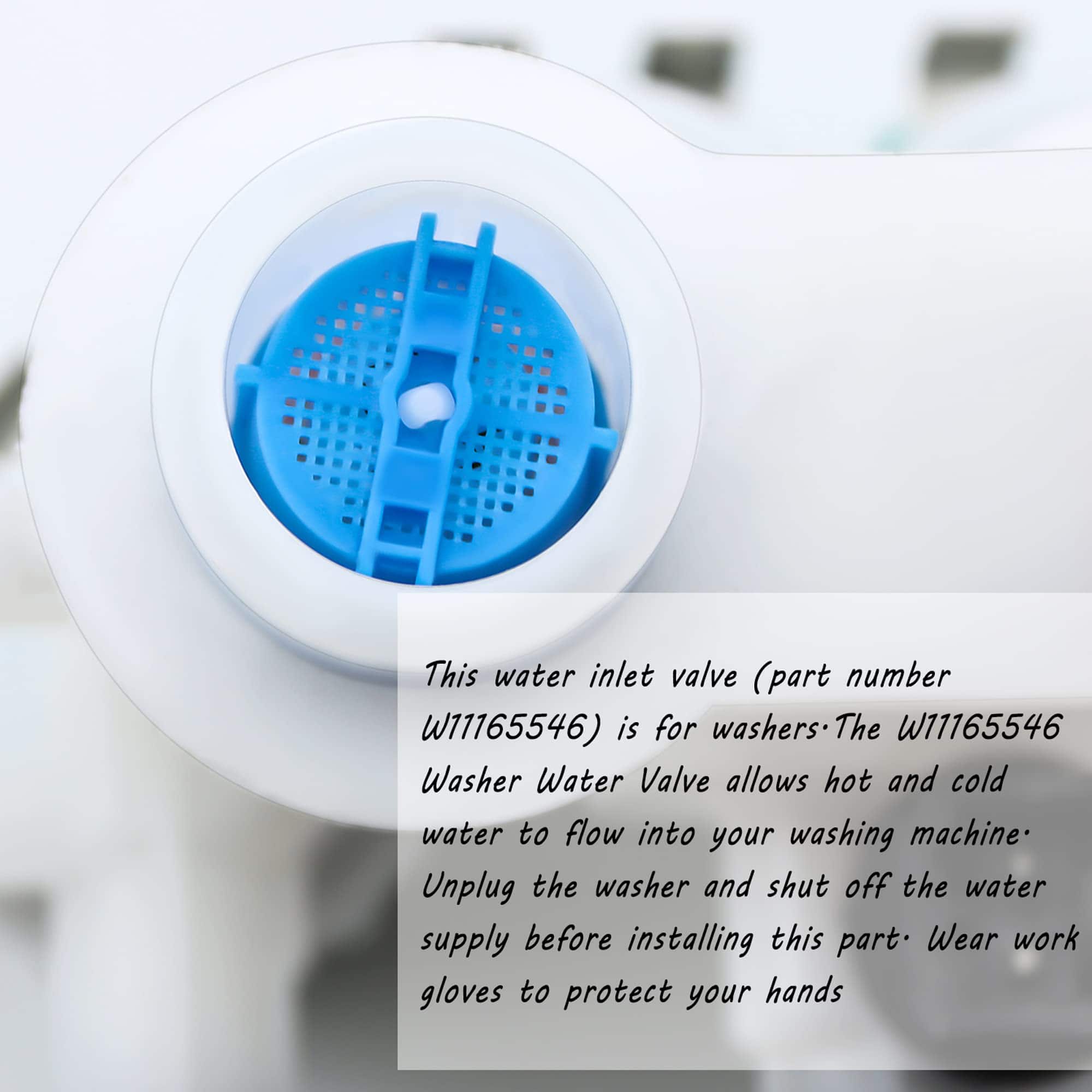 Esta válvula de entrada de agua (número de parte W11165546) es para lavadoras. Controla el flujo de agua hacia la lavadora. Compatible con modelos 7MWTW8500EC0, 7MWTW8500EC1, WTW8500DC0, WTW8500DC1, WTW8500DC2, WTW8500DC3, WTW8500DR0, WTW8500DR1, WTW8500DR2, WTW8500DR3, WTW8500DW0, WTW8500DW1, WTW8500DW2, WTW8500DW3, WTW8700EC0, WTW7500GC0, WTW7500GW0, WTW8700EC1; 110.28132410, 110.28132411, 110.28132412, 110.28132413, 110.28133410, 110.28133411, 110.28133412, 110.28133413, 110.29132410, 110.29132411, 110.29132412, 110.29132413, 110.29133410, 110.29133411, 110.29133412, 110.29133413, etc.