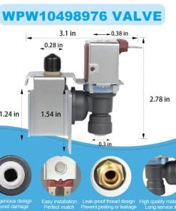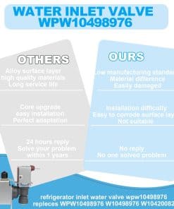 La válvula de entrada de agua W10498976 W10420082 para refrigerador brinda conveniencia a tu vida y puede solucionar los problemas de fabricación de hielo, flujo deficiente y fugas. La válvula WPW10498976 puede hacer hielo perfectamente, garantizar un flujo de agua adecuado, prevenir fugas y asegurar el funcionamiento normal de tu refrigerador. Confía en nosotros, si encuentras algún problema durante el uso de la válvula de entrada de agua para refrigerador wpw10498976 dentro de 1 año, te ayudaremos a resolver el problema dentro de las siguientes 24 horas lo antes posible. Tú nos das confianza, nosotros te damos tranquilidad.