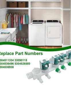 5304511334 Válvula de entrada de agua para reemplazo de lavadora compatible con Frigidaire FFTW4120S FFTW4120SW FFTW4120SW0 FFTW4120SW1. Esta válvula de entrada de agua es el repuesto perfecto para tu lavadora Frigidaire, garantizando un control óptimo del agua durante el ciclo de lavado. Fabricada con materiales de alta calidad como plástico ABS y metal de acero inoxidable, con un revestimiento adicional que previene las filtraciones y protege contra las fugas de agua, prolongando así la vida útil de la válvula. Además, su diseño resistente y duradero la hace menos propensa al desgaste y rotura, asegurando un rendimiento confiable a lo largo del tiempo. Con esta válvula de entrada de agua, podrás solucionar problemas comunes como el suministro anormal de agua, fugas de agua, fallos al llenar o drenar la lavadora, garantizando que el agua fluya de manera constante y adecuada en cada ciclo de lavado. La instalación de la válvula de entrada de agua 5304511334 es muy sencilla y no requiere habilidades especializadas ni herramientas específicas, lo que te permite cambiarla tú mismo y disfrutar de una experiencia de bricolaje conveniente y efectiva. Recupera la funcionalidad óptima de tu lavadora con esta válvula de entrada de agua de alta calidad.