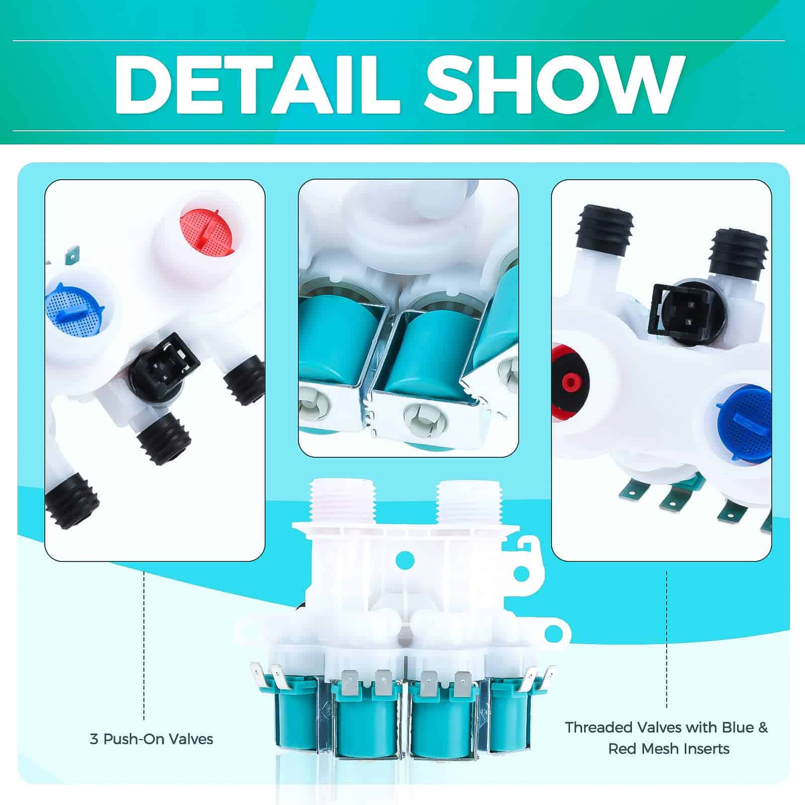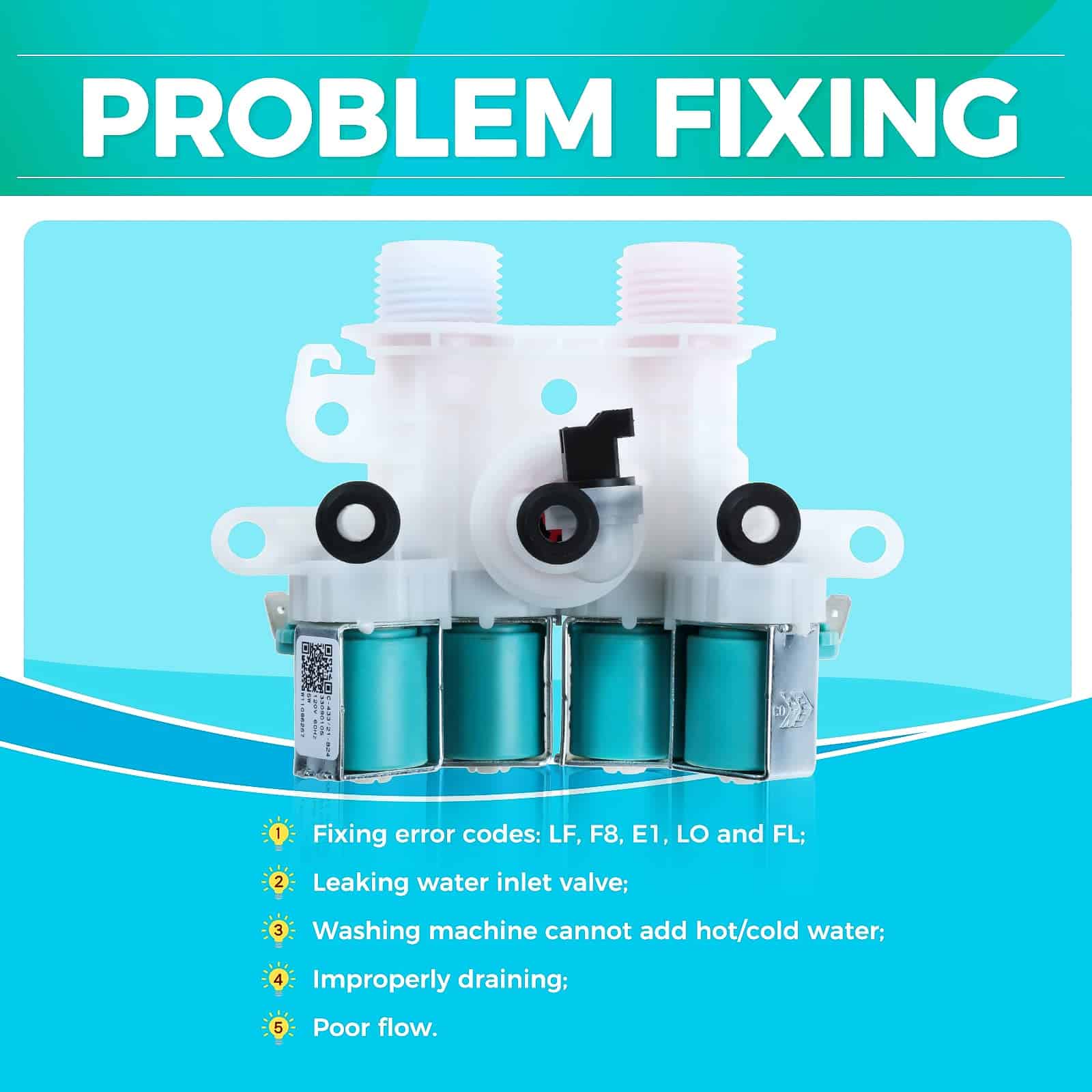Válvula de entrada de agua para lavadora MOOTVGOO W11165546 de reemplazo para lavadora Whirlpool Kenmore Maytag, perfecta para resolver problemas como códigos de error LF, F8, E1, LO y FL, fugas en la válvula de entrada de agua, dificultad para agregar agua caliente o fría, drenaje incorrecto o flujo deficiente. Esta válvula de entrada de agua de reemplazo de alta calidad está fabricada con material premium y ha sido probada por el fabricante para cumplir con los estándares OEM, garantizando una vida útil más larga. Diseñada con dos válvulas roscadas en rojo y azul para conectar las mangueras de agua caliente y fría en la parte trasera de la lavadora respectivamente. Cada puerto está controlado por una válvula solenoide que envía energía eléctrica para abrir y cerrar el flujo de agua caliente y fría según la configuración de la temperatura de lavado y la señal del interruptor de nivel de agua. Esta válvula de entrada de agua es compatible con diversas marcas como Whirlpool, Kenmore, Maytag, Crosley, etc., y reemplaza directamente a los números de parte: 33090105, W10599423, W10758828, W10839828, W11096267, W11165546VP, 4545980, AP6284346, PS12348013, EAP12348013, W11165546, etc. La instalación es extremadamente sencilla, puedes encontrar instrucciones detalladas en YouTube. Recuerda desconectar la fuente de alimentación y el suministro de agua antes de instalar. ¡Si tienes alguna pregunta, no dudes en contactarnos!