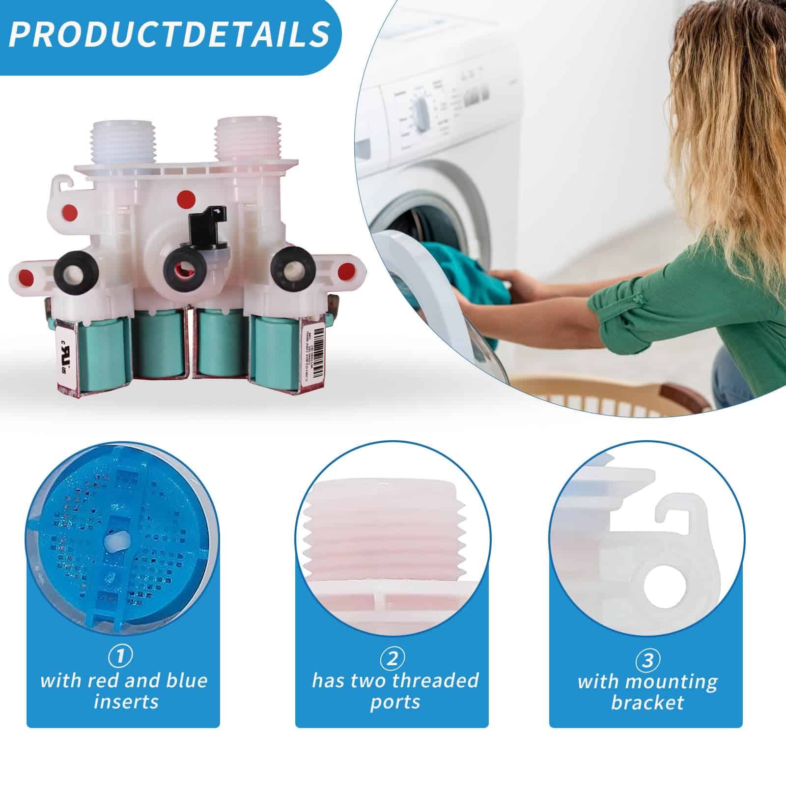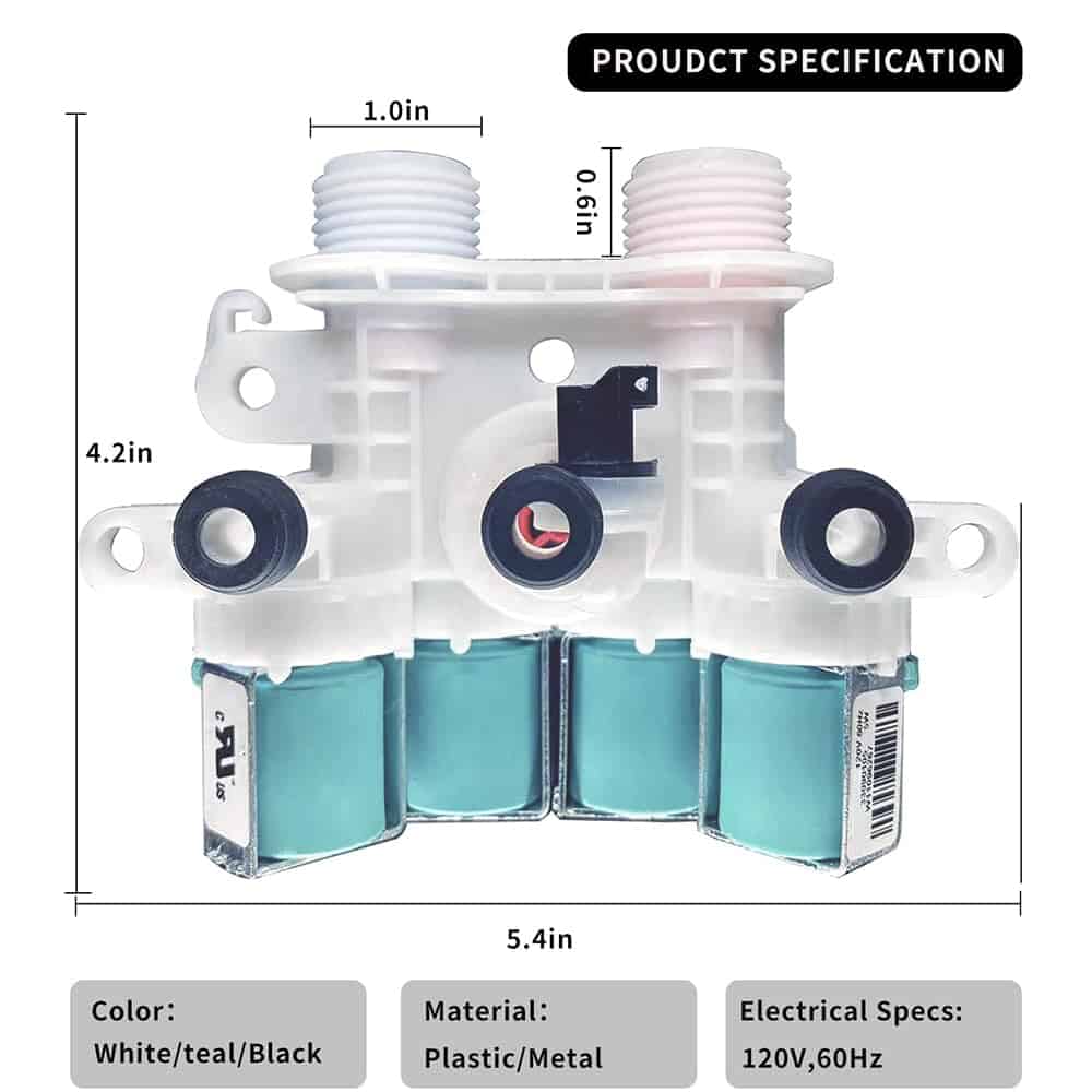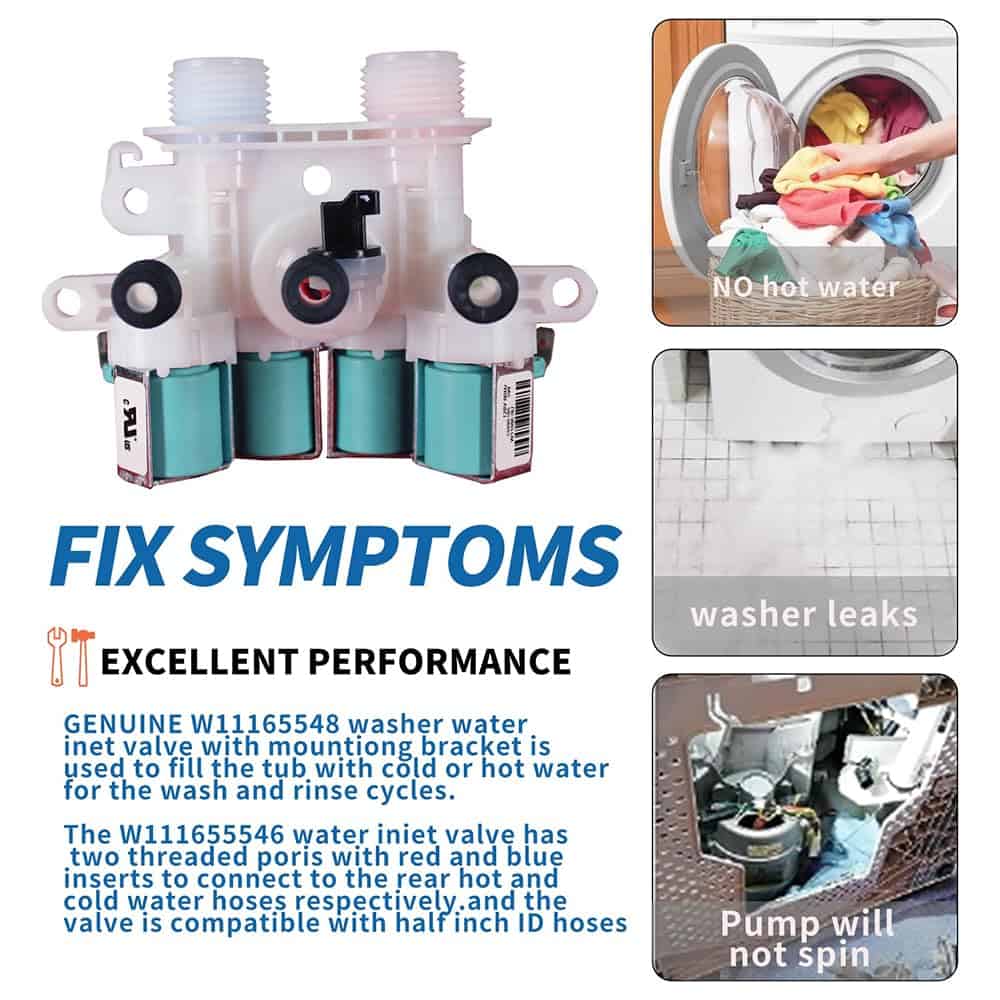 PRODUCT FUNCTION The W11165546 water inlet valve has two threaded ports that connect to the hot and cold water hoses at the rear of the washing machine. Each port is controlled by a solenoid valve that sends out electricity to turn the hot and cold water flow on and off according to the wash temperature setting and the signal from the water level switch. WIDELY COMPATIBLE It is made exactly fit for most top name brands (Whirlpool, Kenmore, Crosley) Directly replace 33090105, W10599423, W10758828, W10839828, W11096267, W11165546VP, 4545980, AP6284346, PS12348013, EAP12348013,W11165546 For more matching models, please see the description or consult us. EASY DIY FIX It�s an easy repair if you follow along with a repair video. Helpful tools include /4″ driver, heavy putty knife, channel locks. , and work gloves Fix the problem Low Fill error. getting a LF F8, E1, LO and FL code Leak from the inlet valve hot/cold water not being accepted into Washer;cannot run or is washed at the wrong water temperature.