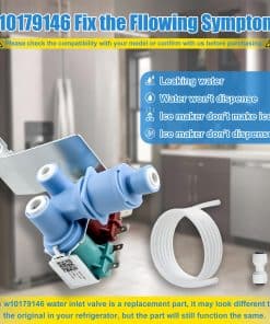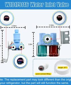 Esta válvula de entrada de agua W10179146 es un repuesto para refrigeradores whirlpool. Aunque puede tener un aspecto diferente al original de su refrigerador, la función será la misma. Viene con una línea de suministro de agua de 5FT y una conexión rápida de 1/4��. No es compatible con W10408179 y algunos modelos de refrigeradores. Se suministra agua al fabricante de hielo y al dispensador de agua del refrigerador y resuelve el problema de que una válvula de entrada de agua obstruida o dañada puede impedir que el fabricante de hielo funcione correctamente. Compatible con varios modelos de refrigeradores de marcas como whirlpool, kenmore, maytag, amana, kitchen aid e ikea. Ofrecemos un año de garantía, si hay algún problema de calidad, le enviaremos una válvula nueva W10179146 o le reembolsaremos.