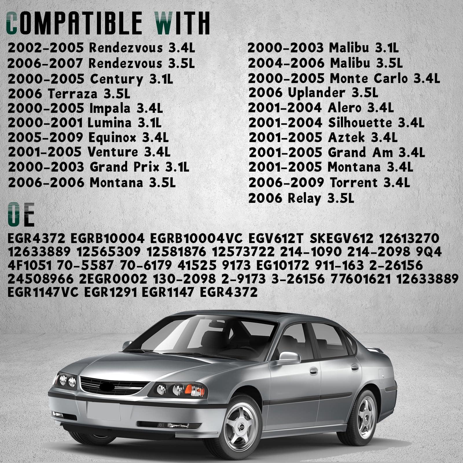 Compatible con Buick Chevy Century Terraza Equinox Malibu Venture. Por favor, asegúrese del ajuste correcto para su vehículo específico. EGR4372 EGRB10004 EGRB10004VC EGV612T SKEGV612 12613270 12633889 12565309 12581876 12573722 214-1090 214-2098 9Q4 4F1051 70-5587 70-6179 41525 9173 EG10172 911-163 2-26156 24508966 2EGR0002 130-2098 2-9173 3-26156 77601621 12633889 EGR1147VC EGR1291 EGR1147 EGR4372. Hecho de material premium con pruebas de calidad exhaustivas para garantizar su funcionamiento libre de problemas. Esta válvula EGR ayudará a restaurar la eficiencia del sistema de control de emisiones de su vehículo y reducirá la carga del motor, mejorando efectivamente la eficiencia de trabajo del motor y reduciendo los golpes para prolongar la vida útil de los componentes relacionados. Si compra un tipo incorrecto para su vehículo, por favor, no dañe la etiqueta y el código de barras, devuélvalo en el paquete original. Si ya lo ha instalado, por favor, límpielo y colóquelo en el paquete original para poder volver a venderlo. ¡GRACIAS!