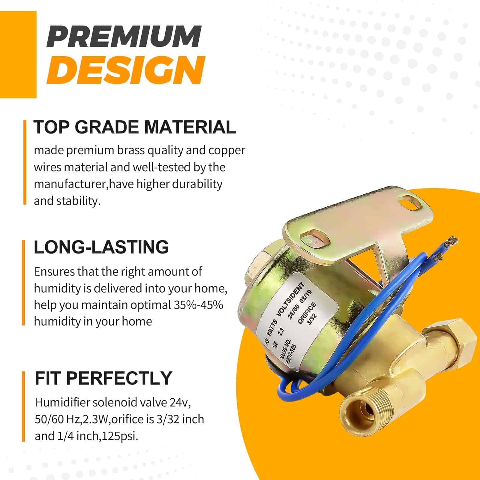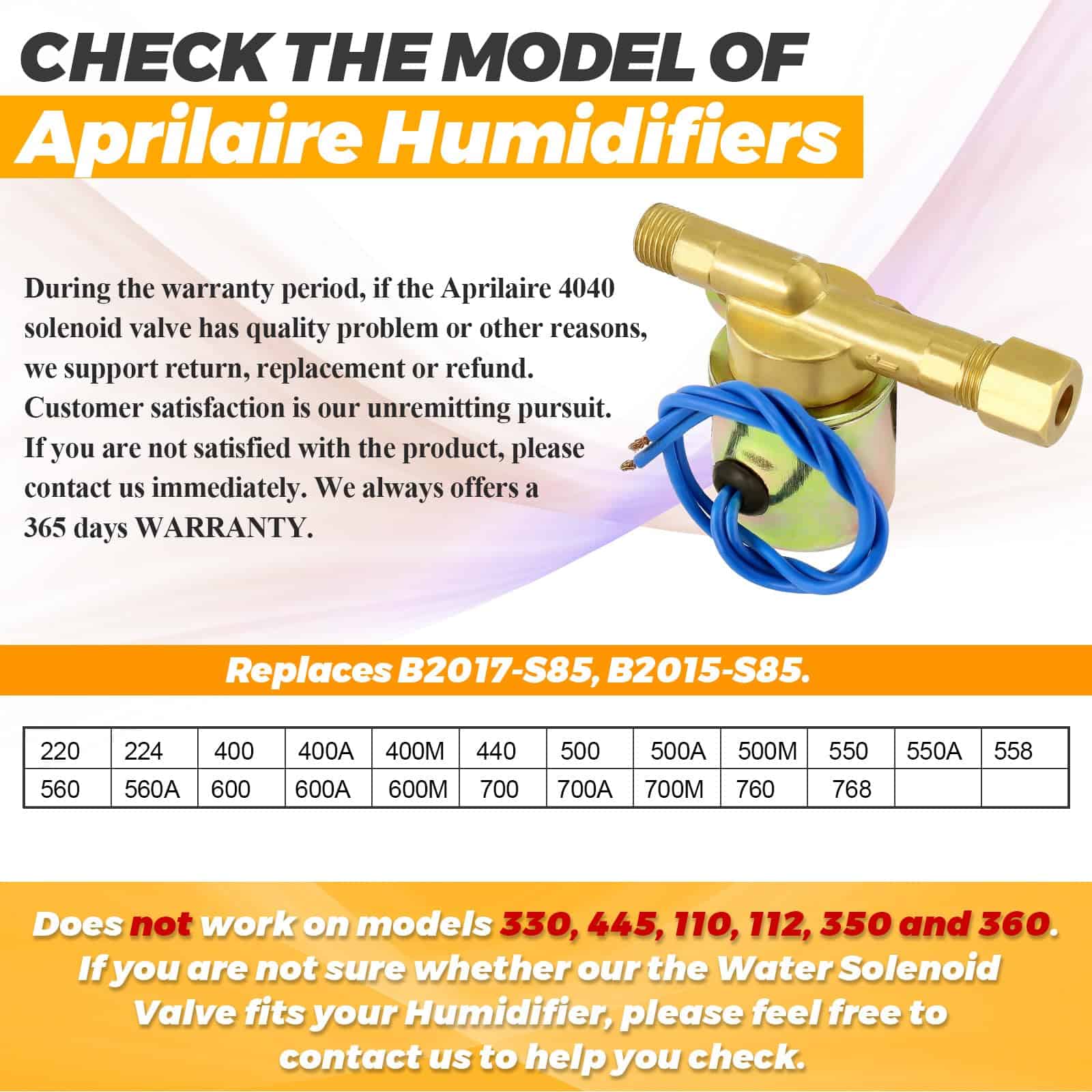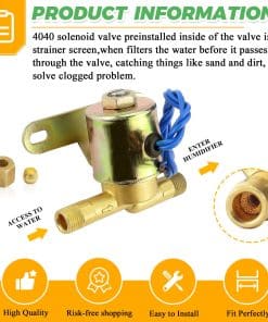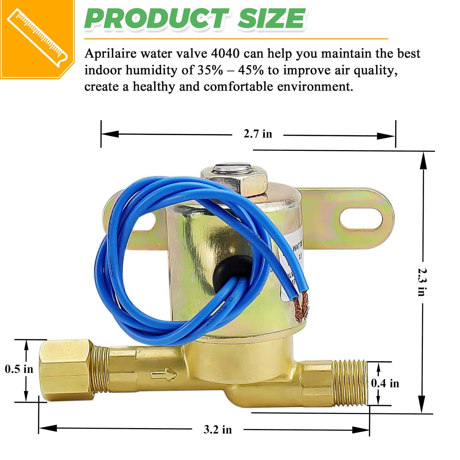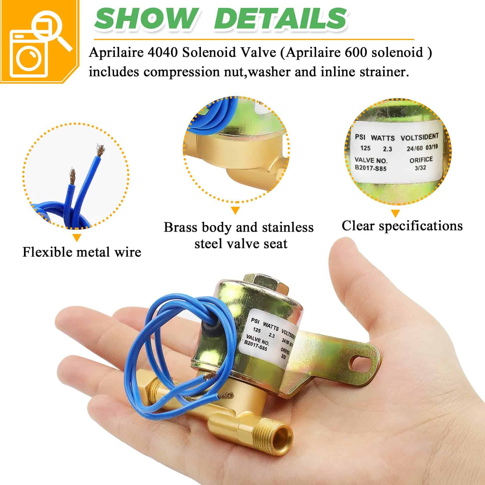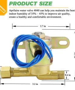 La Válvula de Solenoide de Agua para Humidificador 4040 reemplazo incluye tuerca de compresión, arandela y filtro en línea. La válvula solenoide 4040 está roscada 7/16″-24 UNS para aceptar un ajuste de compresión para «tubing. La válvula de humificador 4040 está hecha de cuerpo de latón y asiento de acero inoxidable, rigurosamente inspeccionada y probada por el proveedor para durabilidad y larga vida útil. Compatible con Humidificador A-prilaire. Reemplaza: B2017-S85, B2015-S85, 220, 224, 400, 400A, 400M, 440, 500, 500A, 500M, 550, 550A, 558, 560, 560A, 600, 600A, 600M, 700, 700A, 700M, 760, y 768.