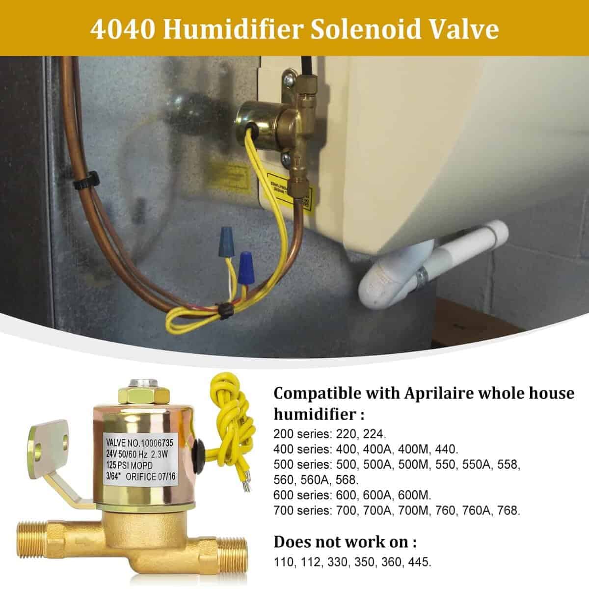 2. Compatible con El solenoide del humidificador es compatible con Aprilaire 220, 400, 440, 500, 550, 560, 600, 700 Lennox HCWB3-17, HCWB3-12, HCWP2-18, WB2-17 Carrier HUMXXLFP1518, etc. humidificadores.