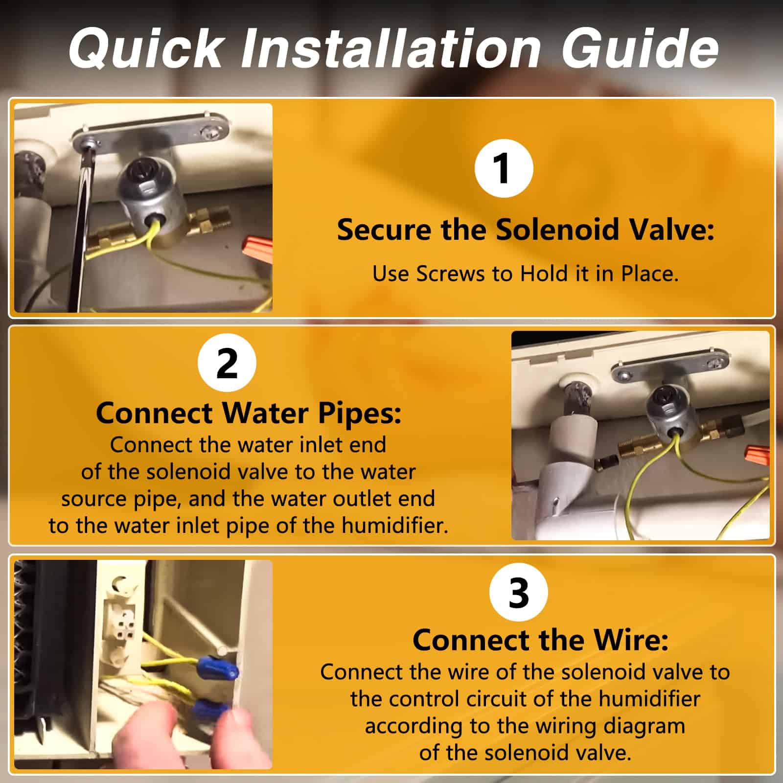 4. Fácil instalación: Esta válvula solenoide de agua para humidificador está fabricada para cumplir con las especificaciones de ajuste, forma y función. Para instalar una válvula solenoide de agua para humidificador, primero cierre el suministro de agua y energía. Retire la válvula vieja (si la está reemplazando) y limpie los extremos de la tubería. Envuelva cinta de sellado de rosca alrededor de los puertos de la válvula, luego conéctela a la línea de agua y al humidificador, apretando con una llave. Asegure la válvula si es necesario, conéctela según el diagrama, y restaure el agua y la energía. Finalmente, pruebe las fugas y asegúrese de que funcione correctamente.