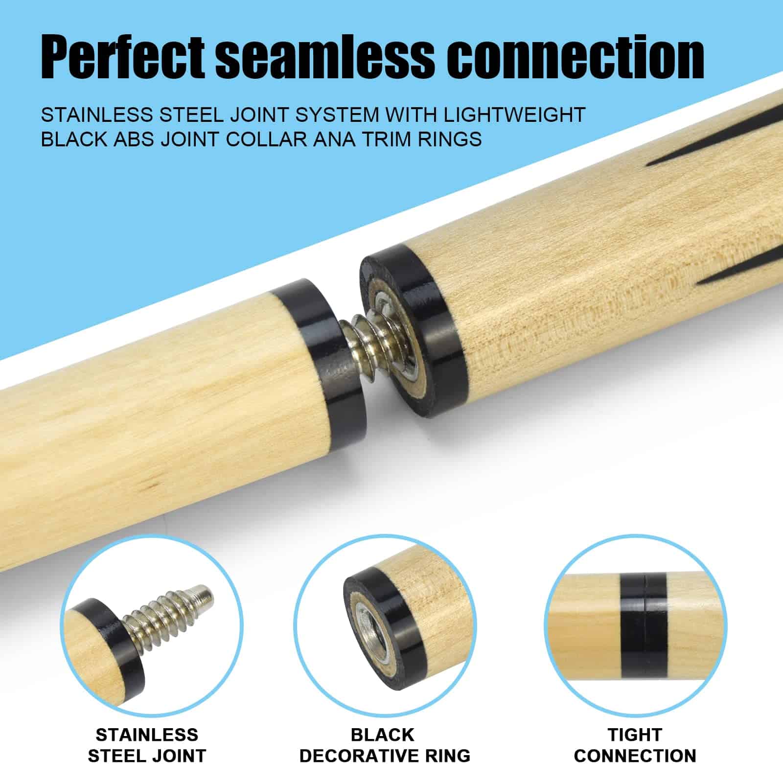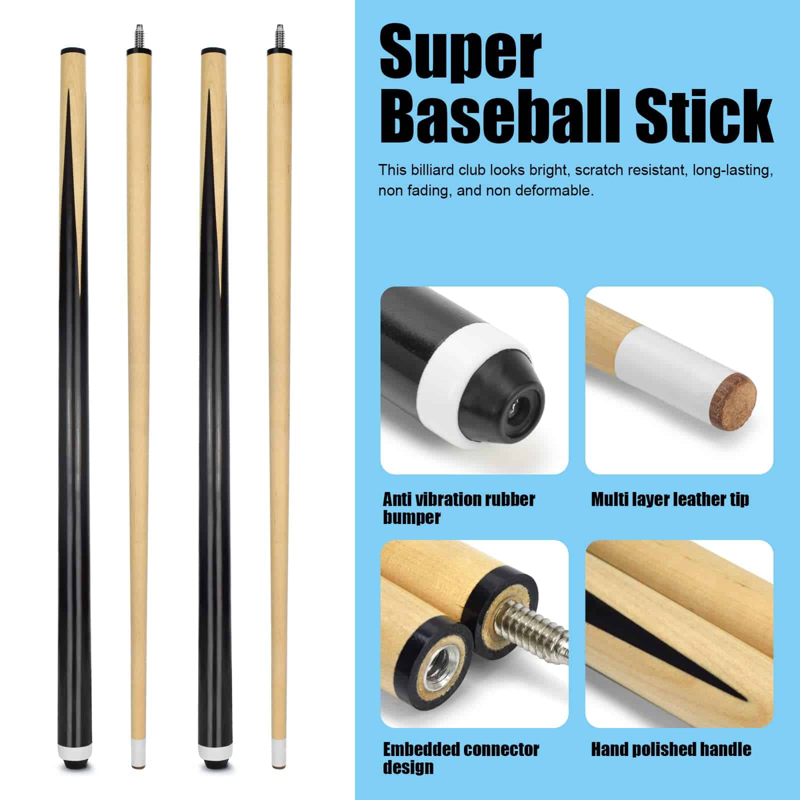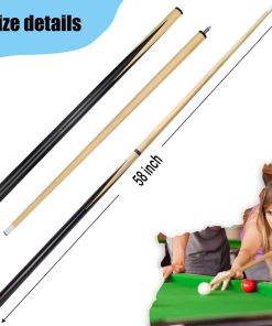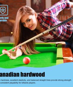 VANLAN Billiard House Cue Sticks Pool Cues 2-Piece 58 Inches Billiard Tips 13mm House Bar Billiard Cue Sticks Hardwood Cues Set of 2. Este palo de billar económico está hecho de material de madera de alta calidad, con una estructura estable que no se rompe ni se deforma fácilmente. Diámetro de la punta de pegamento: 13 mm. Con una longitud de 58 pulgadas, este palo de billar es adecuado para recreación familiar y de negocios, juegos deportivos, y clubes de billar. Tanto niños como adultos pueden usarlo. La unión central de dos piezas facilita su almacenamiento y la tapa final de goma lo protege en todo momento. Este palo de billar de madera de alta calidad ofrece una buena elasticidad, una sensación cómoda, un buen agarre, una transmisión de fuerza estable, y puede estar más preparado para golpear la pelota. Ligero y elegante, con una estructura de club de 3/4 dividido, interfaz roscada y conexión sin costuras. Esto hace que la fuerza de transmisión sea más estable y mejora la precisión de los golpes.