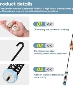 Marca: M Motico Condición: 100% Nuevo Paquete Incluye: 4 x Varilla de suspensión para lavadora W10780044 4 x bolas de suspensión 4 x carcasa de bolas de suspensión Números de Repuesto: W11131256, W11226774, 4282745, AP5970744, PS11703287, EAP11703287, W10555289, W10555290, W10645657, W10748954, W10780044, W10821954, W11025360 Funciona para Marcas: Whirlpool, Maytag, Kenmore, Amana, Crosley, Inglis, Admiral Contáctenos Si no está seguro de si la pieza es correcta, pregúntenos en la sección de Preguntas y respuestas para clientes o contáctenos por correo electrónico. Escena Aplicable: Las varillas de suspensión ayudan a amortiguar el movimiento de la tina de lavado. Si una o más varillas de suspensión están rotas, la lavadora vibrará o se sacudirá. Si la lavadora se desequilibra y se sacude con cada carga, este kit puede solucionar el problema. El papel de la varilla de suspensión: Las varillas de suspensión para lavadora W10780044 soportan la tina de lavado y la mantienen estable durante las cargas desequilibradas. Actúan como amortiguadores que permiten que la tina de lavado se mueva mientras ayudan a minimizar la vibración en el modo de centrifugado. Corrige el error de carga desequilibrada «uL» en la máquina.
